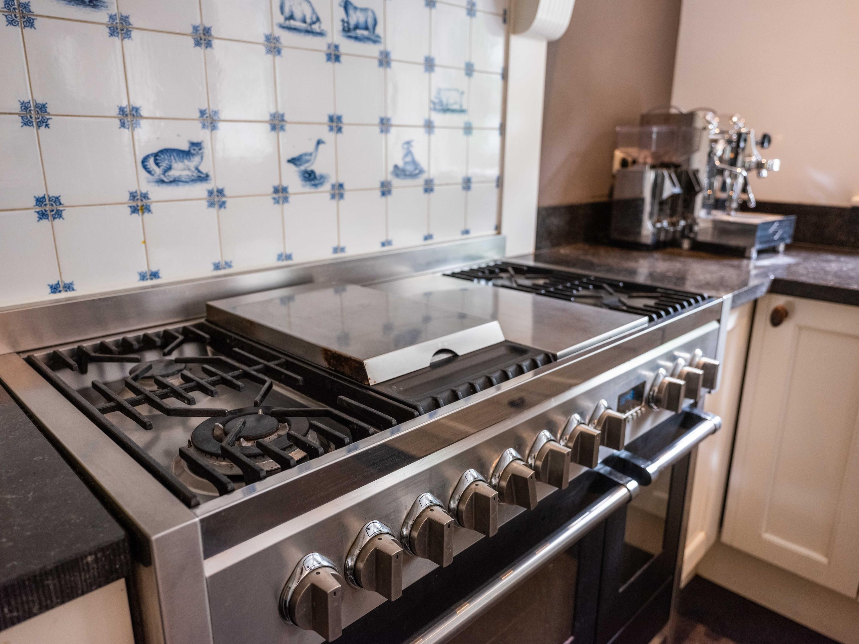 On entry, the tumbled Italian farm tiles and abundant light from the long windows establish a mood of ease and permanence. The 18-metre living room shifts quietly from living to working, anchored by a wood-burning stove. A country-style open kitchen forms the heart of the home, connected to utility spaces and a pantry, leading naturally to terraces and the landscaped garden. The principal suite, together with three additional ground floor bedrooms, is supported by bathrooms with understated finishes. The separate apartment with private access extends privacy for guests.