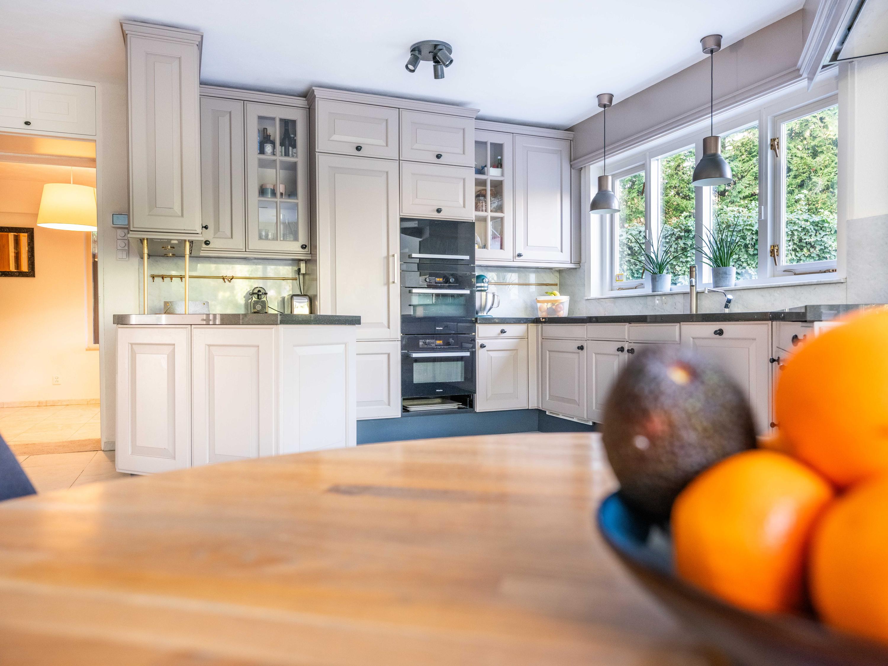 Entering the hall, one moves past the staircase and cloakroom into a kitchen designed for culinary ambition, equipped with a five-burner induction hob, quooker, steamer, and two combi ovens. Sunlight fills the living room, which features a fireplace and sliding doors leading to a terrace that faces the carefully enclosed garden. On the same level, an adaptable office and laundry area connect directly to the outdoors, inviting a seamless flow between work, leisure, and the privacy of home.
