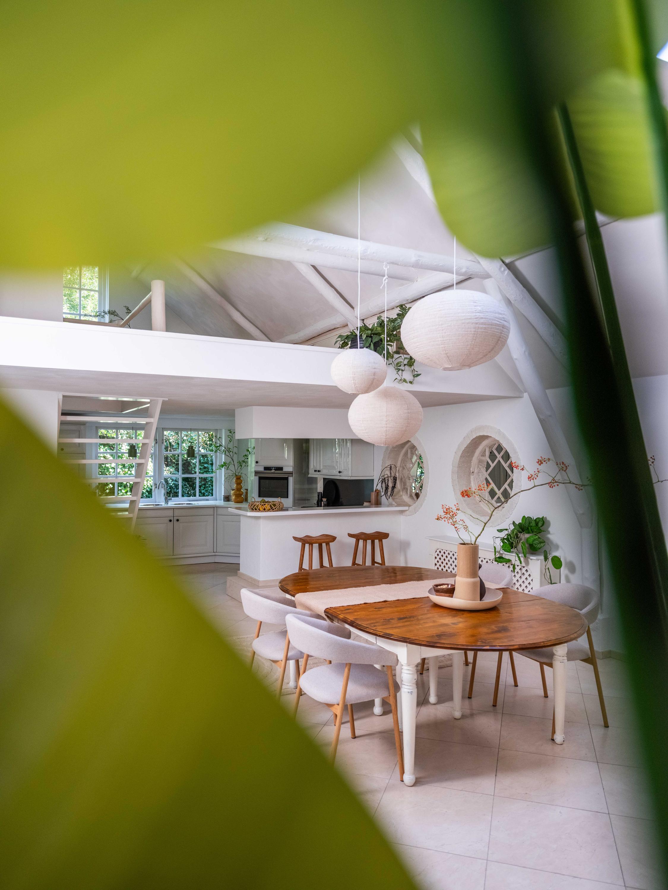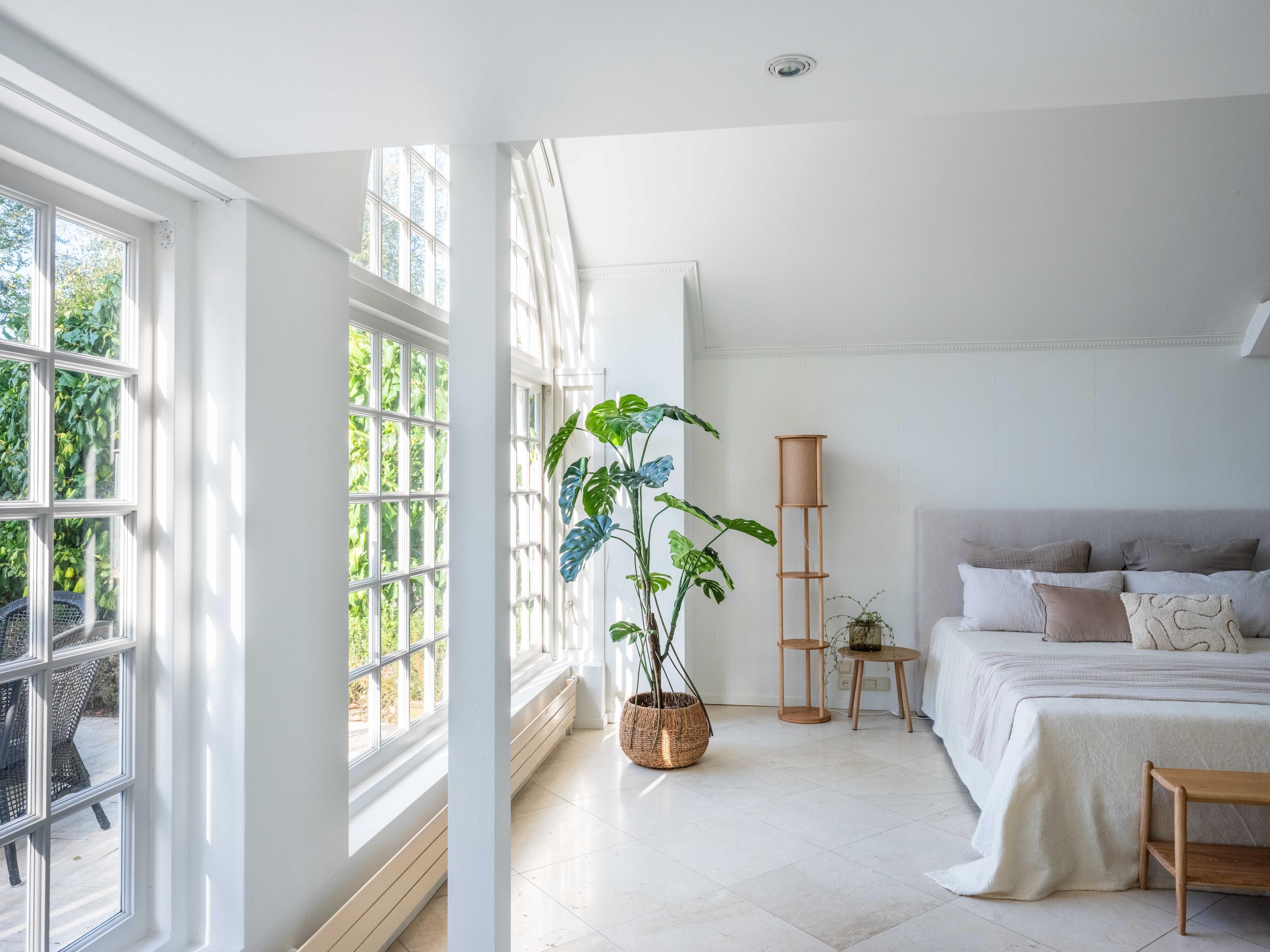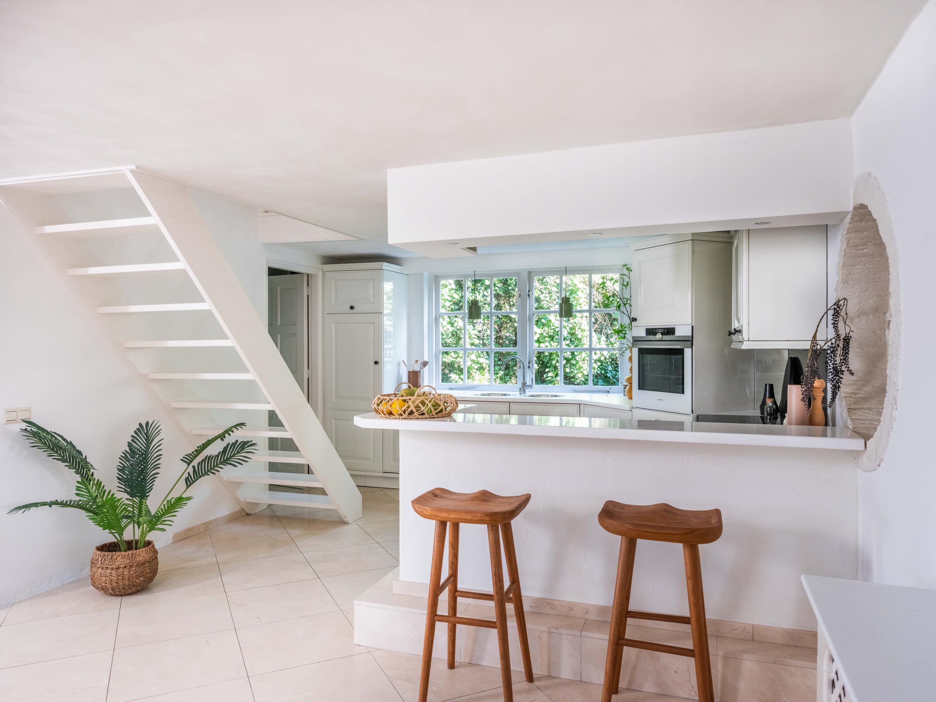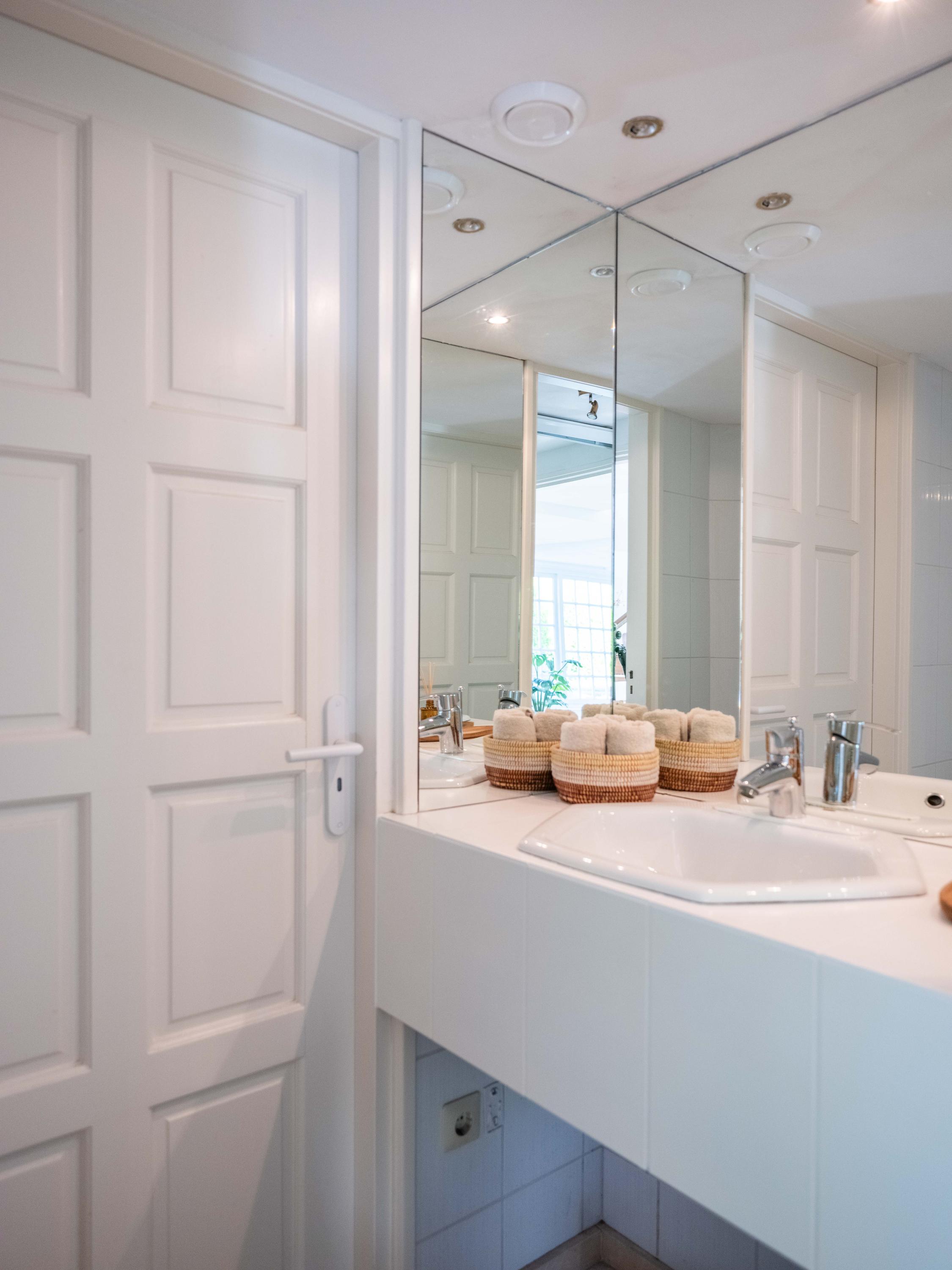 On the second floor, we walk across the loft to the bedroom. This room has closets and provides access to a spacious roof terrace. From the terrace again a great view. The bathroom on this floor is surprisingly spacious and modern (2018). This bathroom has a bathtub, walk-in shower, double sink and toilet.