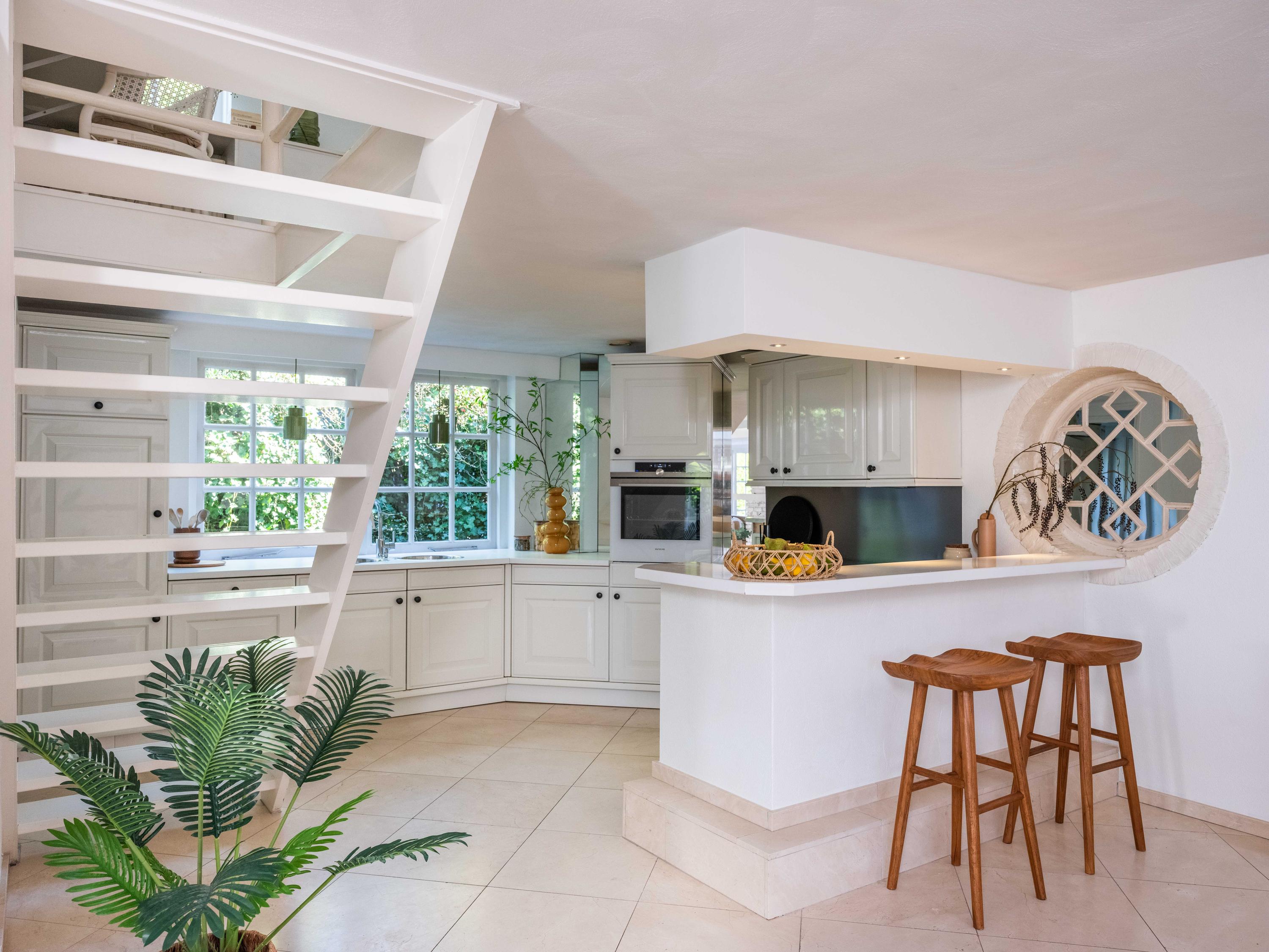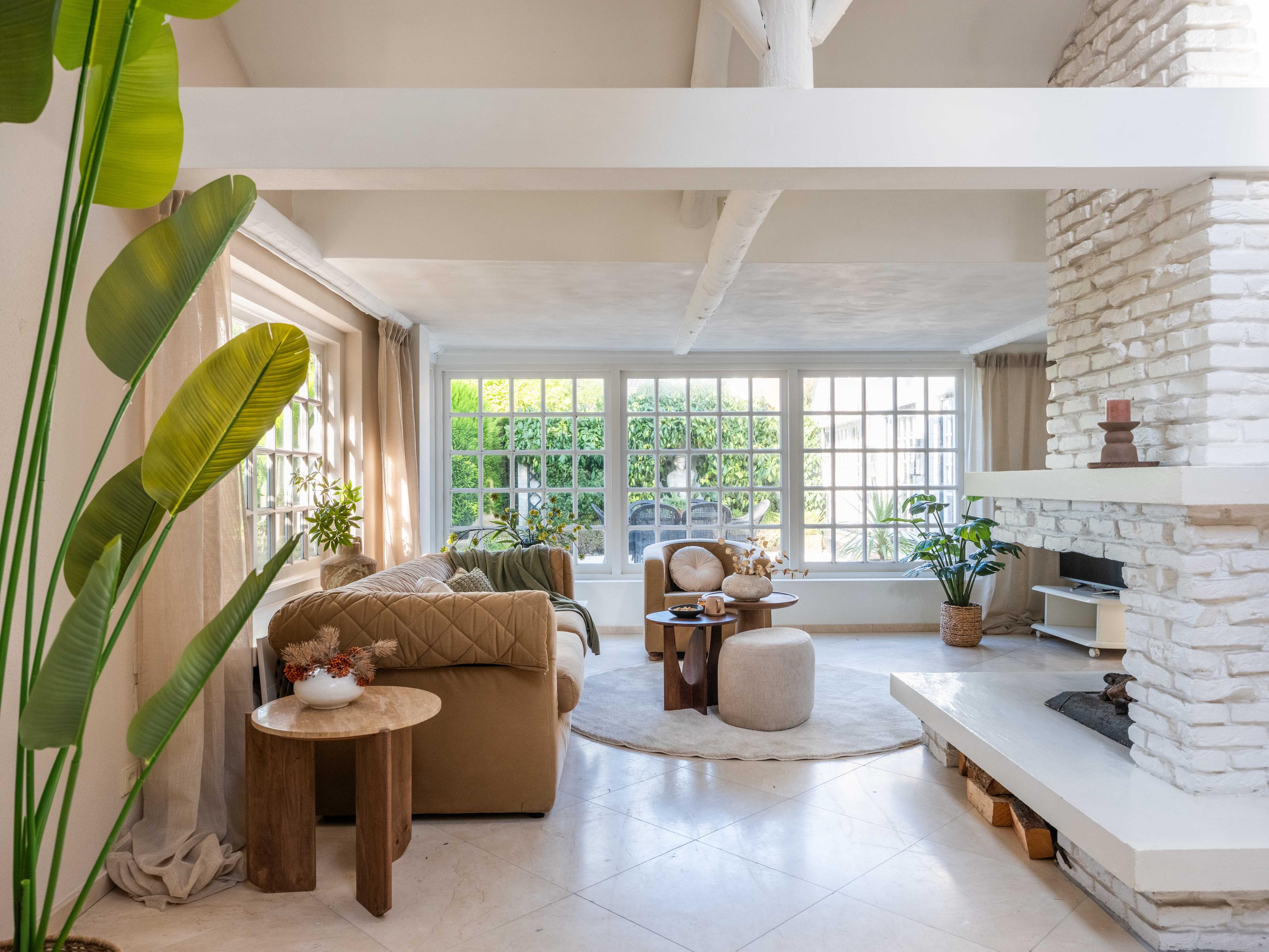 The spacious living room has a cozy gas fireplace (formerly fireplace) in the center of the room. The room is cozy with many authentic details. Think of the wooden beams in sight, a high ceiling up to the ridge and round stained-glass windows. At the back left we find the open kitchen with built-in appliances. From the kitchen we enter the utility room with the connection for the washer and dryer, the central heating system and a door to the outside.