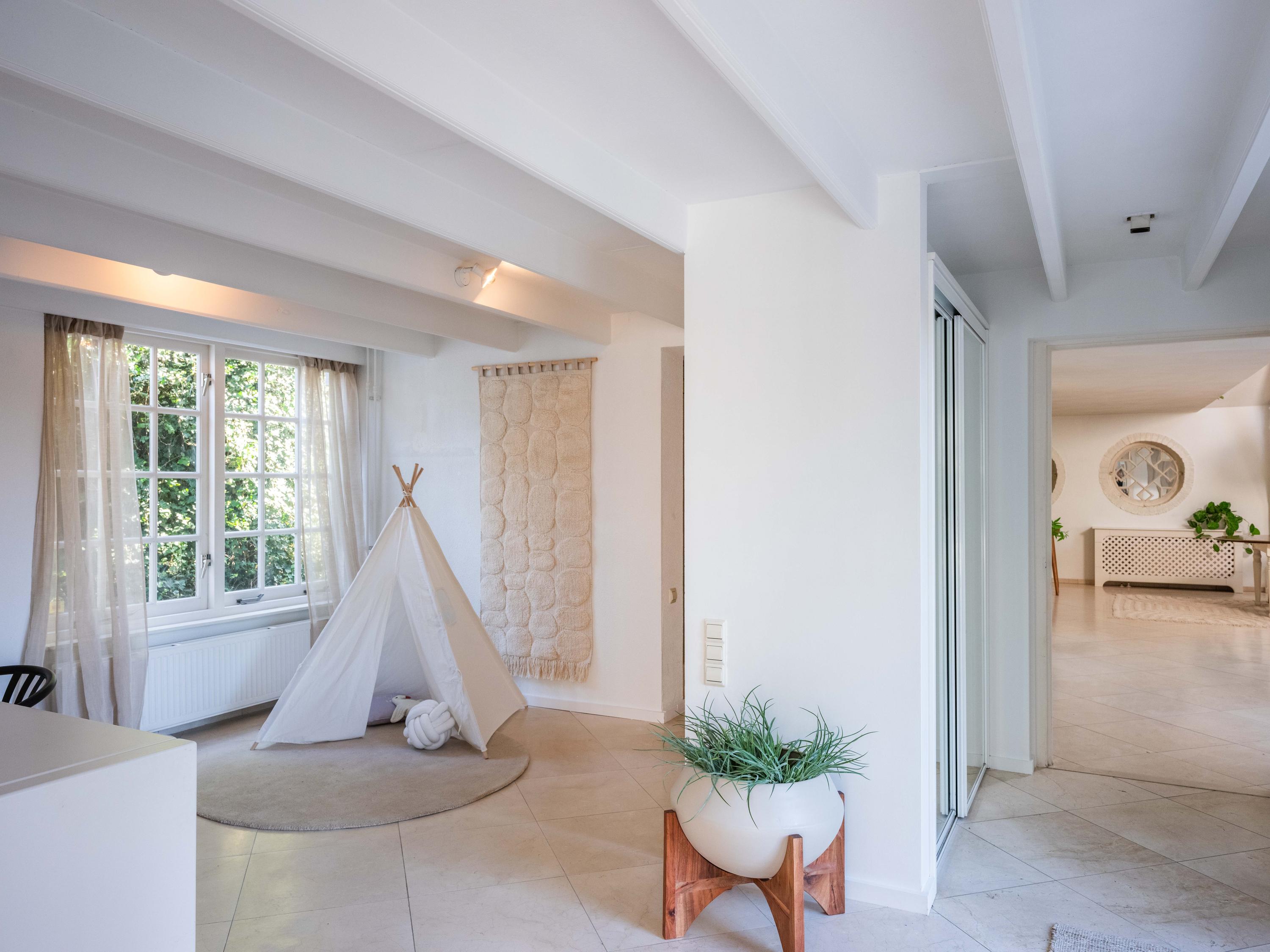 The deep front garden, brings us to the entrance of the house. Upon entering we enter the hall with immediately to the left a bedroom with private bathroom (ground floor living is thus possible here). The bathroom is equipped with a walk-in shower, sink, toilet and urinal. Back in the hall we find behind a wall a room that is now used as an office/guest room. Here is also located the toilet and an additional shower stall.