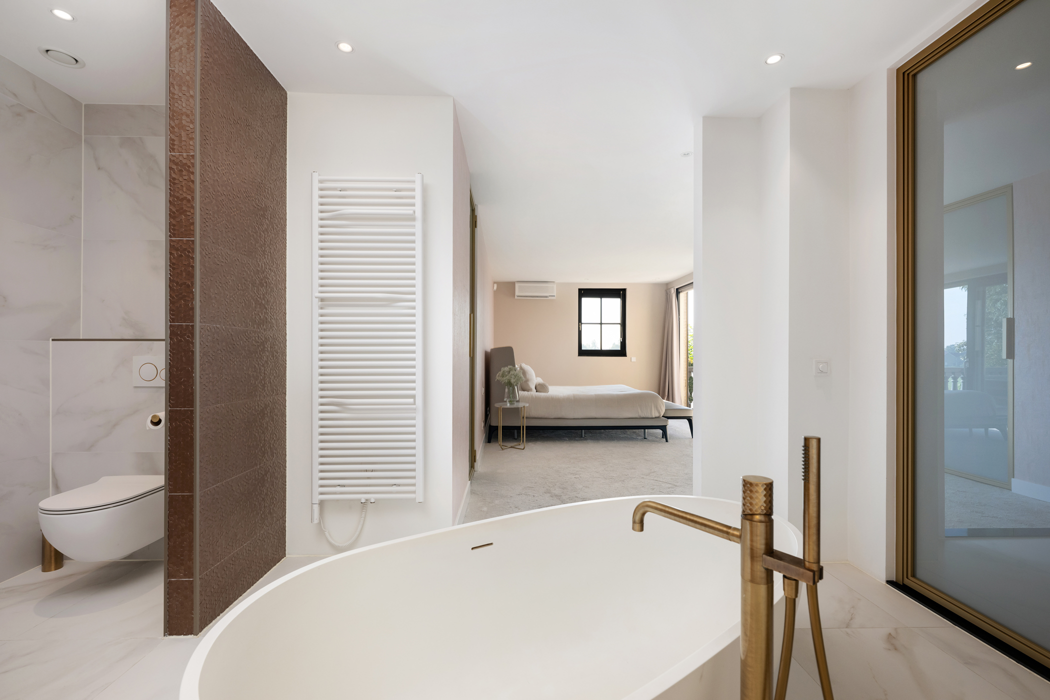 The master bedroom on the ground floor features a modern ensuite bathroom with bathtub, double washbasin, shower, and toilet. The bedroom is equipped with air conditioning, carpet flooring, and a walk-in closet, and also provides direct access to the terrace through sliding doors.