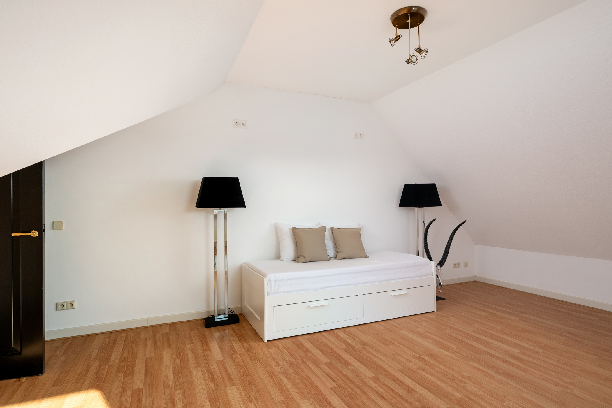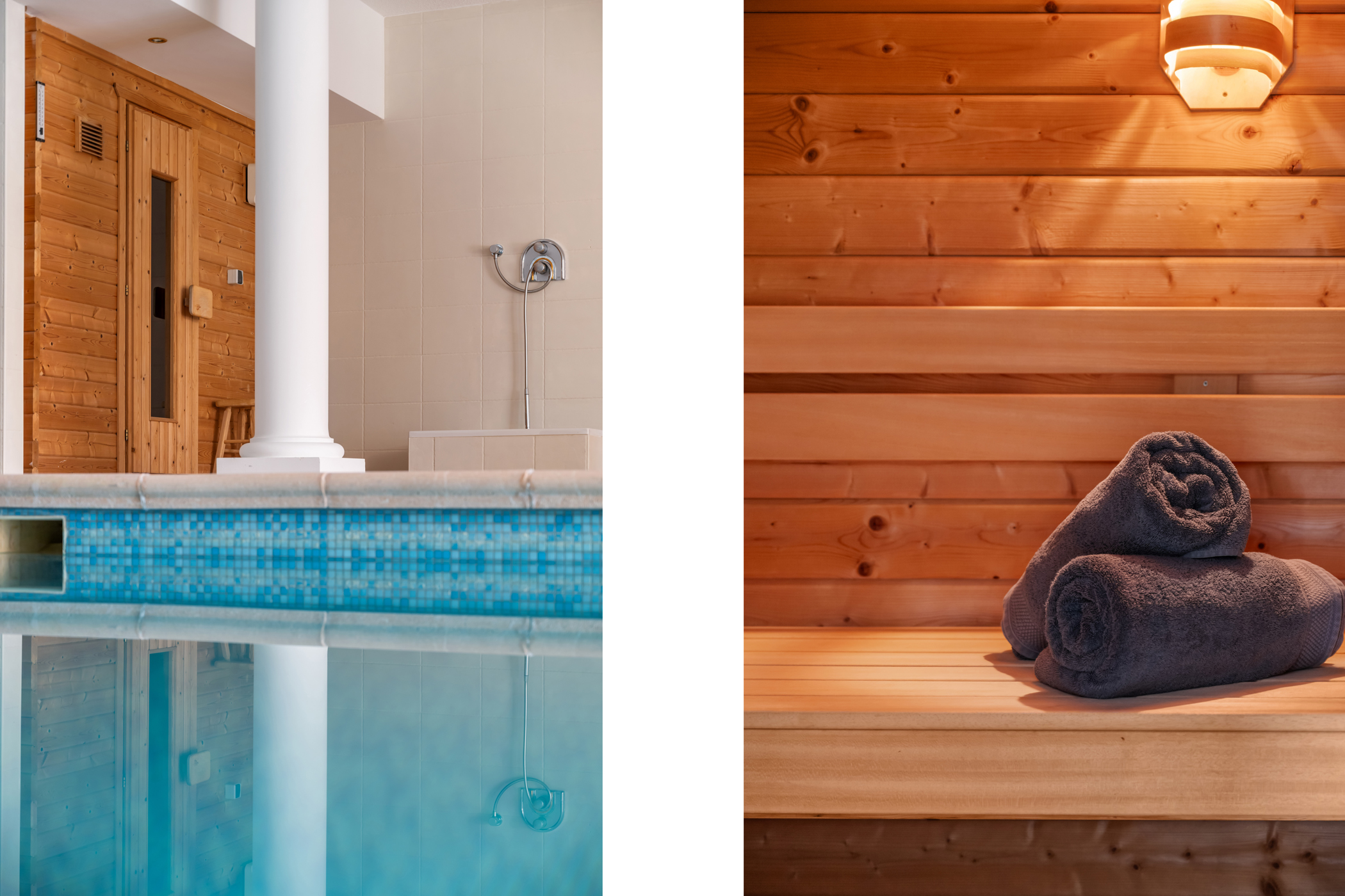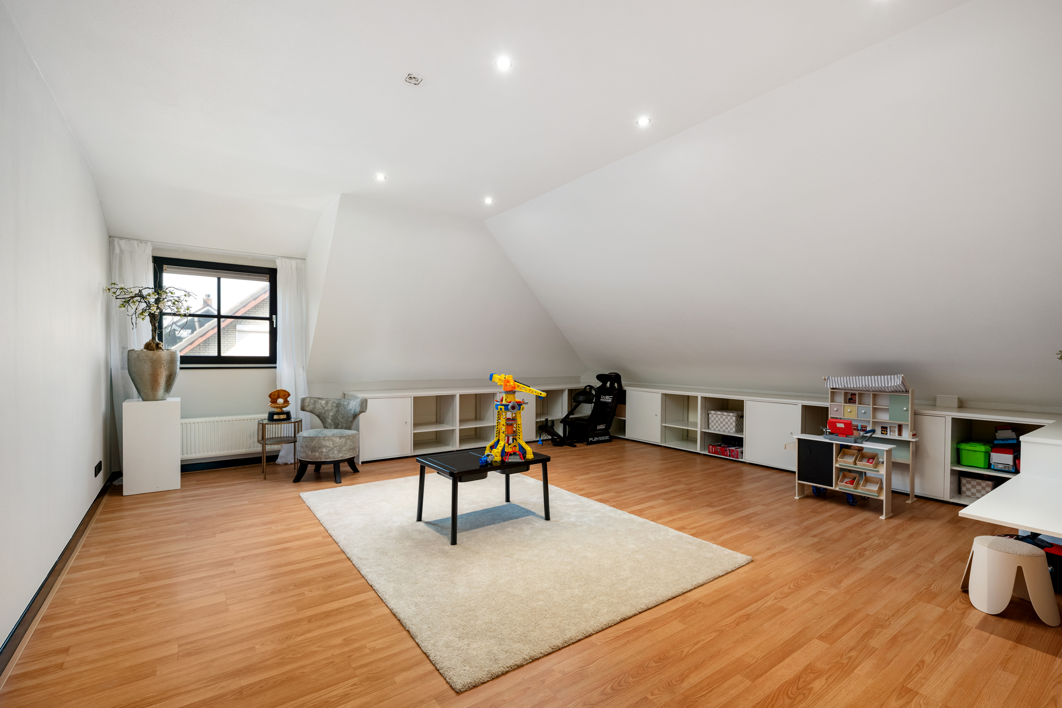 Through French doors, you enter the wellness area, which includes a technical room, pantry, sauna, toilet, and a luxurious indoor swimming pool. Sliding doors from the wellness area lead to the rear garden and the detached garage, which has a hobby greenhouse attached to the back.