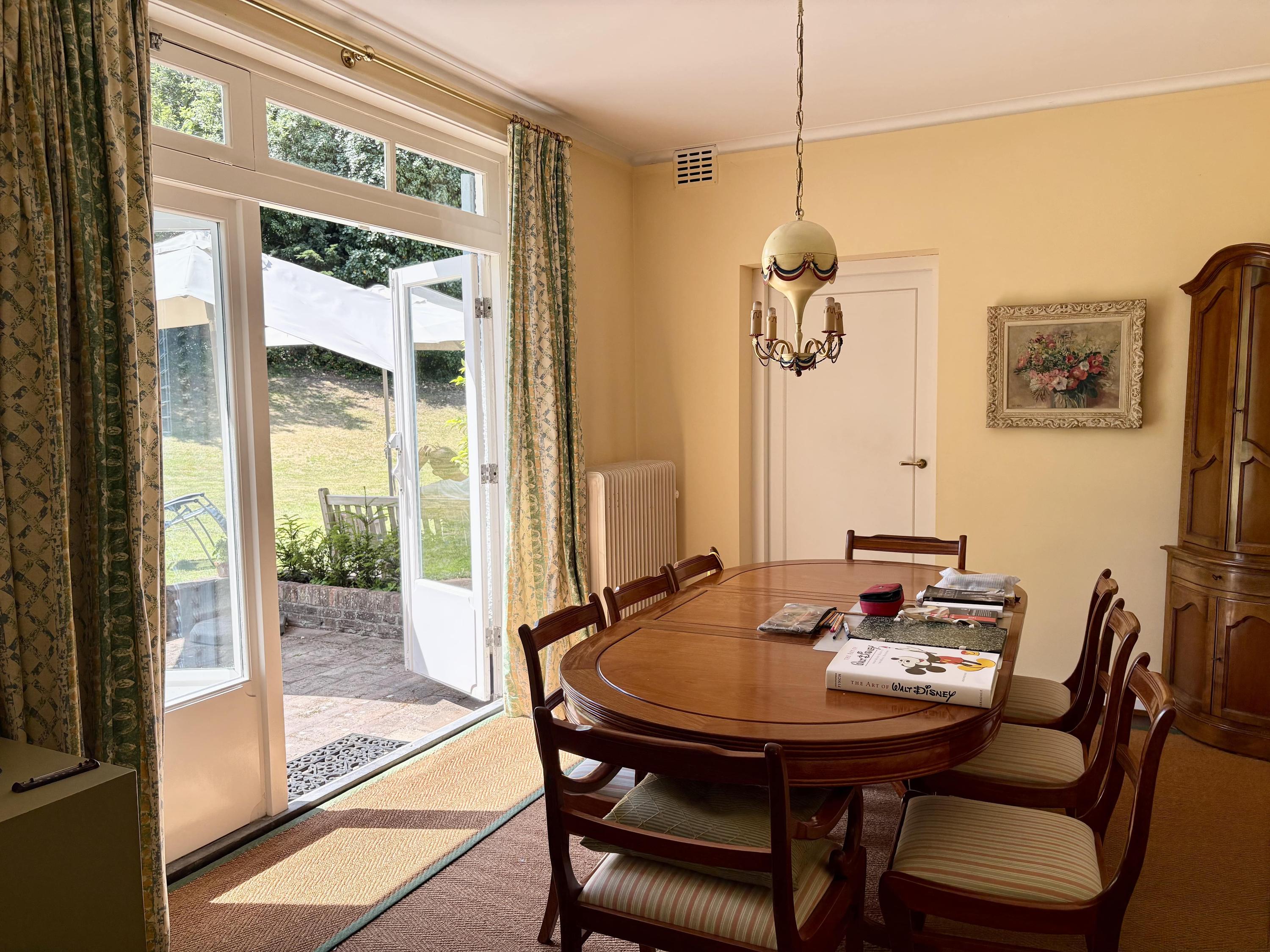 Original part: entrance, welcoming hallway with Piet Jonker tiled floor, passageway to separate cloakroom and WC with hand basin. Light and airy living room overlooking the beautiful garden fitted with a fireplace, parquet floor, custom-made bookcase and French doors to the garden. The living room has an open-plan connection to the dining room with a study that adjoins it. The hallway leads to the basement and garage, as well as three bedrooms and a second bathroom. The master bedroom comes with an en suite bathroom with a bathtub, a double vanity unit and underfloor heating, plus walk-in wardrobe and French doors that open onto a balcony and garden.