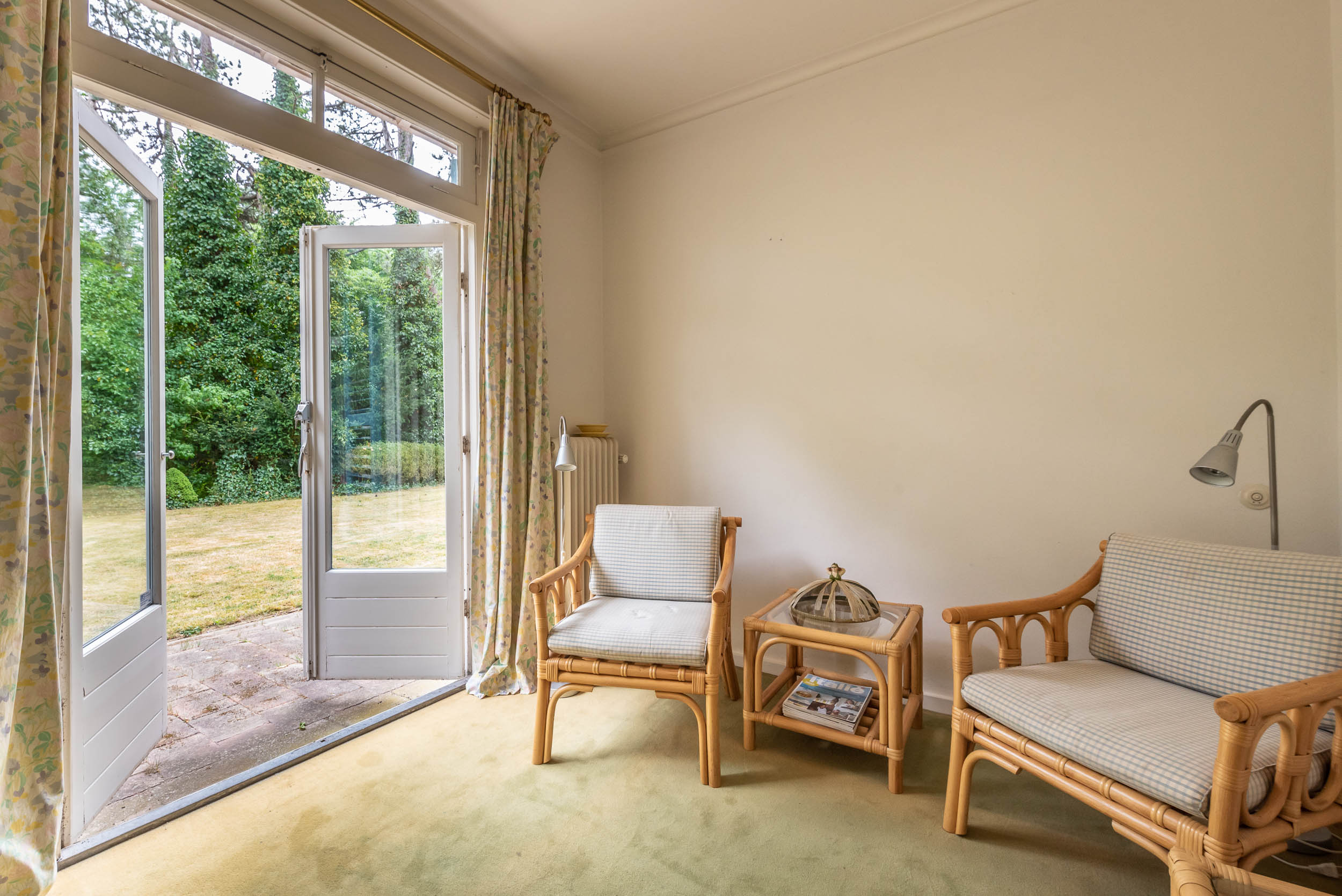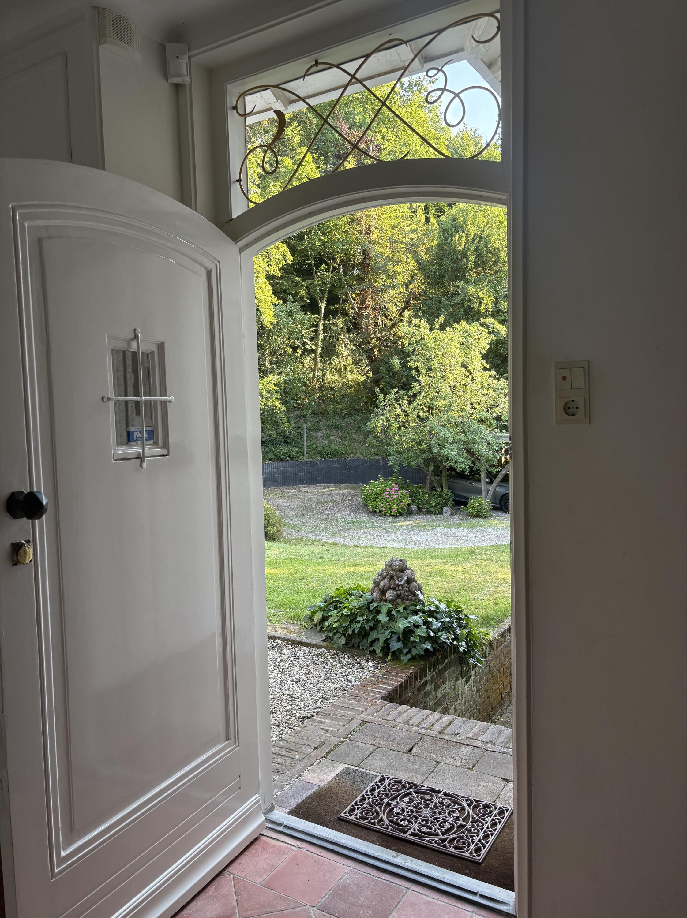 The villa exudes a Mediterranean feel with its light blue Louvre shutters, hipped roof and French tiles in the hallway. Set on a sunny plot spanning no less than 4420 m², it is surrounded by beautiful trees. The generously-sized driveway leads to the double carport with round point. There is ample parking space for several cars, as well as an indoor garage. The property has a comfortable and welcoming layout, with rooms that are nicely sized. Most of the rooms open onto the garden through French doors, which is unexpected because of the varied nature of the plot. The original architecture was reflected in an extension that was built in 2001.