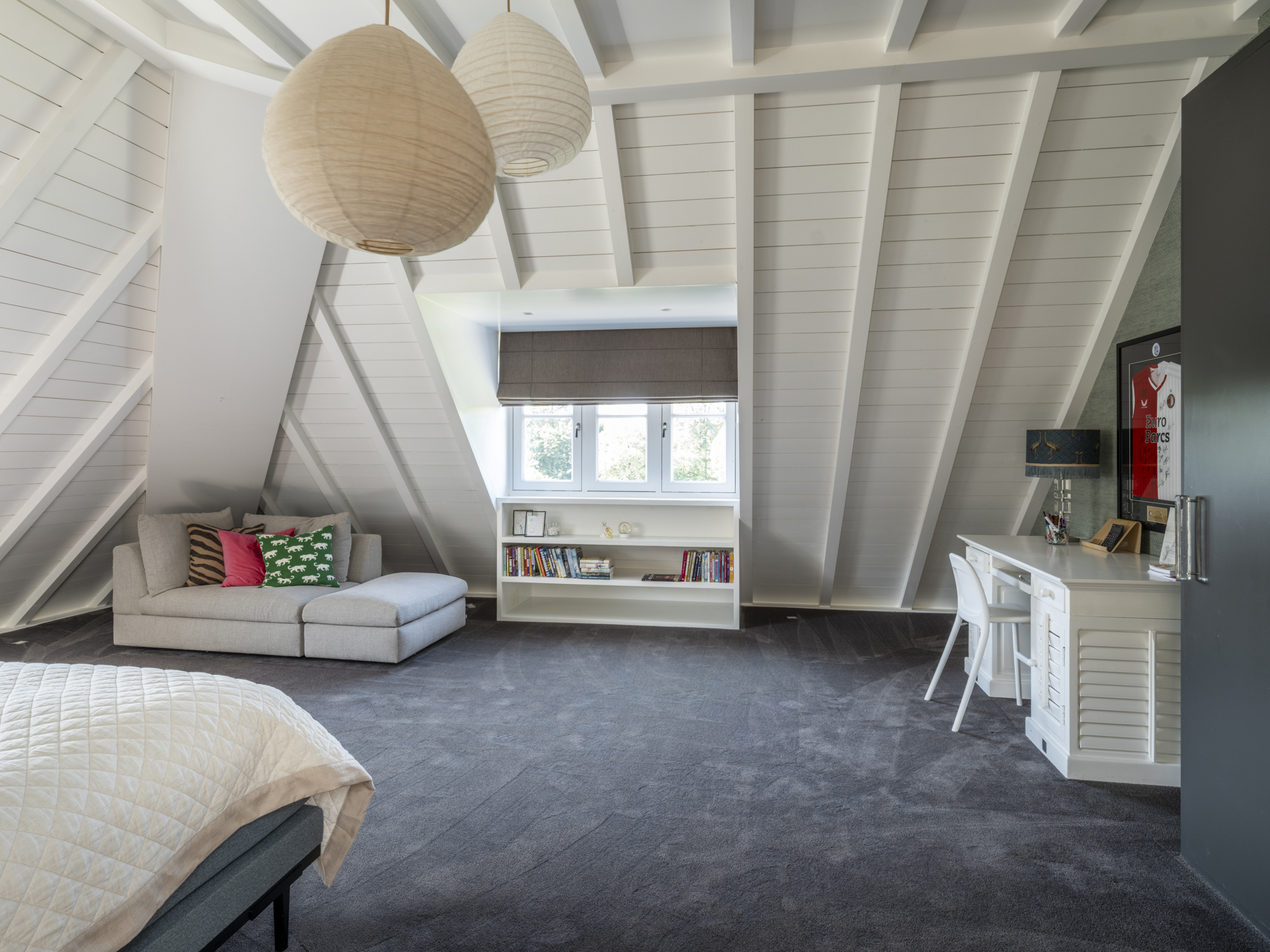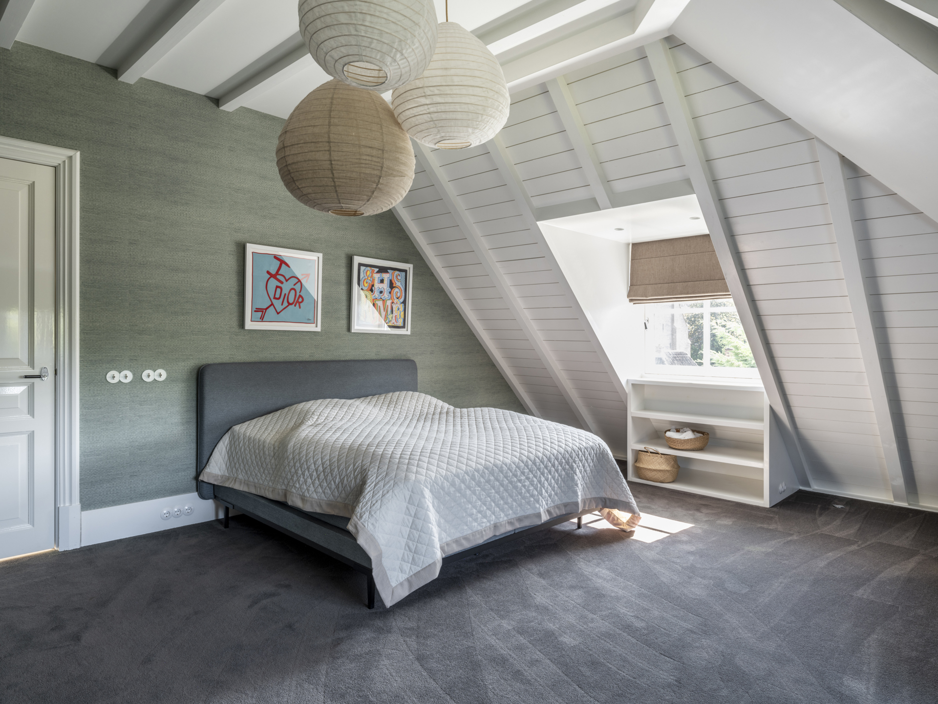The main level flows from a stately entrance into luminous, open-plan living and dining spaces, anchored by a luxury kitchen whose glass walls draw the garden inside. A covered veranda with an open fireplace extends this sociable core into the landscape, while a quiet study and dedicated TV/work rooms balance retreat and connection. All seven bedrooms are air-conditioned, with the master suite offering both a garden-view balcony and a spacious dressing room adjacent to a double bathroom. The upper floors and attic grant additional bedrooms, private guest suites, refined bathrooms, and tailored storage throughout.