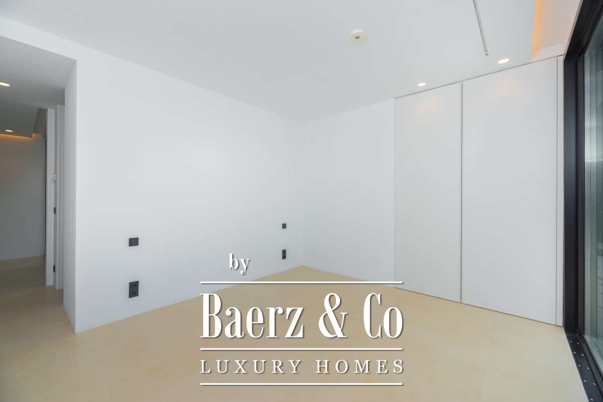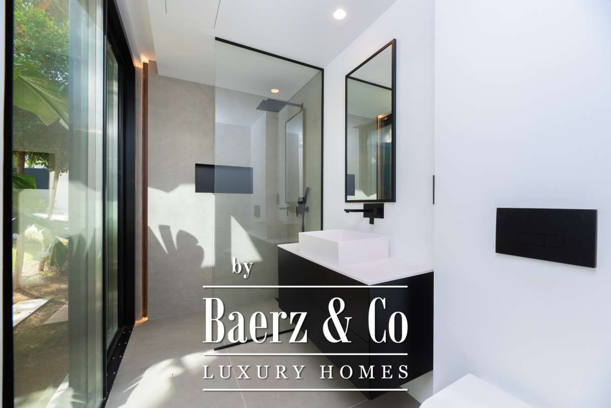 Each bedroom features built-in wardrobes and garden or terrace access, with the master suite enhanced by an en-suite bathroom including a designer bath, his-and-hers sinks, and a rain shower. The villa is thoughtfully equipped with mood lighting, smart temperature systems, and an integrated alarm. Outdoors, a Zen-inspired garden guides you to the entrance, where bonsai trees and a tranquil pond create a serene welcome. The backyard encompasses a sculptural infinity pool, a sun-bathed terrace, and tropical landscaping reminiscent of Bali, all set for privacy and contemplation.