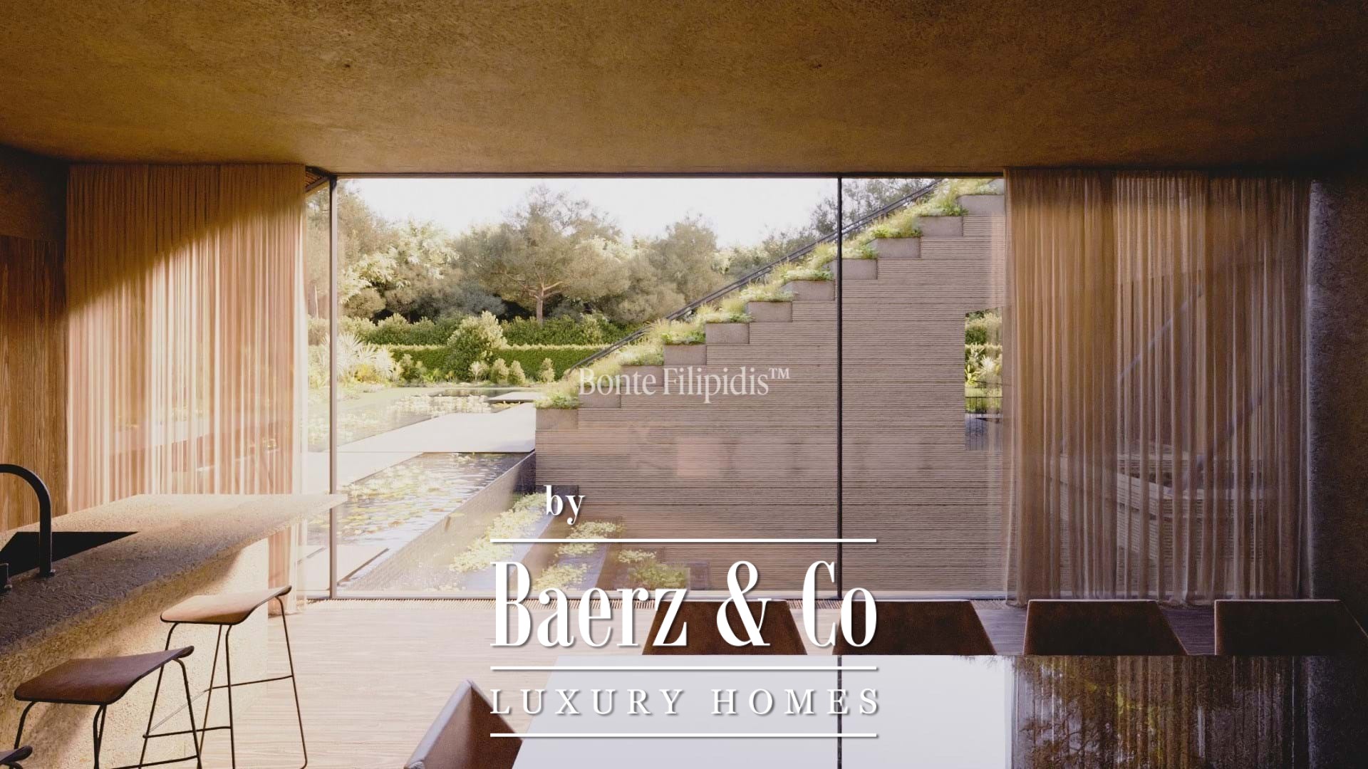 There are six en-suite bedrooms, including a master suite with private terrace and walk-in closet. The east and west-facing suites reveal serene views of landscaped gardens and water features. The lower level houses a gym, spa with sauna, laundry, technical areas, and a garage with electric gate for security.