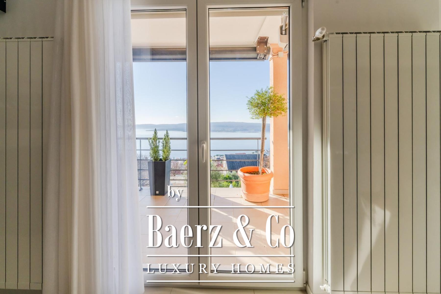 The second floor comprises a studio and an additional apartment, both featuring private balconies facing the Adriatic. The larger apartment offers a living space with kitchen and dining, two bedrooms, and a bathroom. This house in Crikvenica is sold fully furnished, equipped with air conditioning, solar water heating, and a central heating system with a heat pump for comfort throughout the year.