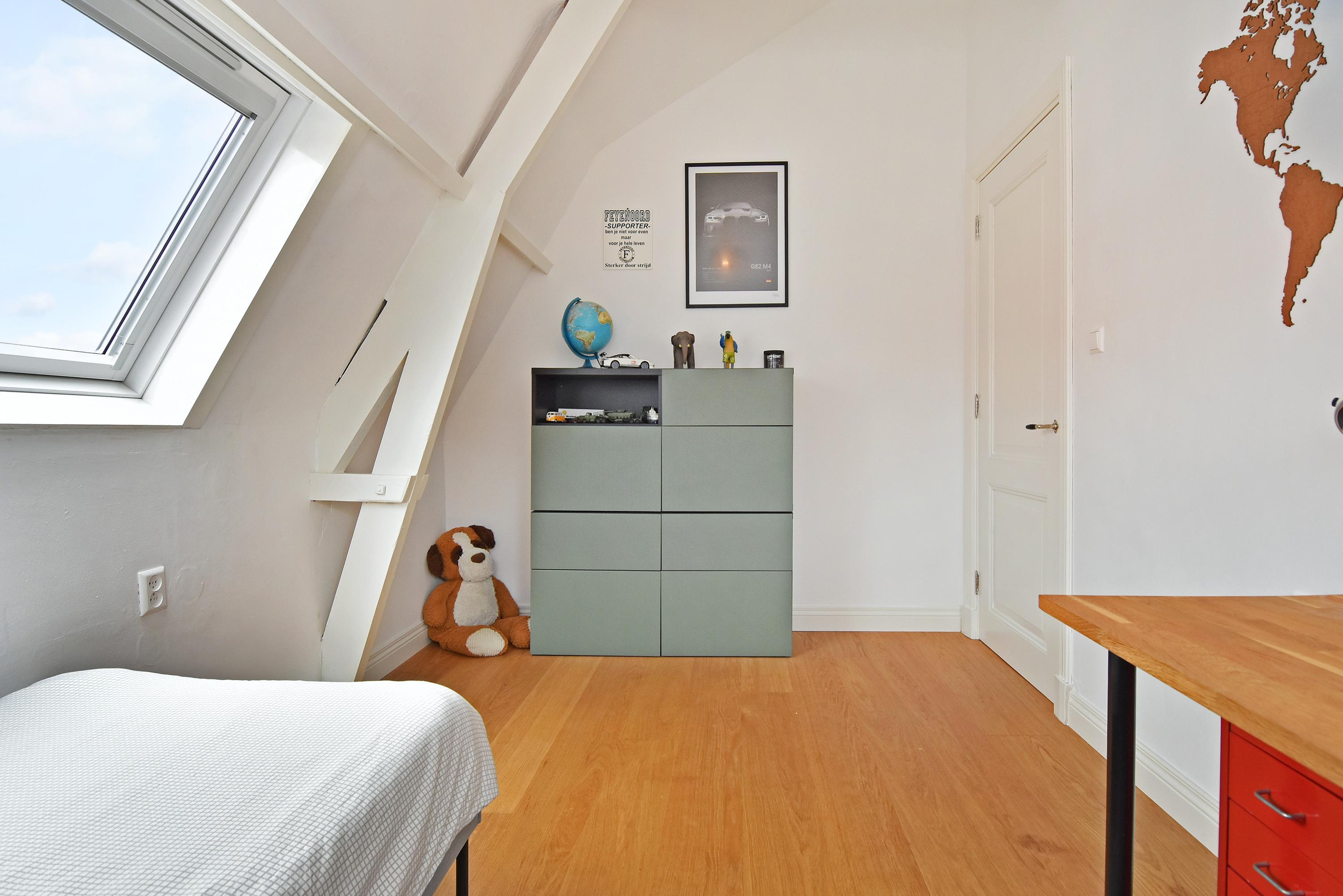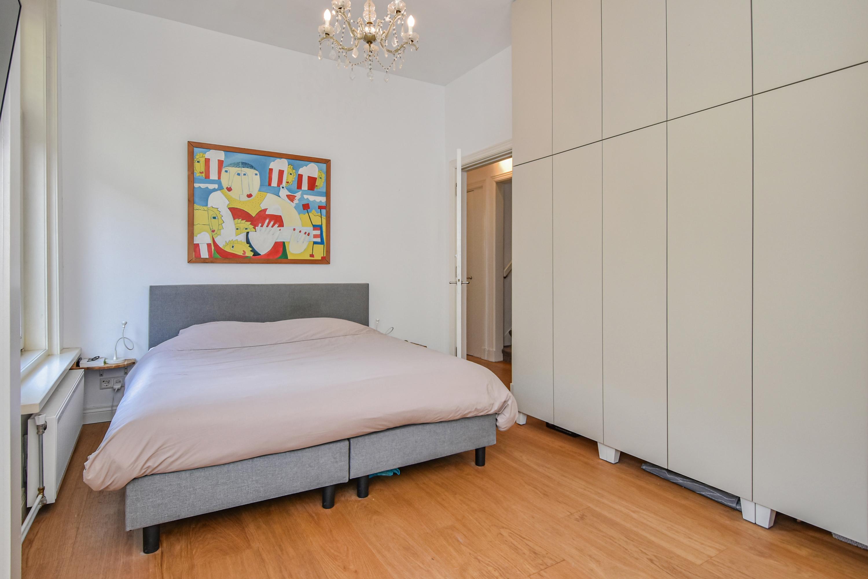 The landing provides access to a separate toilet with washbasin and additional storage space. The spacious and bright front bedroom features a high ceiling and a beautiful view over the canal. There are two additional large bedrooms, one with a walk-in shower and washbasin. All bedrooms are adorned with stained-glass windows. A separate laundry room gives access to the roof garden—a delightful, sheltered spot with optimal sunlight. From early morning until late evening, you can enjoy the sun, privacy, and a charming green setting. The terrace also includes a large wooden storage shed.