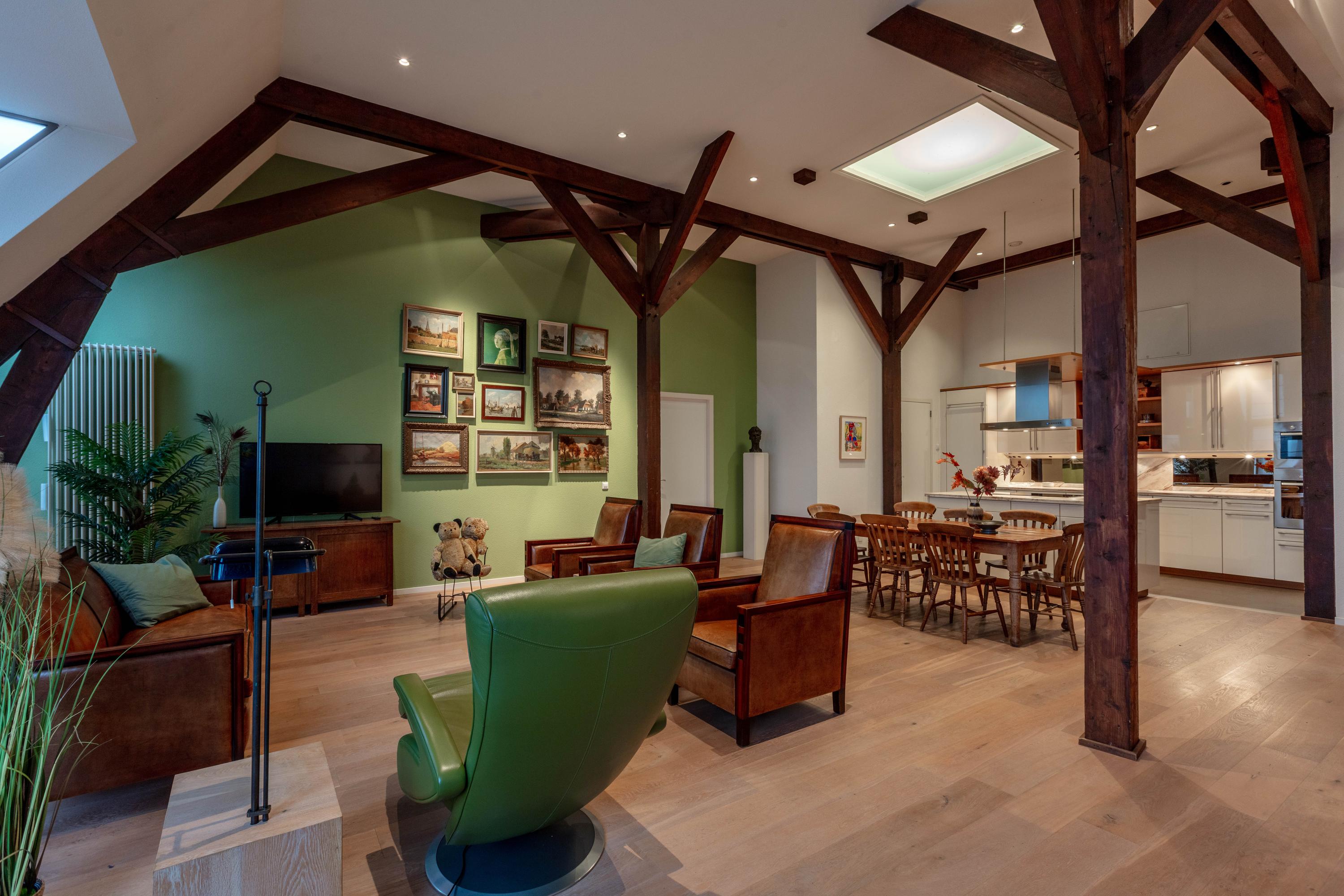 De bijzonder sfeervolle woonkamer is indrukwekkend door de unieke hoogte en fraaie zichtbare kapconstructie. De open keuken bevindt zich aan de achterzijde en beschikt over een kookeiland, volop kastruimte en diverse inbouwapparatuur. Vanuit de keuken is er prettig zicht op de woonkamer met een gezellig zitgedeelte en een apart eetgedeelte.