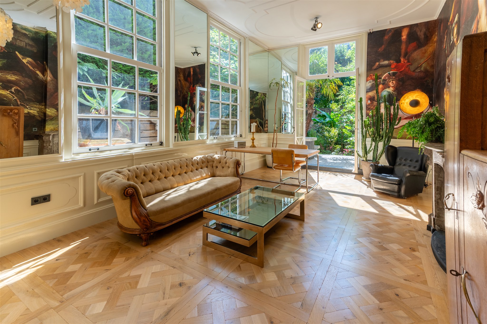 At the front: the grand living room with soaring four-metre ceilings, oak flooring, and a splendid view over the canal and the historic Armamentarium.