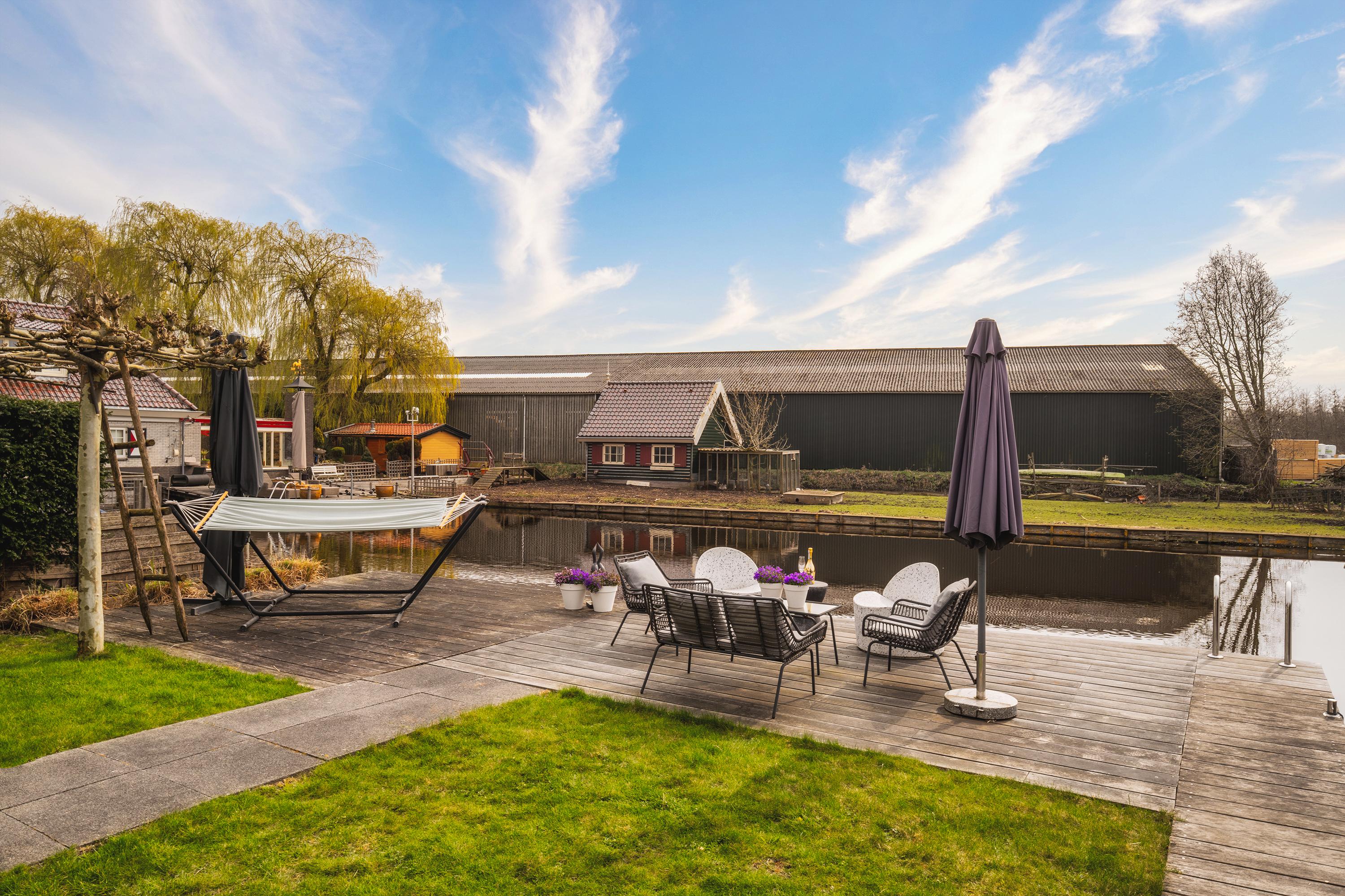 The garden is beautifully landscaped and thoughtfully designed. Located on the water with a private mooring for a sloop and a swimming ladder to enjoy the open water directly. Whether you are lying in the hammock or sitting on the terrace by the water, the view of the water and Het Twiske never gets boring. The garden has drip irrigation for optimal watering and atmospheric lighting with 12V spots. Under the canopy with louvered tilting roof and glass sliding doors (with integrated drainage function), you can enjoy it all year round.