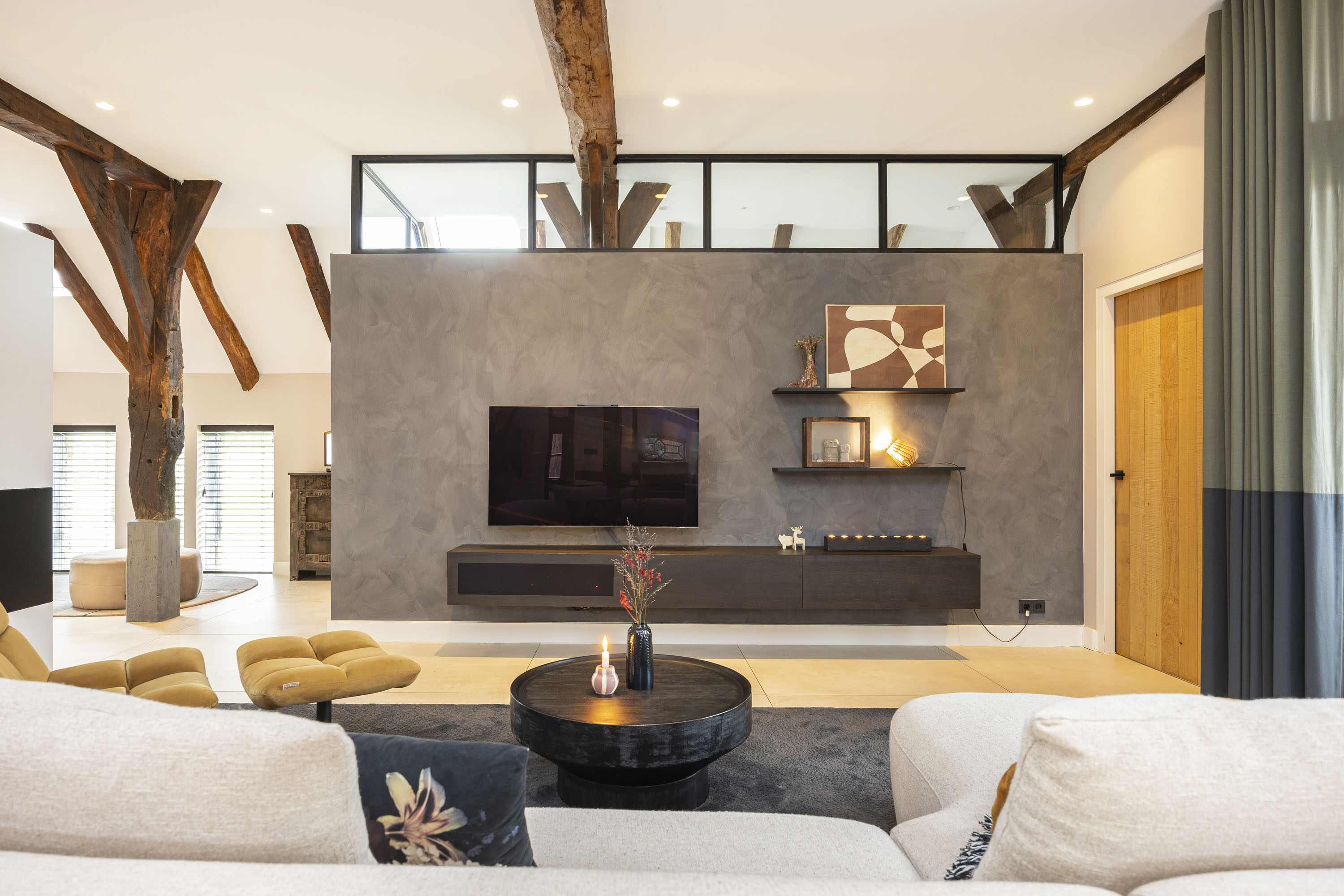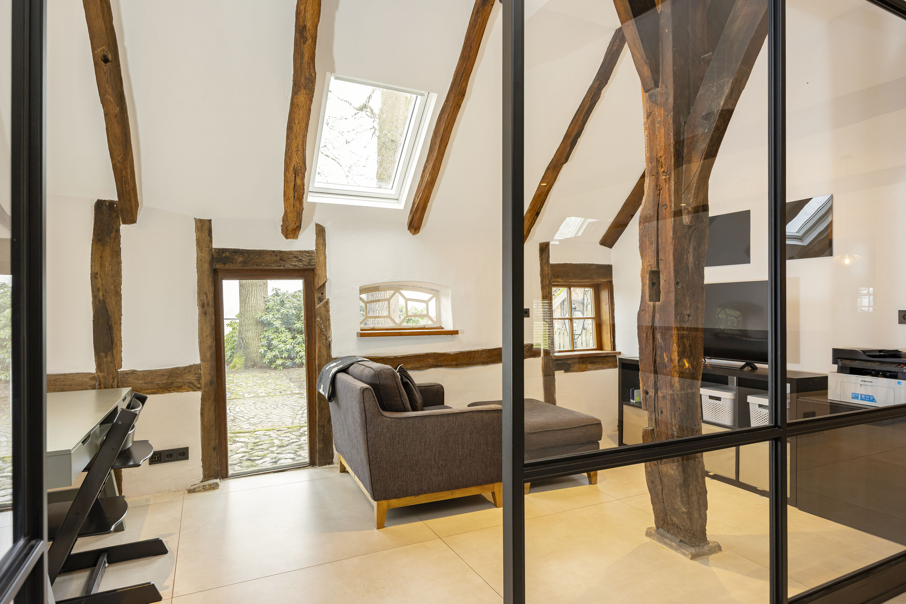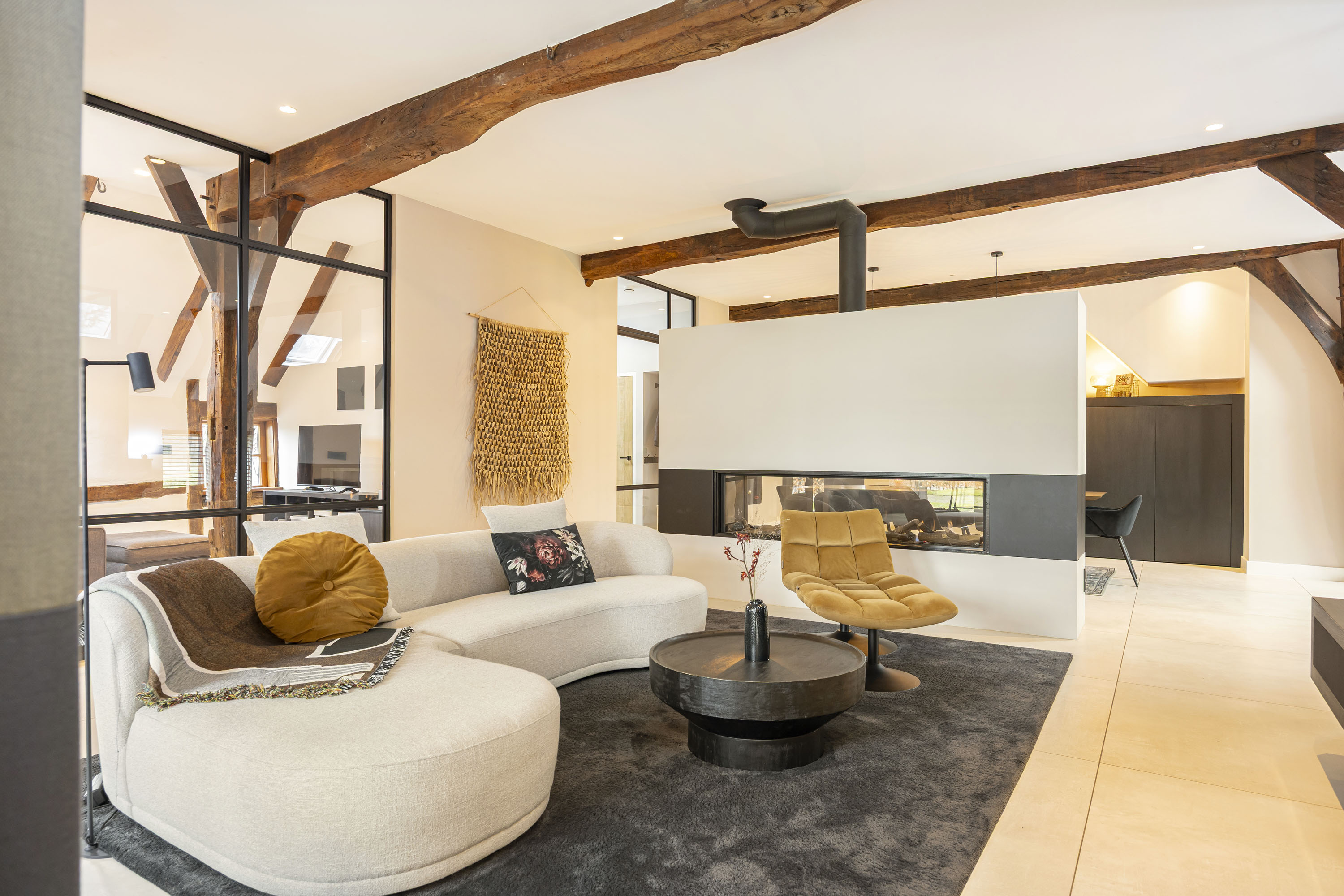 Rural living at its finest in the countryside of Denekamp. This characteristic, monumental and fully renovated farmhouse with several outbuildings is beautifully tucked away in the lush landscape of northeast Twente. The authentic appearance of the Saxon-style farmstead—with its robust half-timbered façades, refined window mullions, nostalgic outbuildings, majestic oak trees and driveways and terraces paved with traditional baked bricks—creates an exceptionally charming and rustic atmosphere.