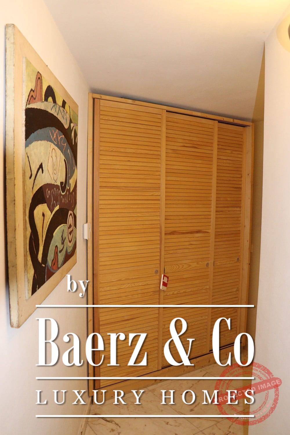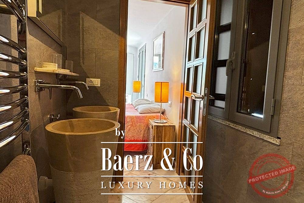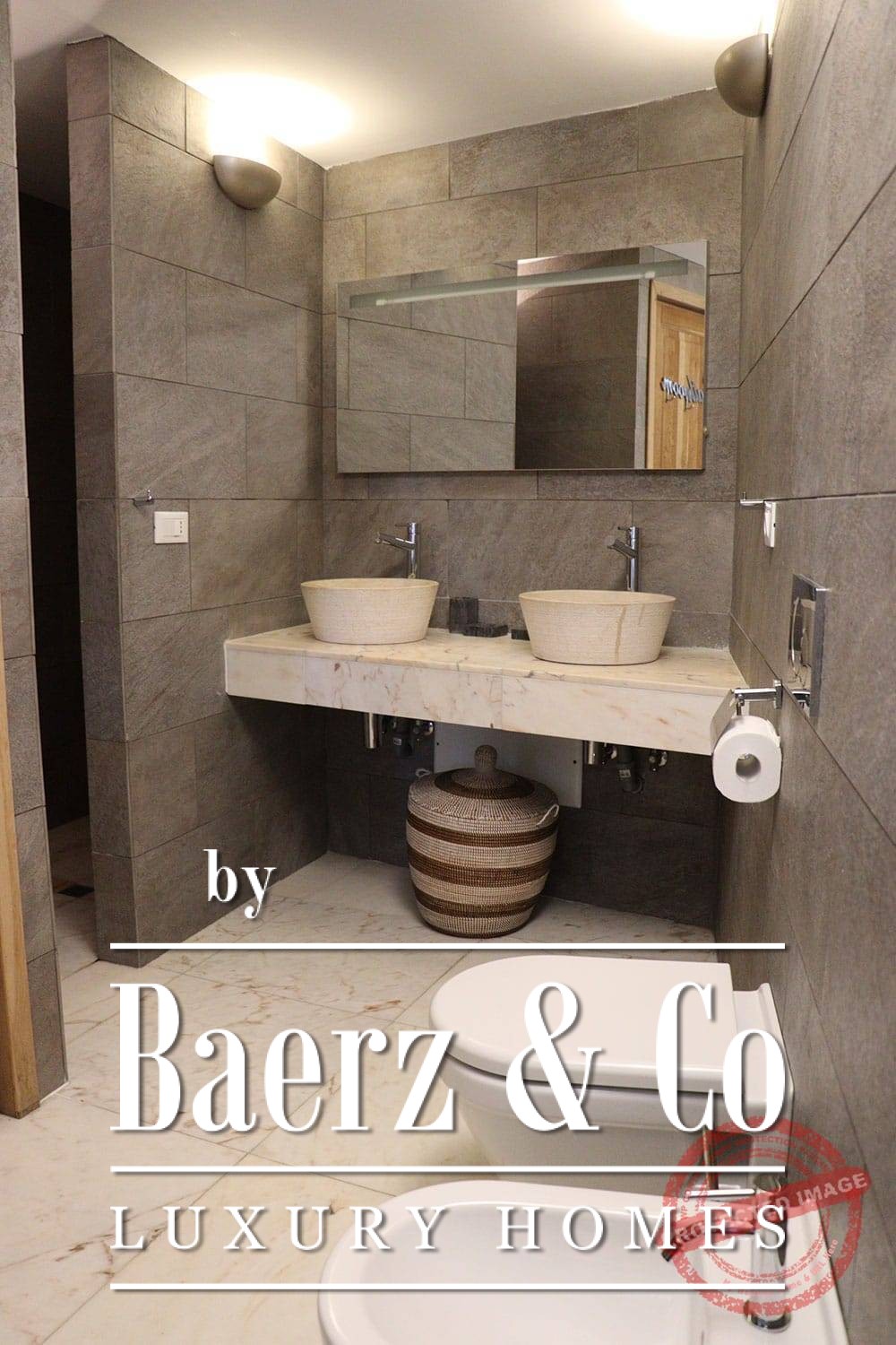 All bedrooms have French doors opening onto the lower terrace with stunning views of the vast mountain landscape. The master bedroom has a large bathroom with bath, a separate shower, two marble basins, toilet and bidet. The second bedroom has a bathroom with two designer sinks, wc, and shower. The third bedroom (the studio), with its own entrance via the lower terrace, has a bathroom with designer washbasin, shower and wc. All bedrooms have a fixed wardrobe. There is a large built-in linen cupboard in the downstairs corridor.