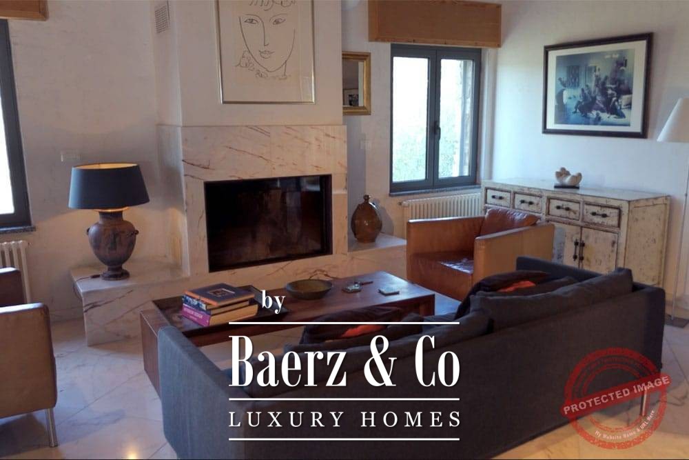 • On the upper floor, also the entrance to the villa, is a large cosy living room with fireplace and a beautiful beamed ceiling, an open-plan kitchen and an office or television room with French doors opening onto the terrace.