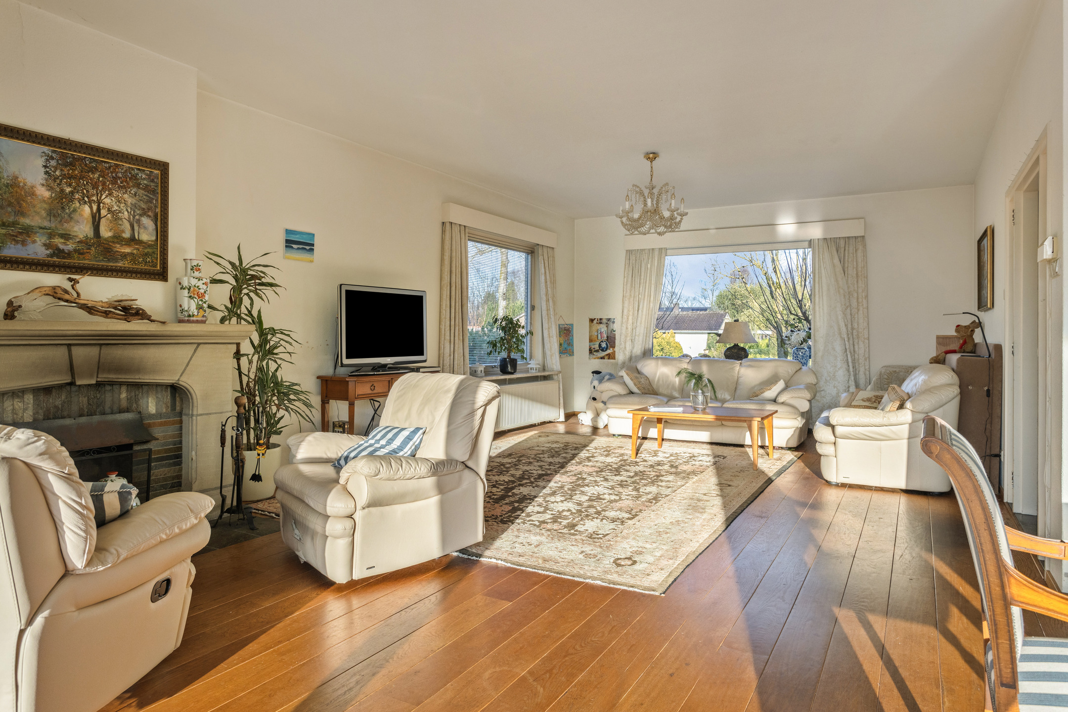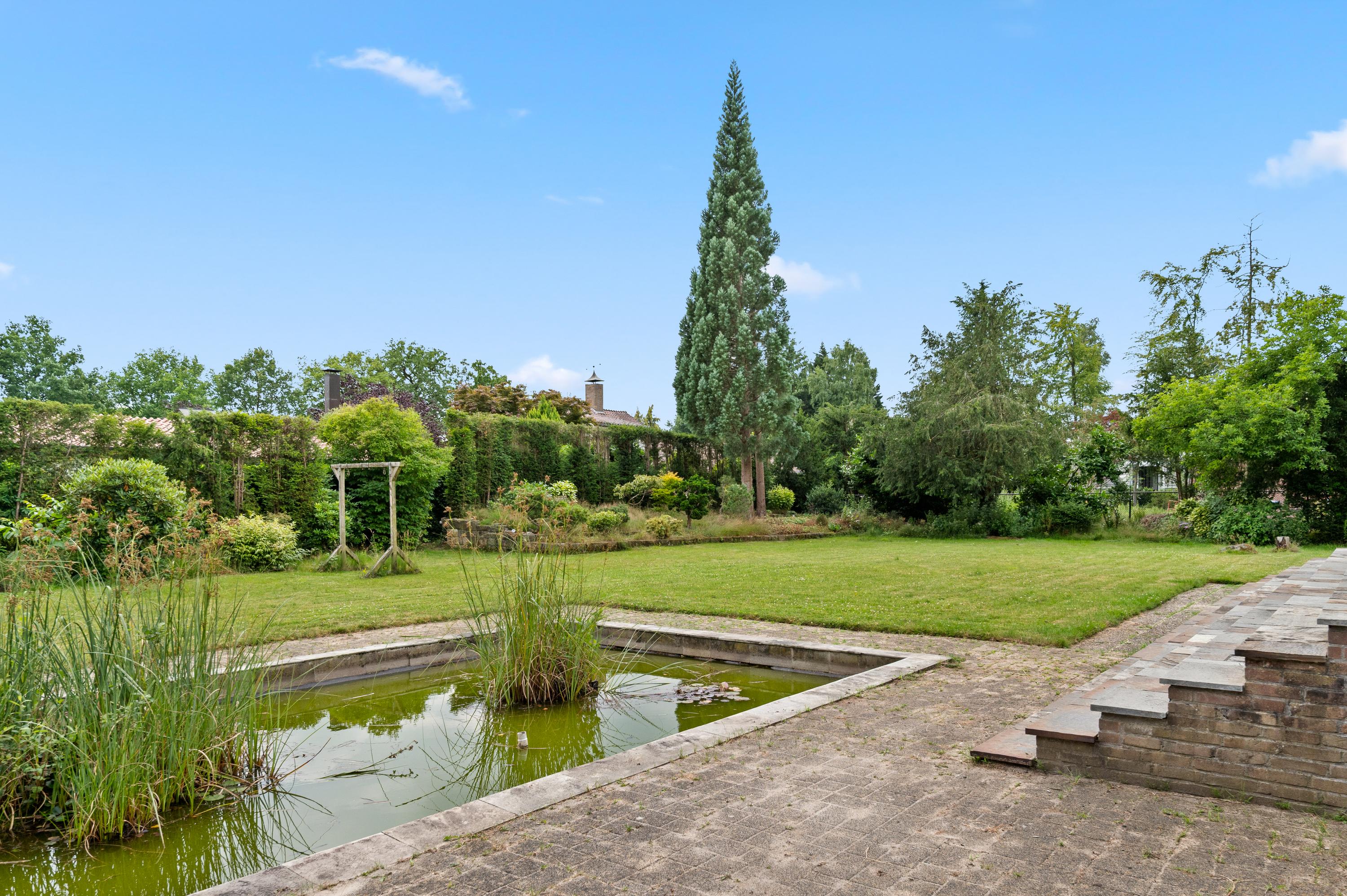Covered entrance into a hallway with a striking double staircase and access to the guest toilet. From here, step into the L-shaped living and dining room with a cozy fireplace and classic mantel. The separate kitchen is fully equipped with built-in appliances, including a refrigerator, oven, microwave, dishwasher, and 4-zone induction hob with extractor. Three versatile rooms—currently used as bedrooms—are also accessible from the hall, two of which feature fitted wardrobes and en-suite bathrooms. Two of the bedrooms offer direct access to the beautifully landscaped rear garden, complete with a large partially covered terrace, lily pond, and lush greenery including rare and exotic plants.