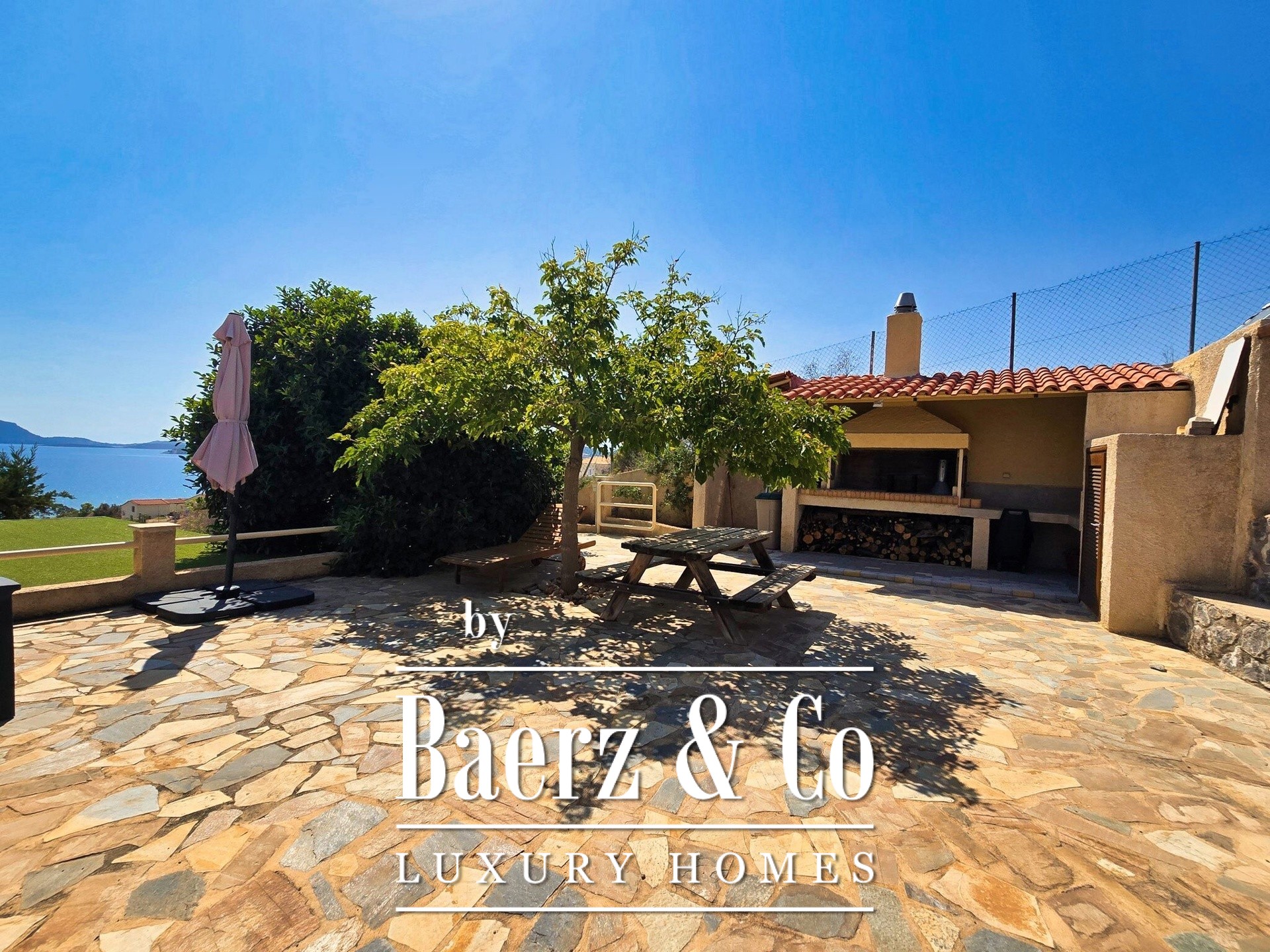 The surrounding area is planted with ornamental flowers and fruit trees and carefully landscaped with stone details, cobblestones, outdoor seating areas, an "open-air cinema" and a BBQ, while the swimming pool offers an ideal place to relax with a view of the sea.