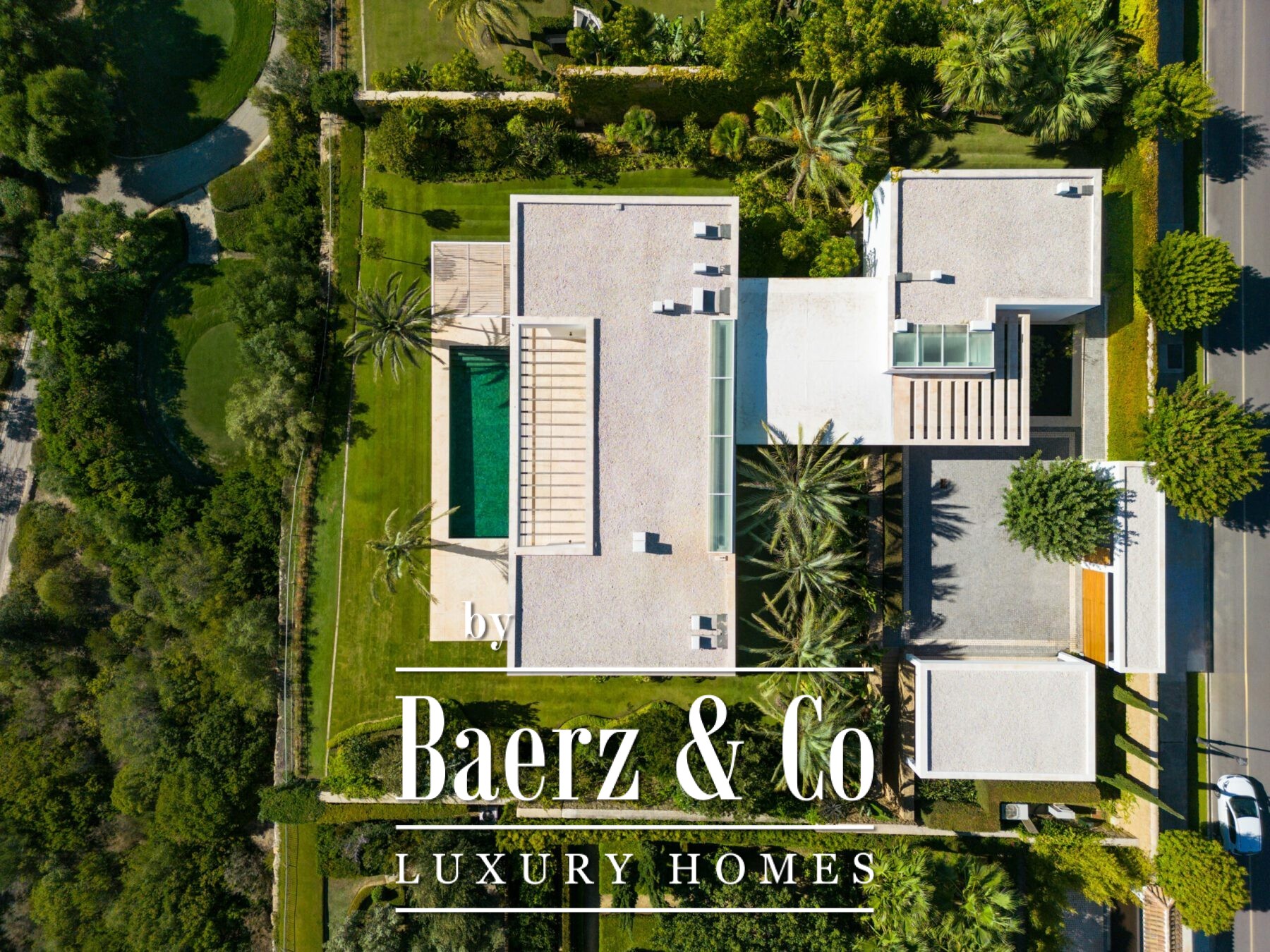 This exquisite villa, nestled beside the golf course, presents an extraordinary opportunity for residents to immerse themselves in the lavish Mediterranean lifestyle. Poised within the famous golf resort, this residence affords sweeping vistas of the lush fairways and the Mediterranean Sea. The architectural brilliance shines through, lending the home a modern allure that epitomises luxury. Set upon an expansive plot, the villa welcomes guests with a captivating entrance adorned with a picturesque lake and meticulously landscaped gardens. Spanning two levels, the four bedrooms are located on the upper floor, while an additional fifth bedroom is conveniently located on the ground level. Inside, the interiors exude elegance with their soft neutral tones and tasteful wooden accents, creating