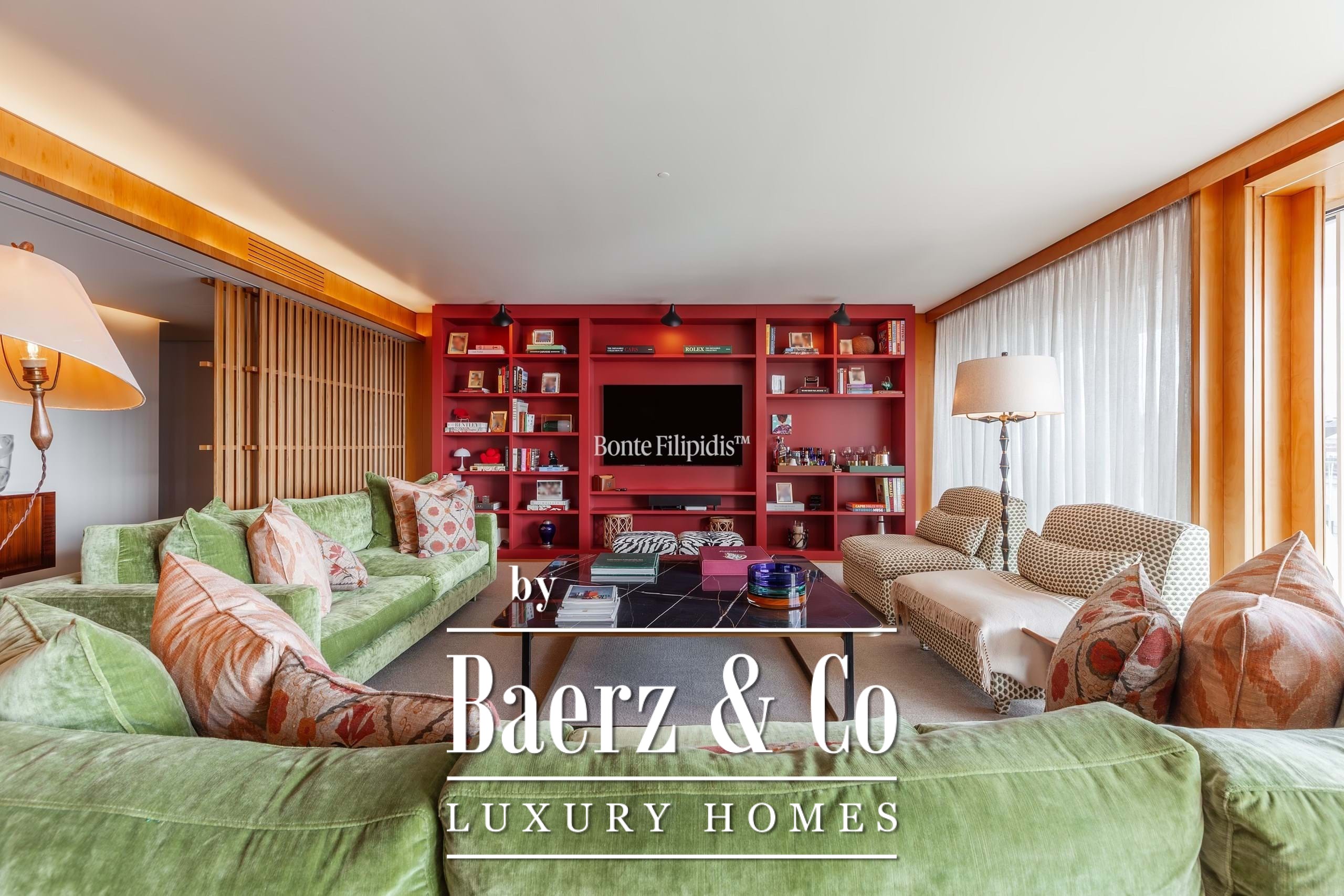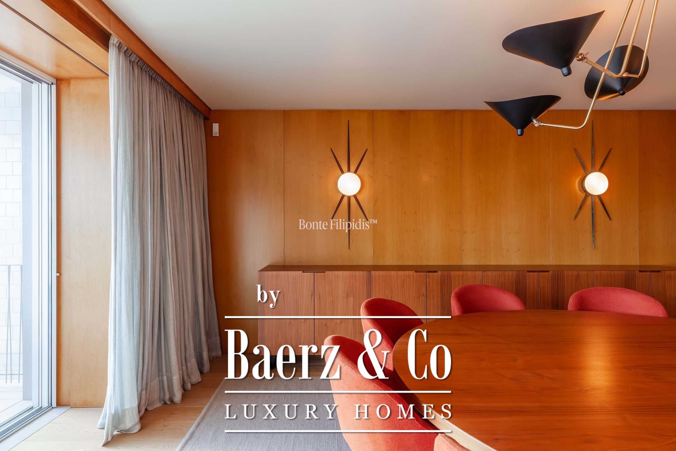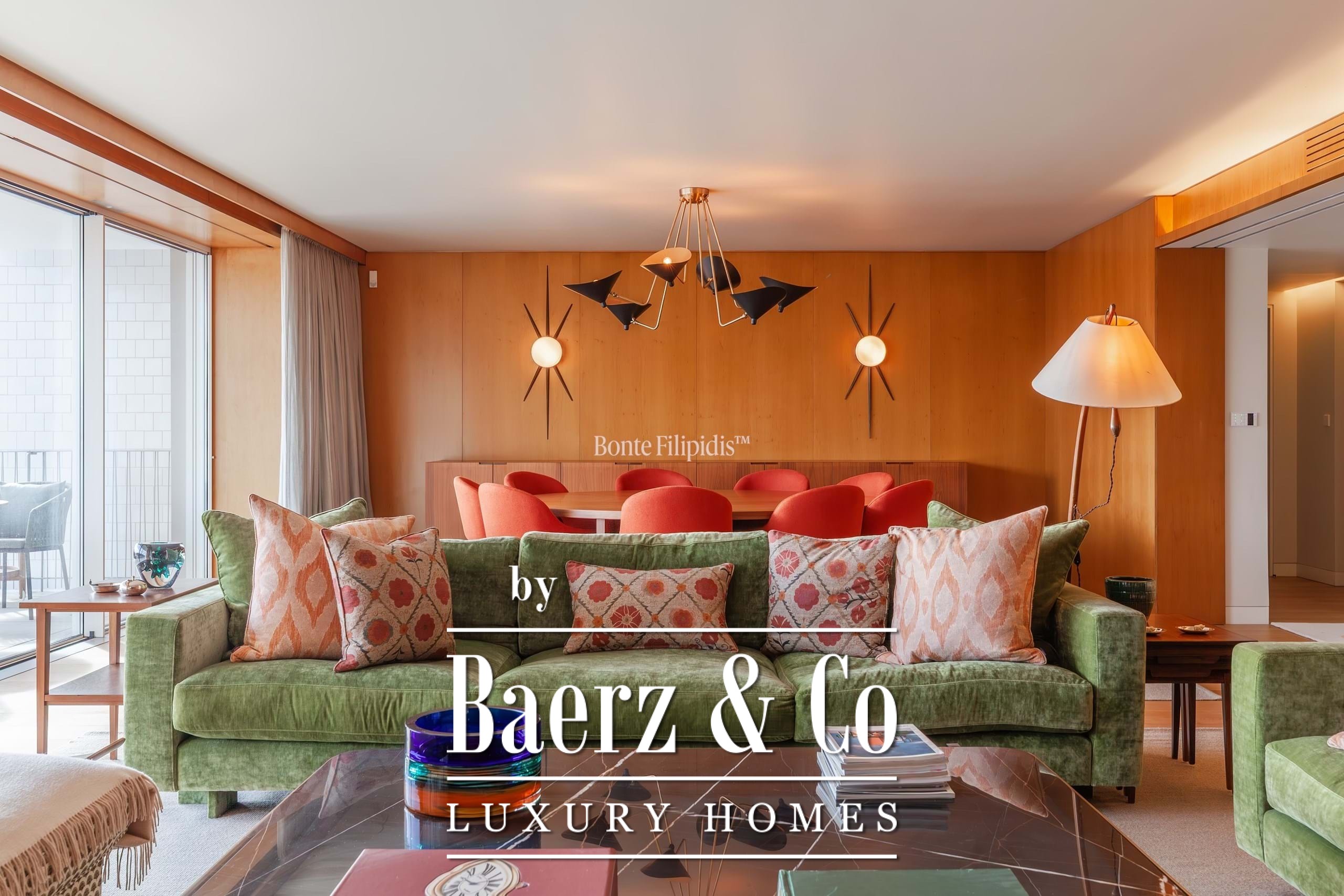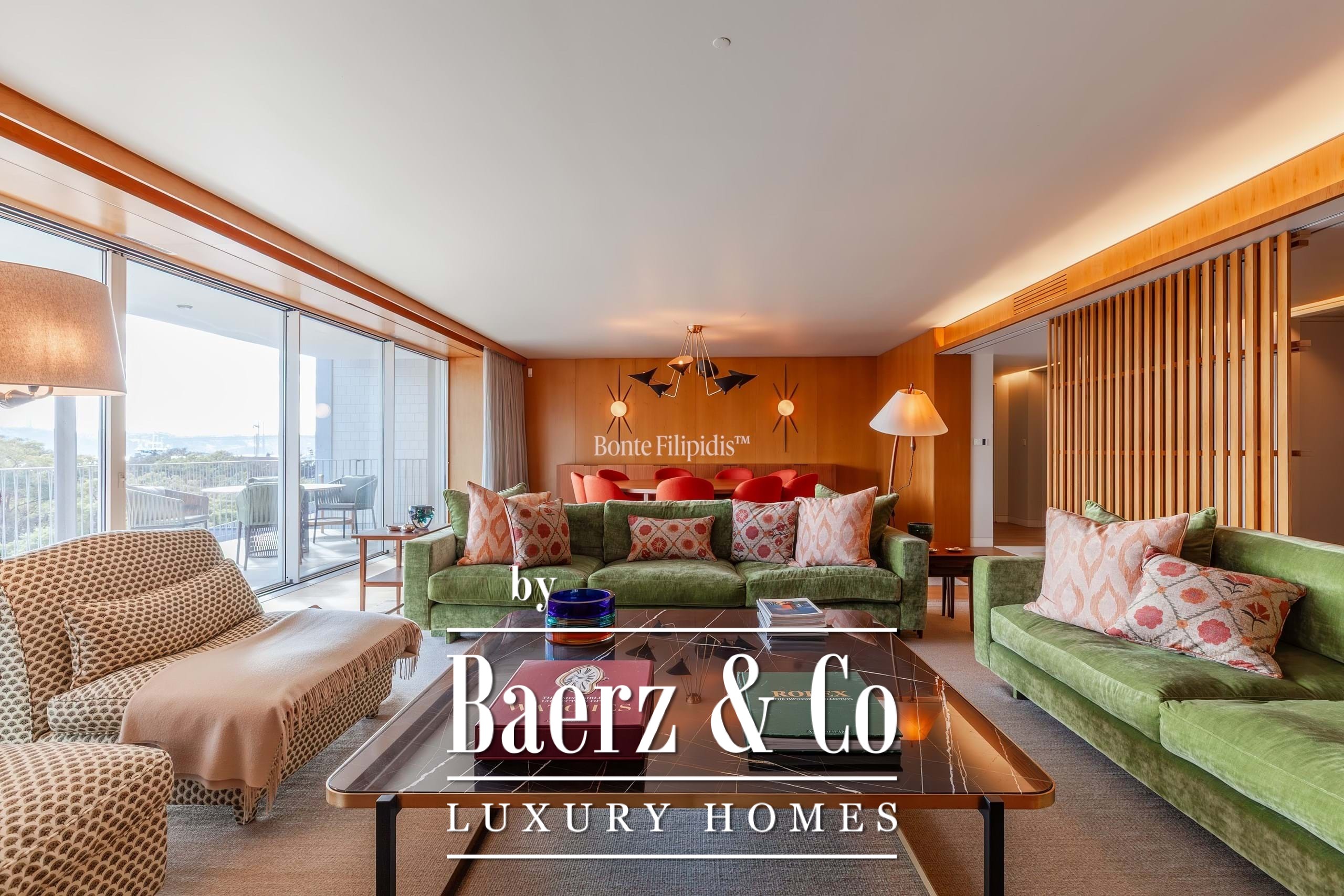 The apartment’s open-plan living and dining area extends directly to the terrace, forming the core of its social rhythm. The contemporary kitchen is fully equipped, with a dedicated laundry area and ample storage, blending utility with understated style. Two of the four bedrooms are suites, with the master featuring a walk-in closet, abundant natural light, and direct terrace access. The private zone balances quiet retreat and generous proportions, while considered wood panelling and curated furnishings shape an atmosphere of warmth and discretion.