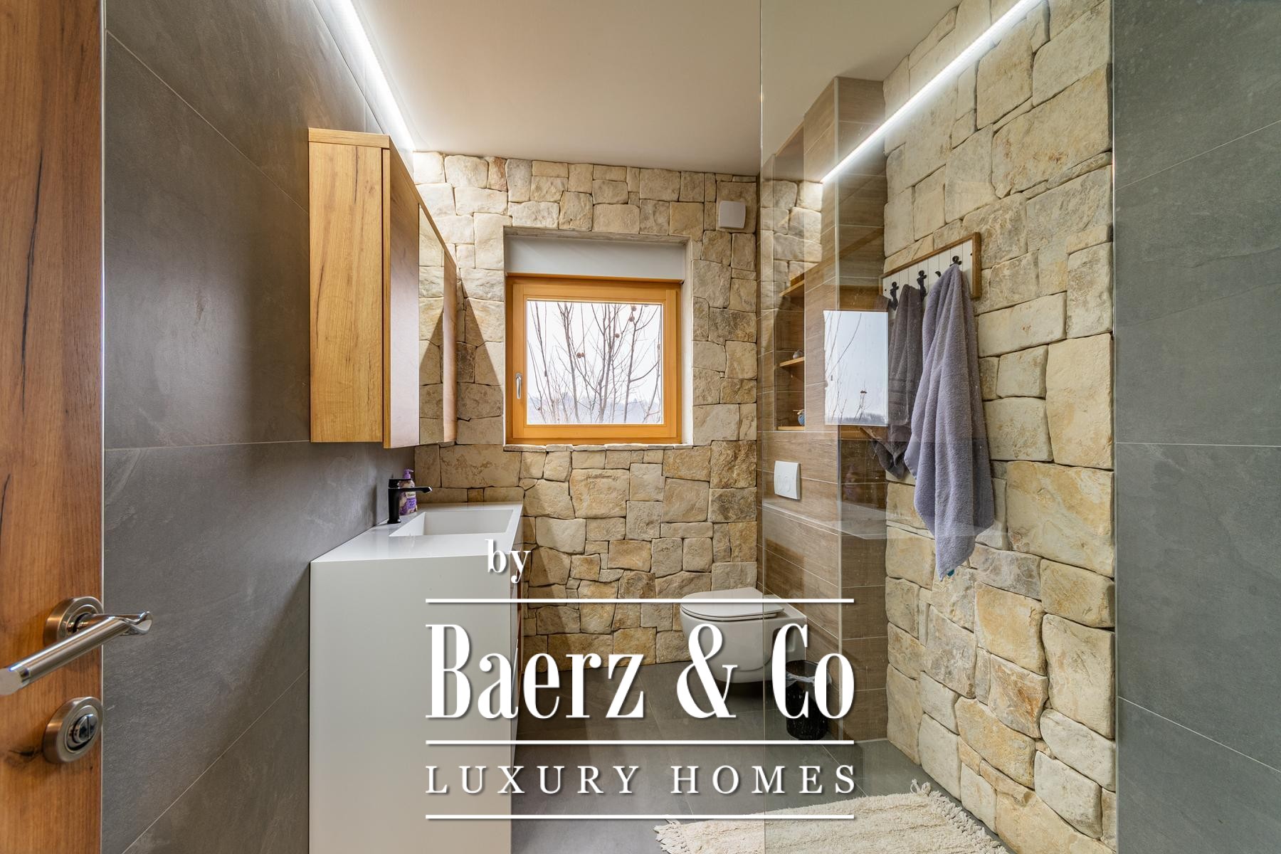 The villa’s architecture flows effortlessly between its three levels. The ground floor features an open kitchen, dining, and living zone, anchored by a fireplace and opening onto a broad terrace that welcomes natural light. A bedroom and bathroom with WC complete this floor. On the first level, a separate entrance leads to two bedrooms, a spacious bathroom, and a flexible kitchenette and living arrangement, with another terrace that frames the scenery. The finished basement provides a private sauna, wine cellar, and garage, grounding the home in quiet luxury.