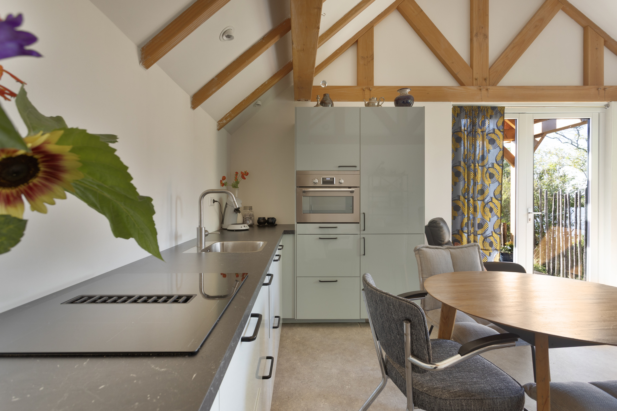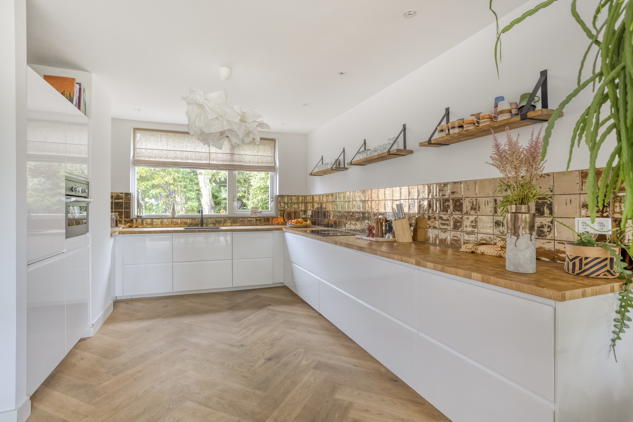 Bright and inviting, with French doors leading to the garden and a cozy wood-burning stove for winter nights. High ceilings and original exposed beams complete the picture. Part of the garage has been integrated into the living area, creating even more space! Planning an extension? The foundation is already in place.
