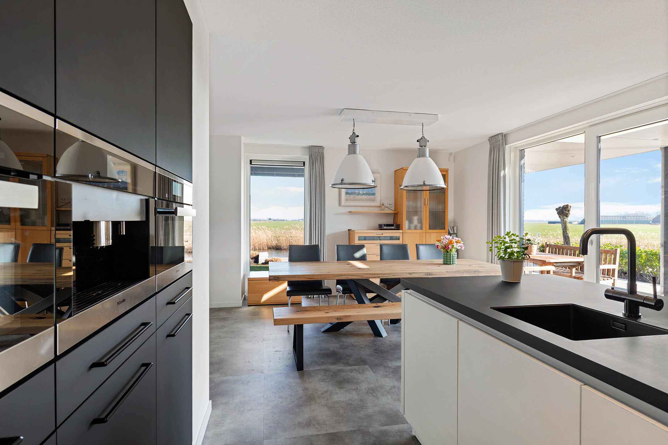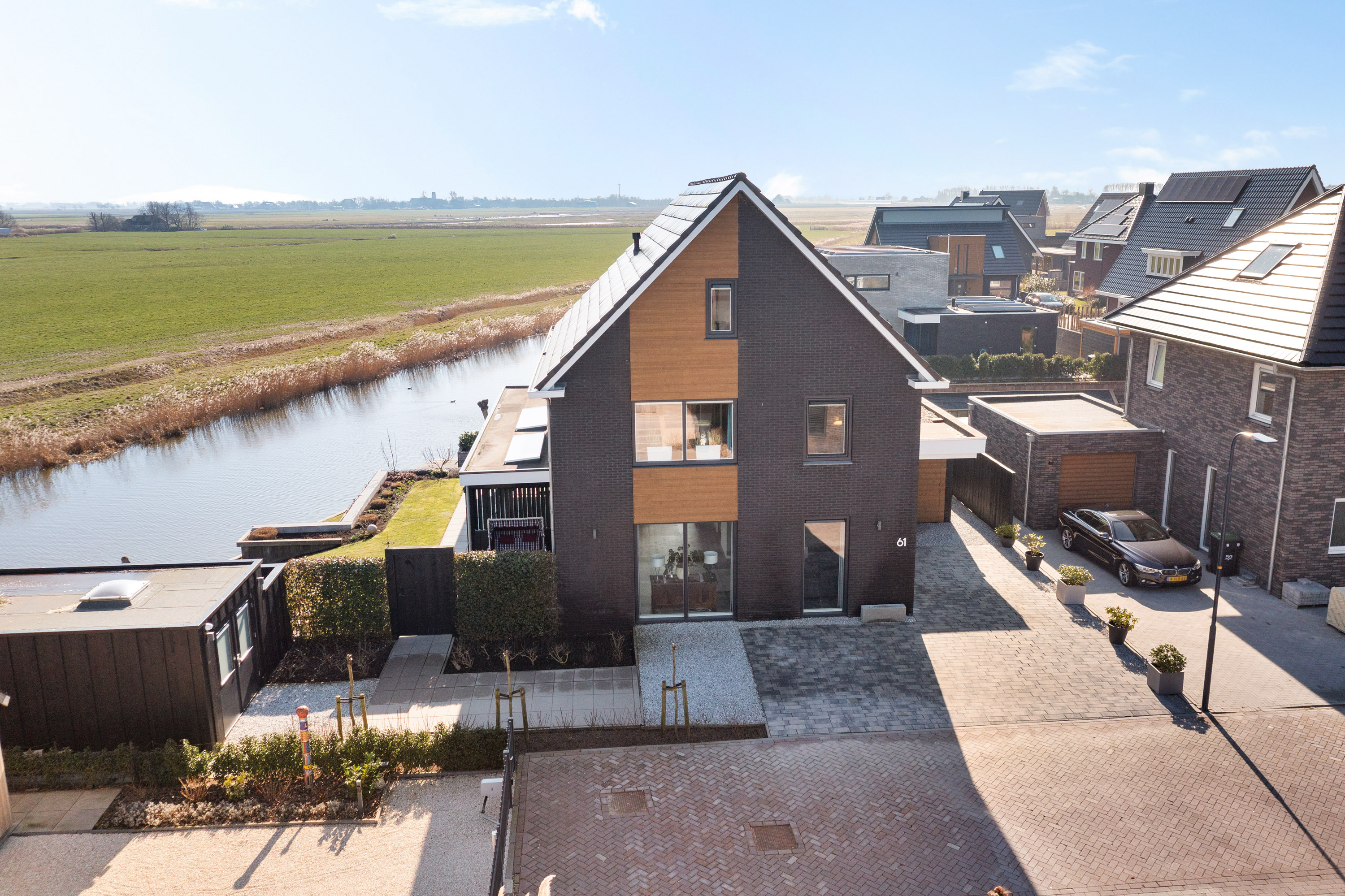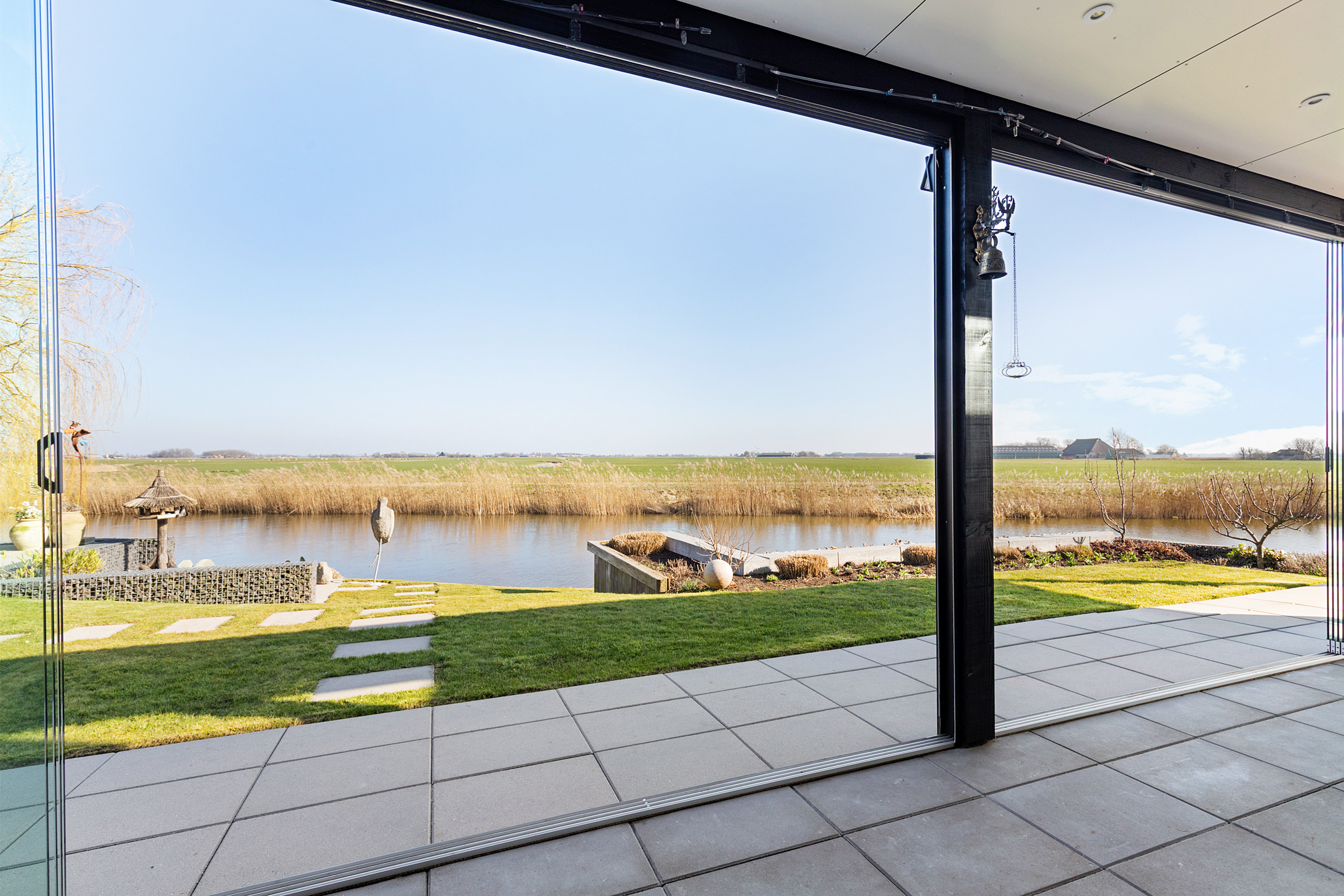 Through the covered entrance, you enter a spacious hall with staircase, guest toilet, and meter cupboard. A glass pivot door provides a beautiful sightline through the living room to the water and open fields.