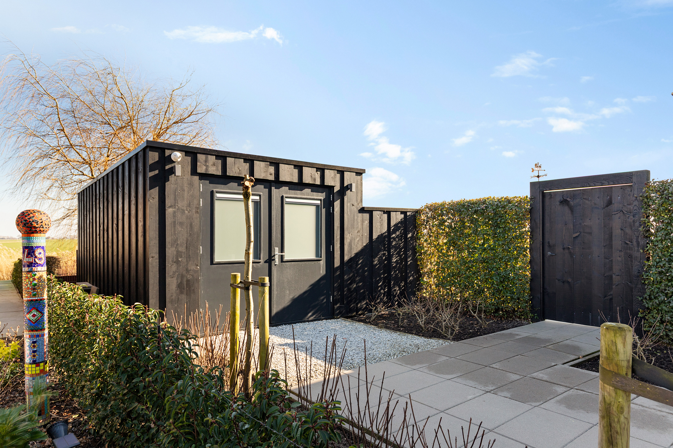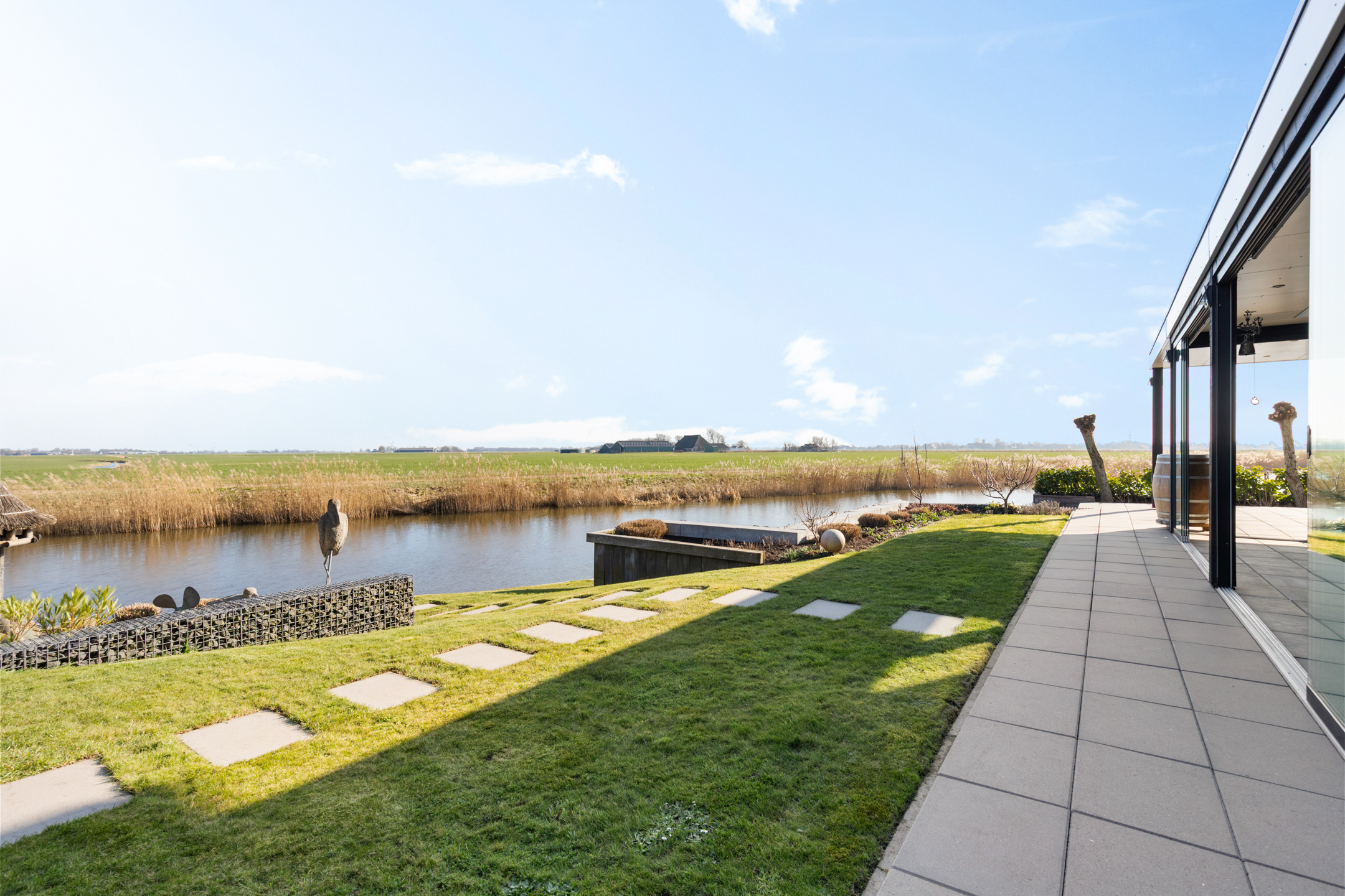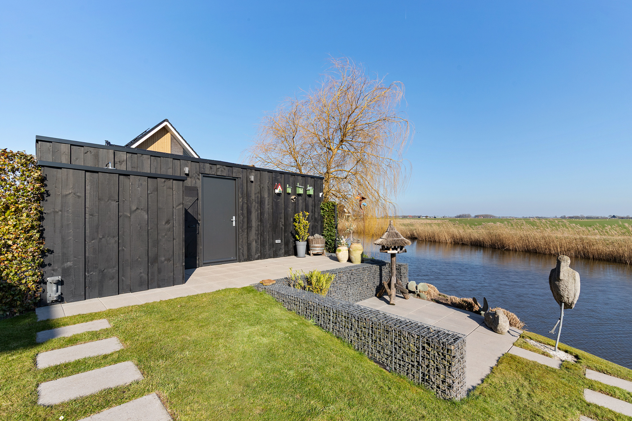 Here, you can enjoy Frisian flora and fauna at its best: sheep grazing, birds of prey, meadow and water birds, and ever-changing skies, this spectacle never grows old. The garden offers sunny and shaded areas; the lawn, flowering borders, pollard willows, and a hydrangea hedge create a serene oasis.