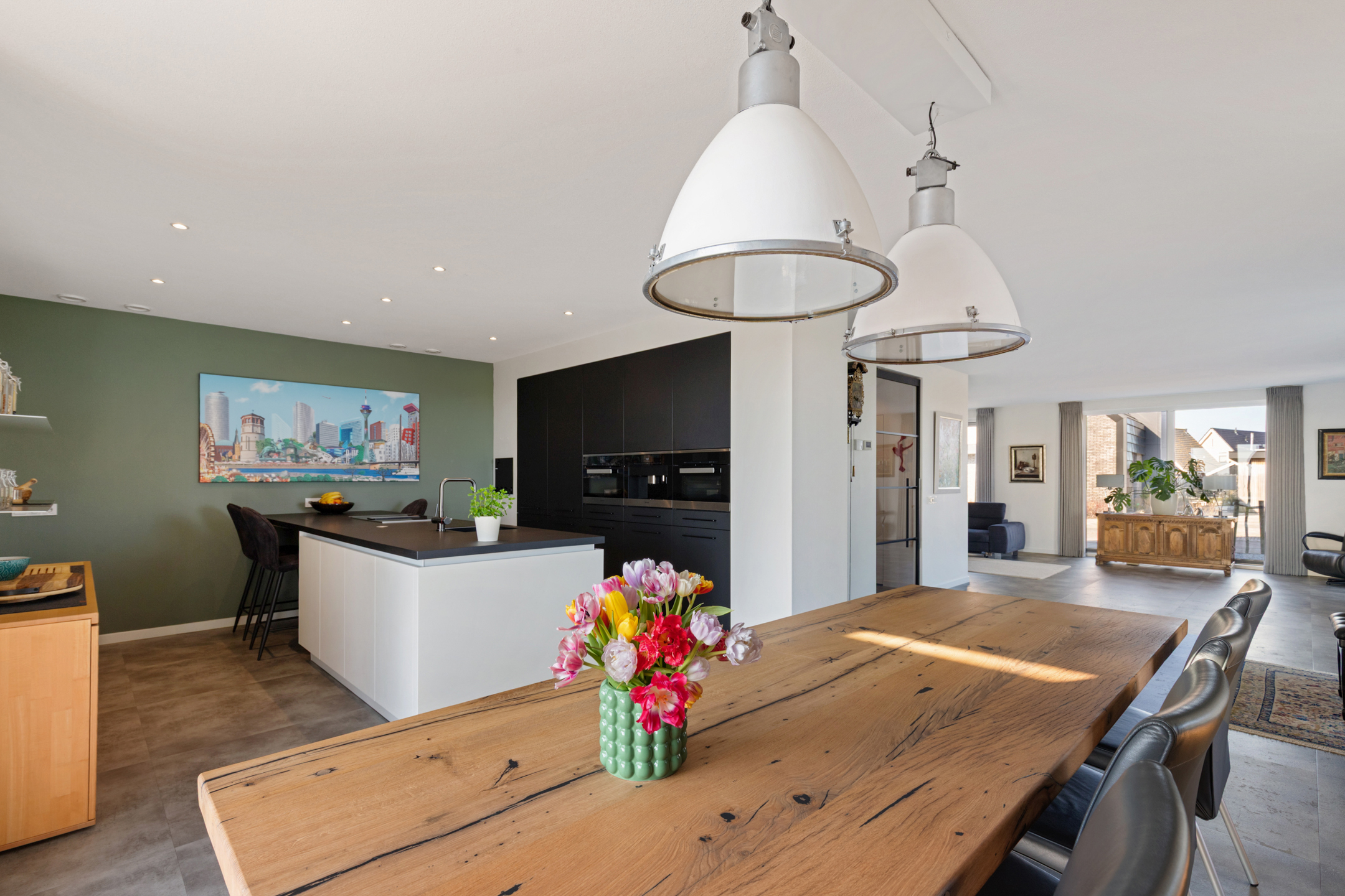 The open kitchen is generously sized and features a cooking/cleaning island and a wall of built-in cabinets with Miele appliances, including a coffee machine, combination microwave oven, combination steam oven, fridge, freezer, and plenty of storage. A hot-water cooker and an induction hob with integrated extractor are also included. The kitchen provides direct access to the spacious utility room with laundry facilities at work height, garden access, and a connection to the garage with heating room. The ground floor has a PVC floor with underfloor heating.