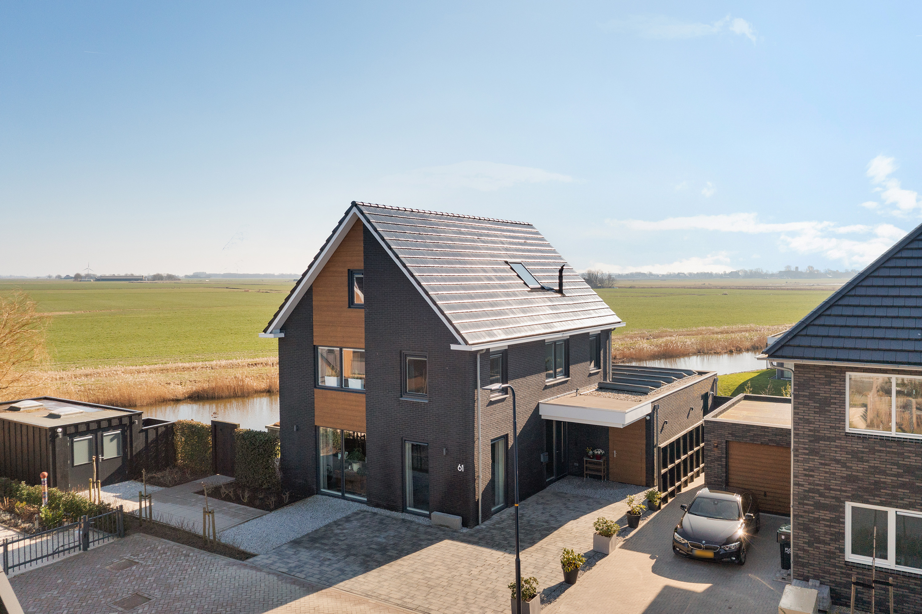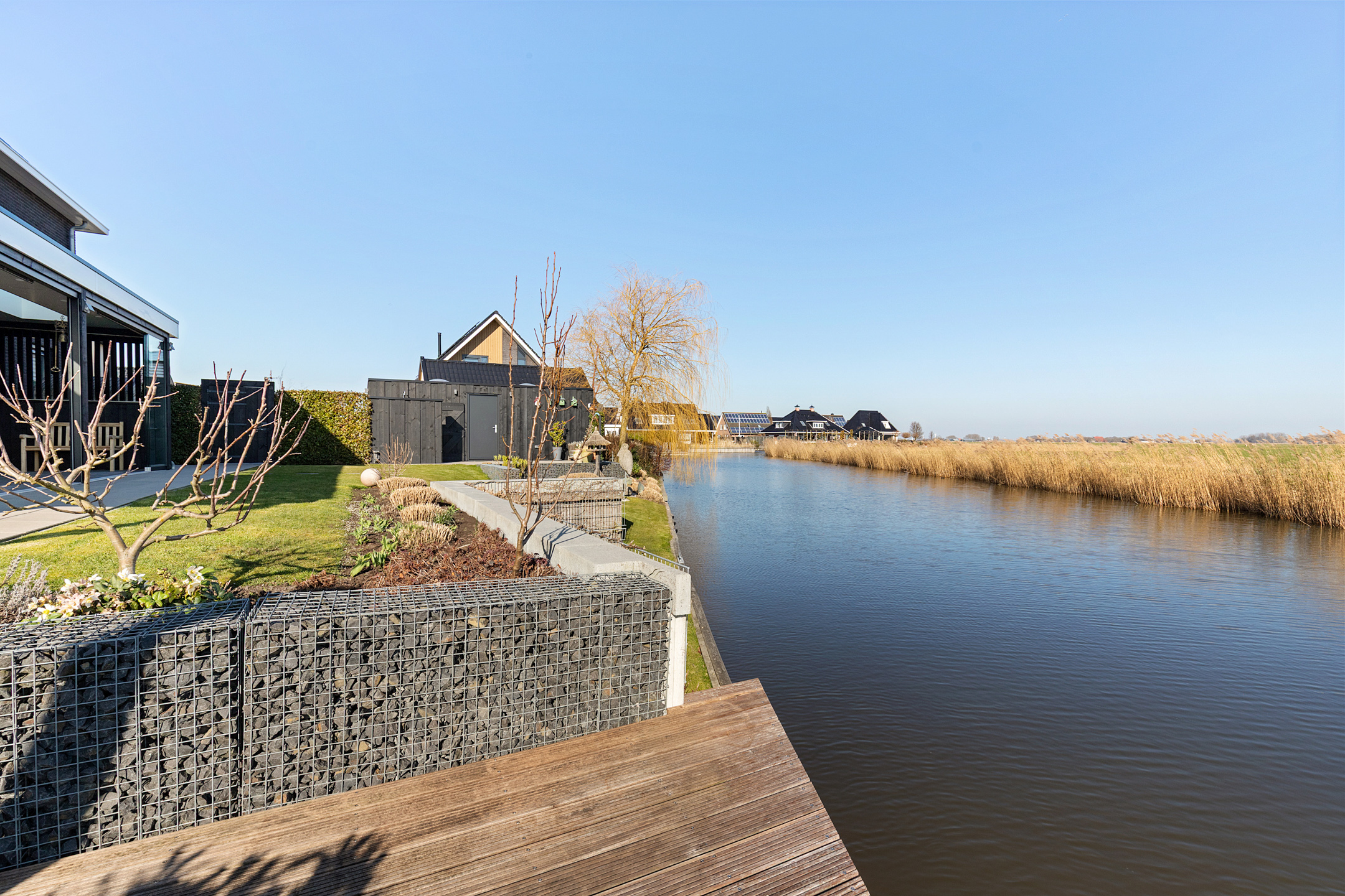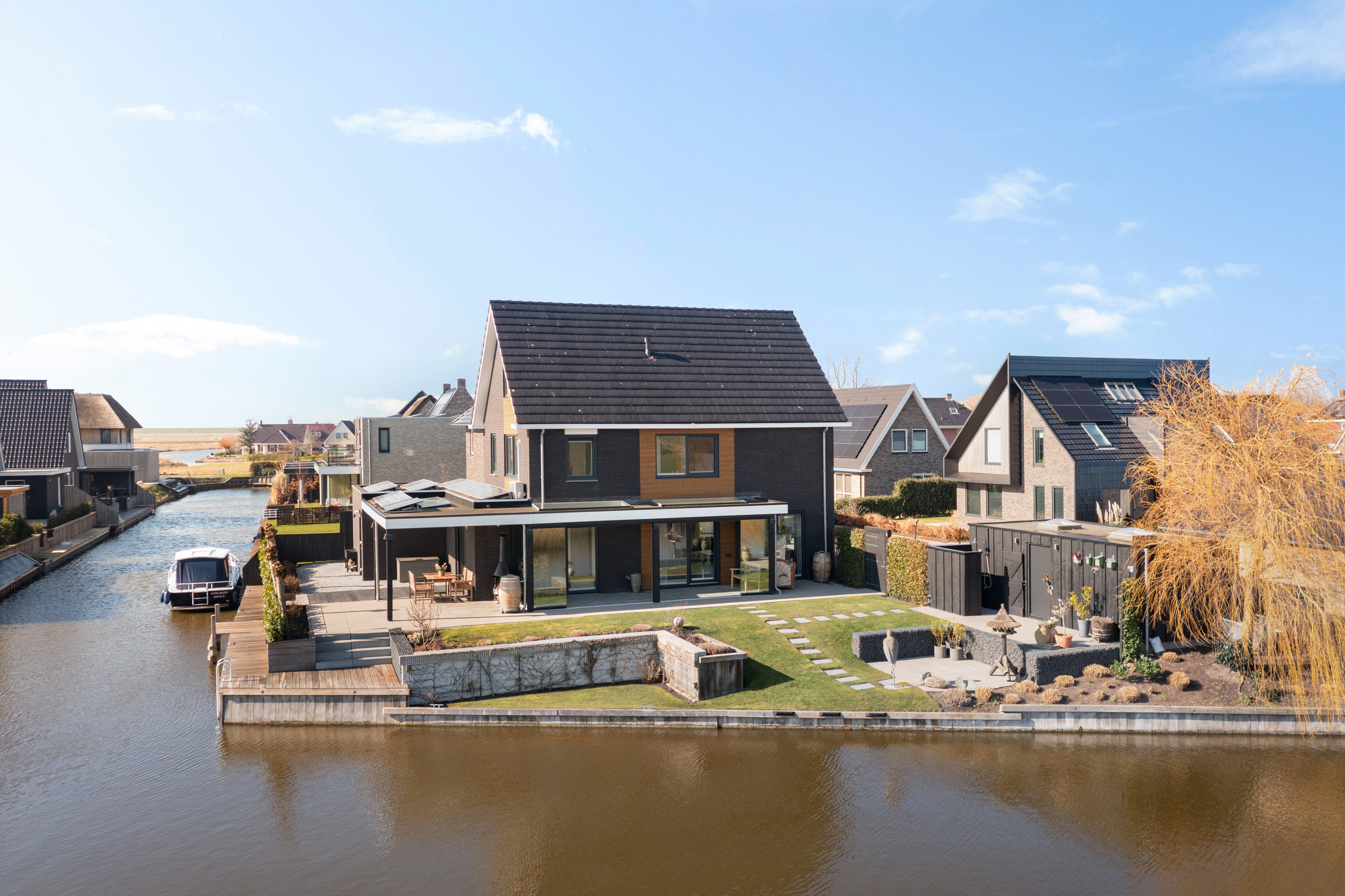 Thanks to the corner location on the water, the property enjoys a generous sun deck flanked by two luxury mooring docks, one with a swimming ladder. The enclosed stylish outdoor shower is a welcome addition for swimmers. The water in front of the property is calm, partly private, and connects directly to the Bolswardervaart.
