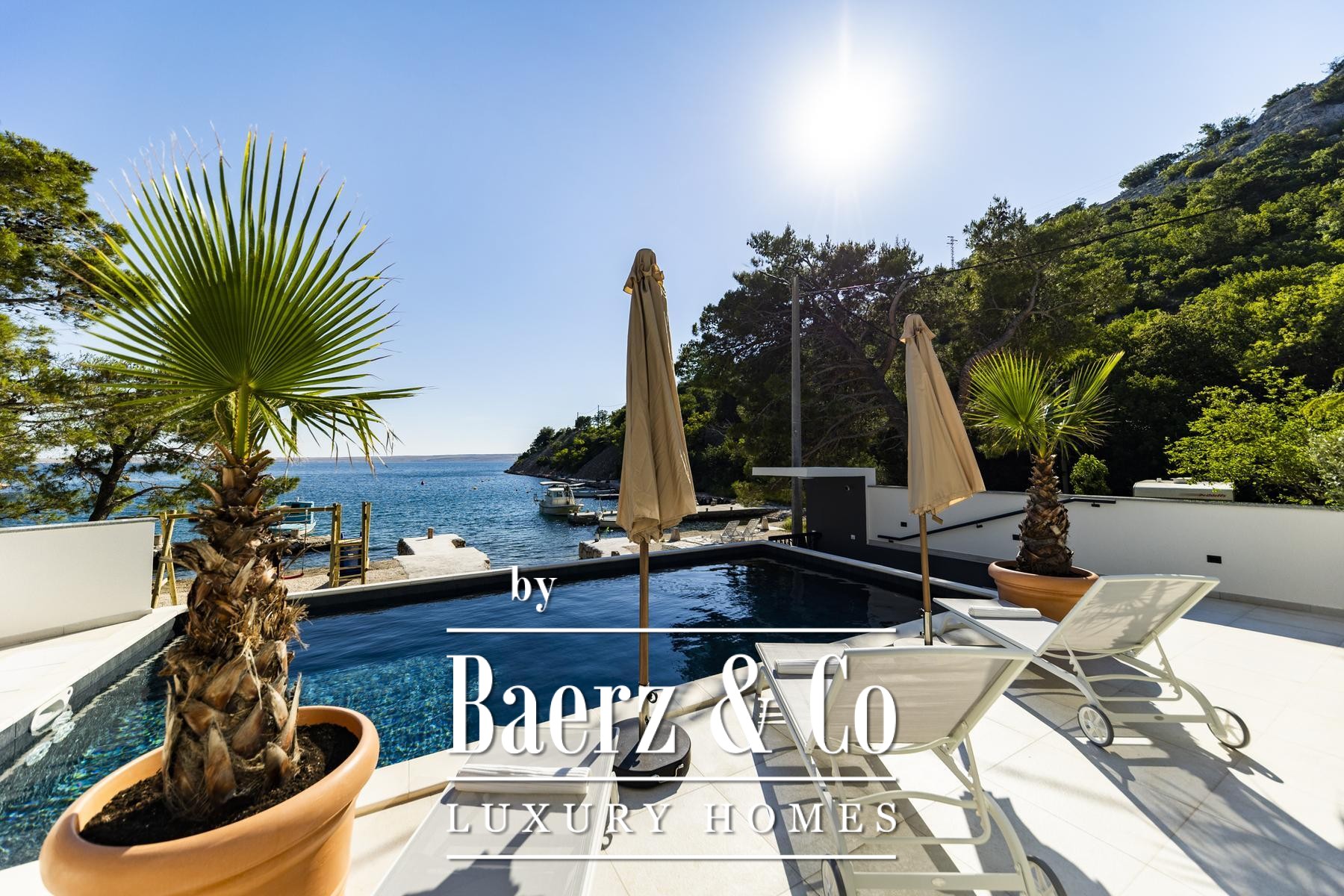 Expansive glass, triple-layered and well insulated, draws in light and frames the Adriatic, while underfloor heating and a fireplace ensure year-round warmth and calm. The main living space, elegantly proportioned, flows into a modern kitchen curated for both ease and sophistication. Outdoor areas invite languid afternoons beside the 32 m² seawater pool, in the jacuzzi, sauna, or at the private gym, with direct access to the sea and a pier that includes a boat slipway system for yacht owners.