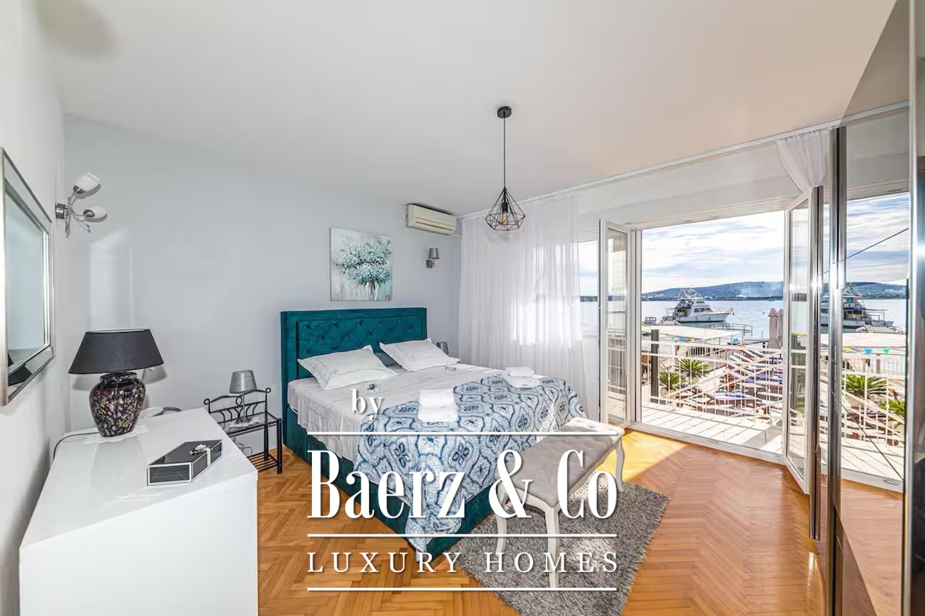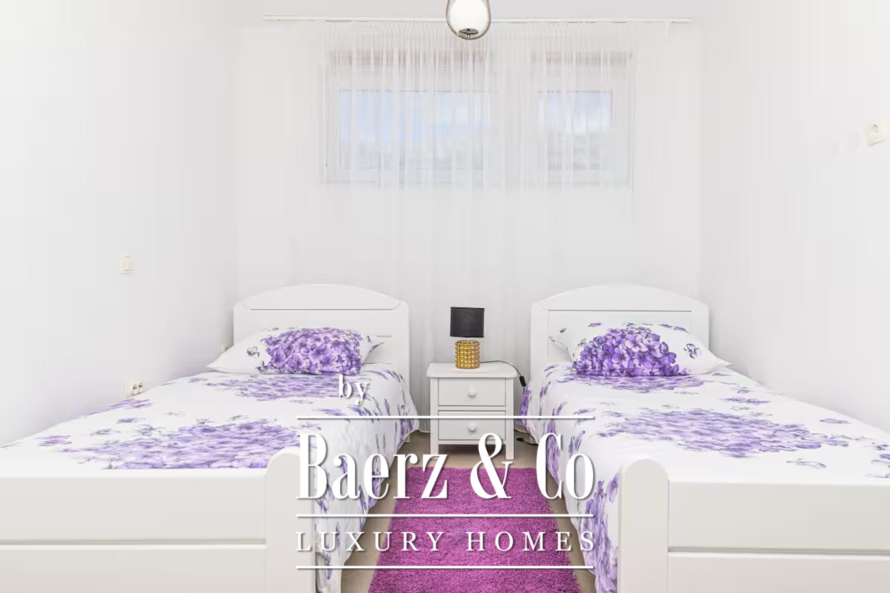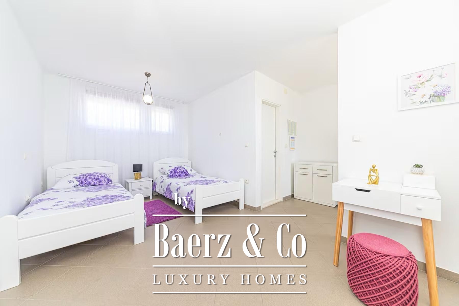 Kaštel Sućurac, a beautiful house with a private pool in the first row to the sea.It is located on a fenced plot of 739 m2 and is divided into four floors.In the basement there is a garage with a parking space, a storage room and an air-conditioned section with fitness equipment, table tennis and billiards.The ground floor has three bedrooms, two bathrooms, a kitchen with a dining room, a living room and a spacious terrace with outdoor furniture for socializing.On the first floor of the building there is a two-bedroom apartment of 88 m2 in the unfinished
