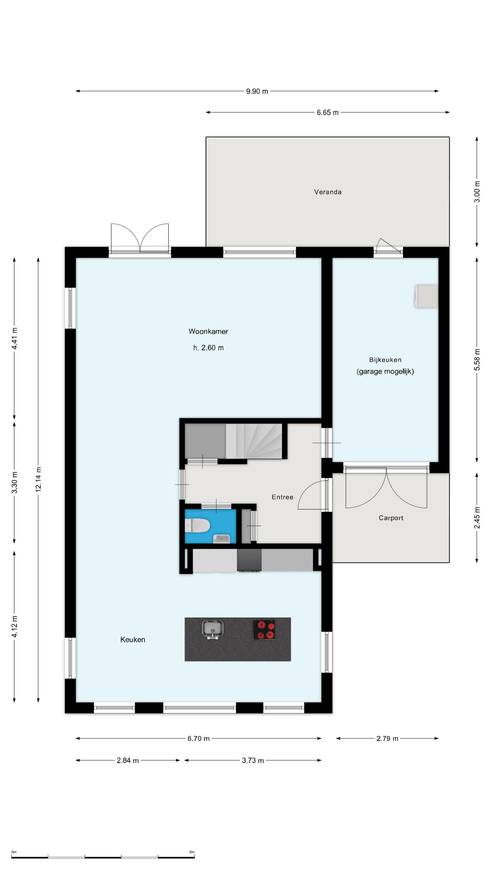 Through the entrance, you enter the hall with meter cupboard, toilet, and staircase to the upper floor. From the hall, you have access to the spacious and bright living room, located at the rear of the house, with French doors opening onto the veranda and garden.