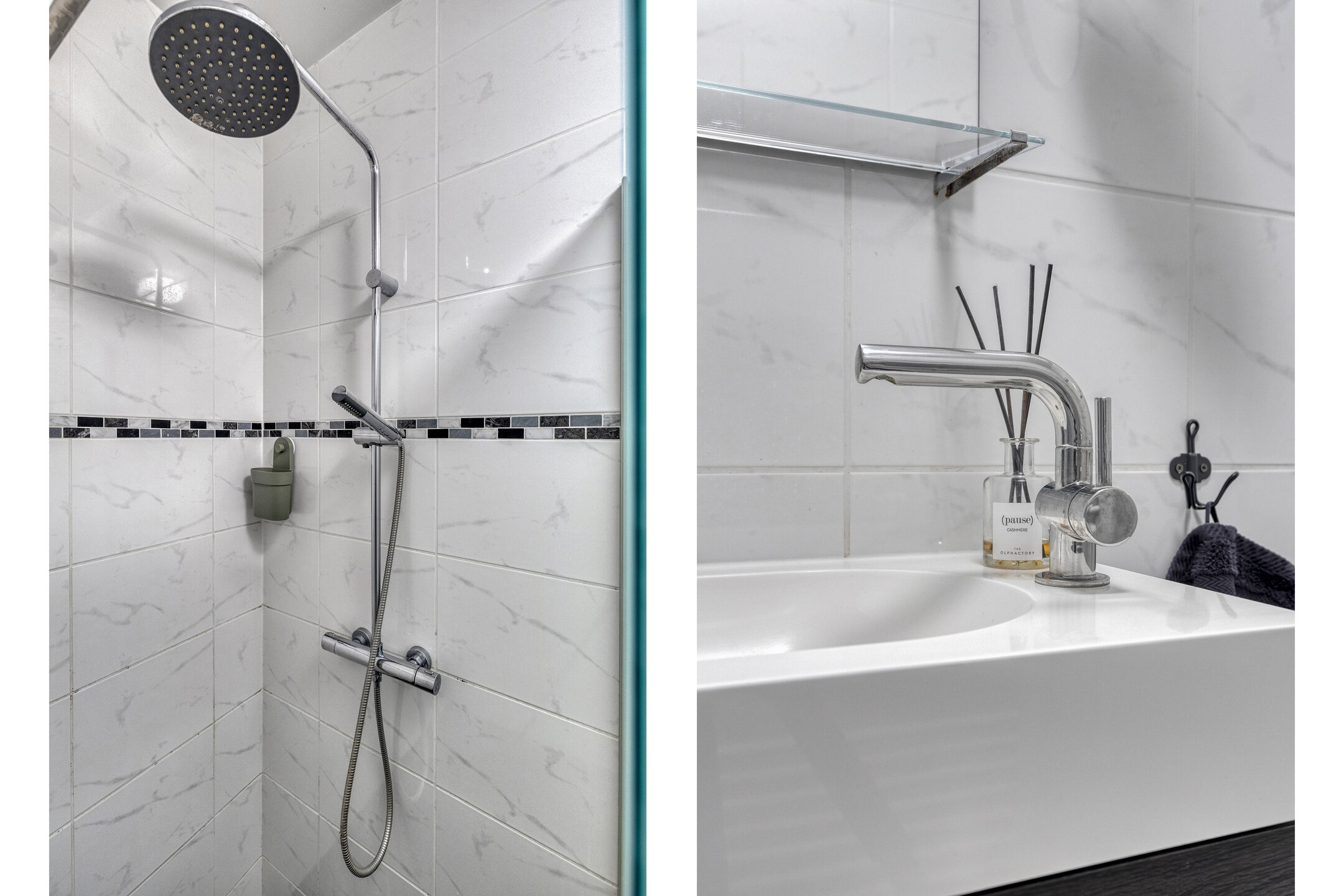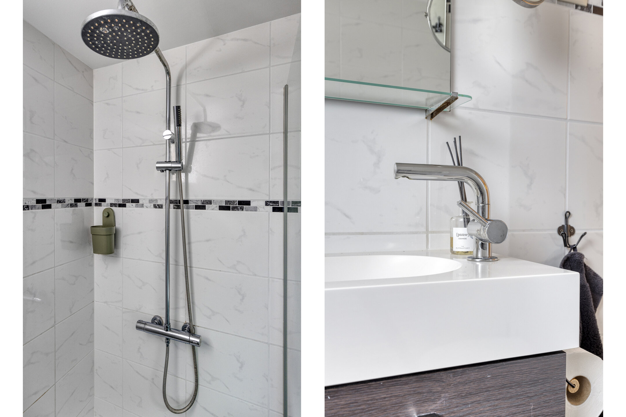 The layout is playful and spacious, spread over several levels. A private entrance at street level leads to the basement, which offers practical space and storage. The living floors contain the kitchen, several bedrooms, and bathrooms, connected by hallways and landings that create a pleasant flow throughout the home. On the top floor, there is a bedroom with direct access to the roof terrace, a wonderful spot offering privacy and views of the historic buildings. There is also a mezzanine that is ideal as a workspace, studio, or additional living space.