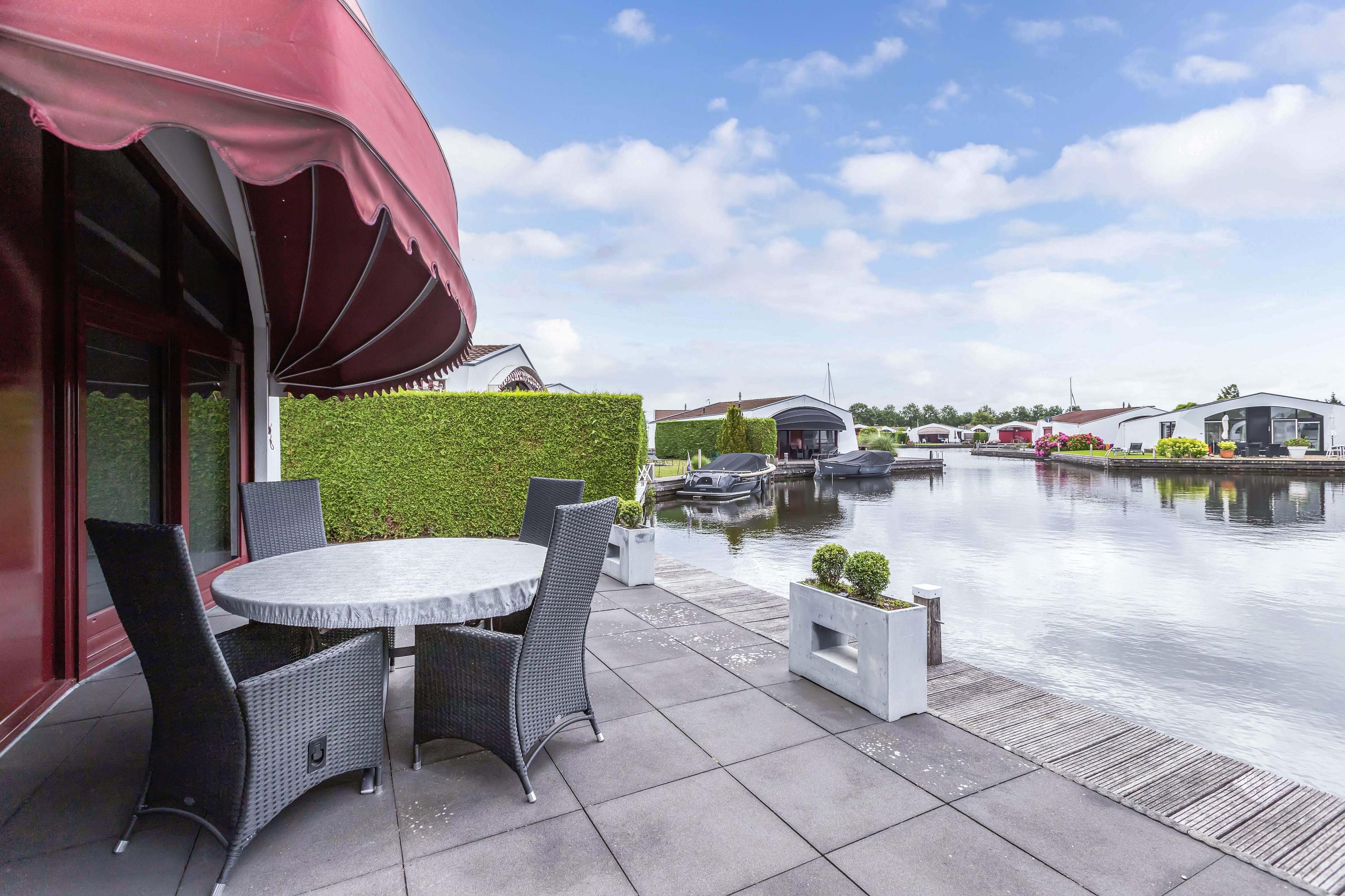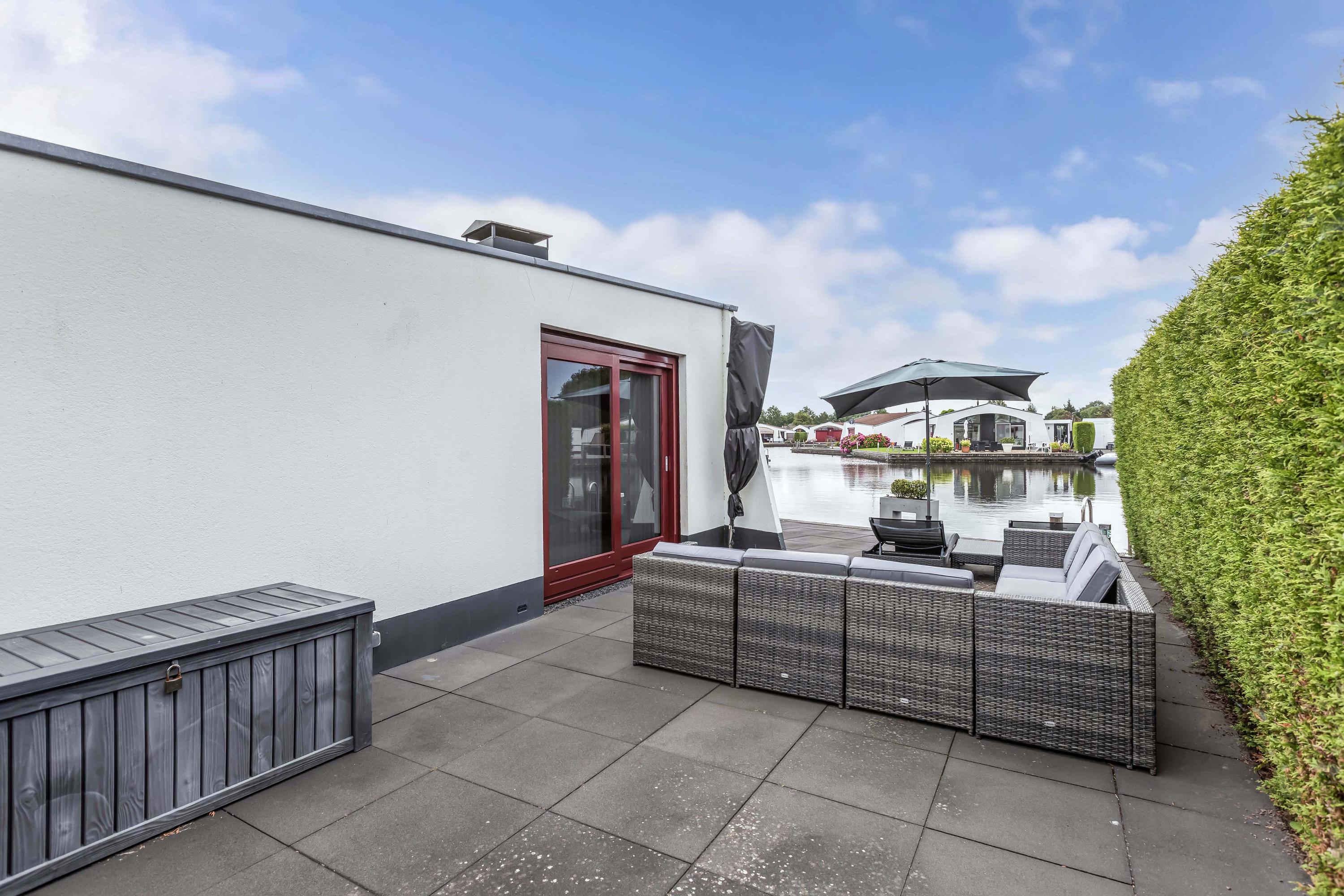 The garden is low-maintenance and features multiple terraces. Thanks to its south-facing position along the water, you benefit optimally from sunlight and natural light throughout the day. Whether you wish to enjoy a peaceful breakfast by the water in the morning or drinks in the sheltered evening sun, there is always a perfect spot to be found.