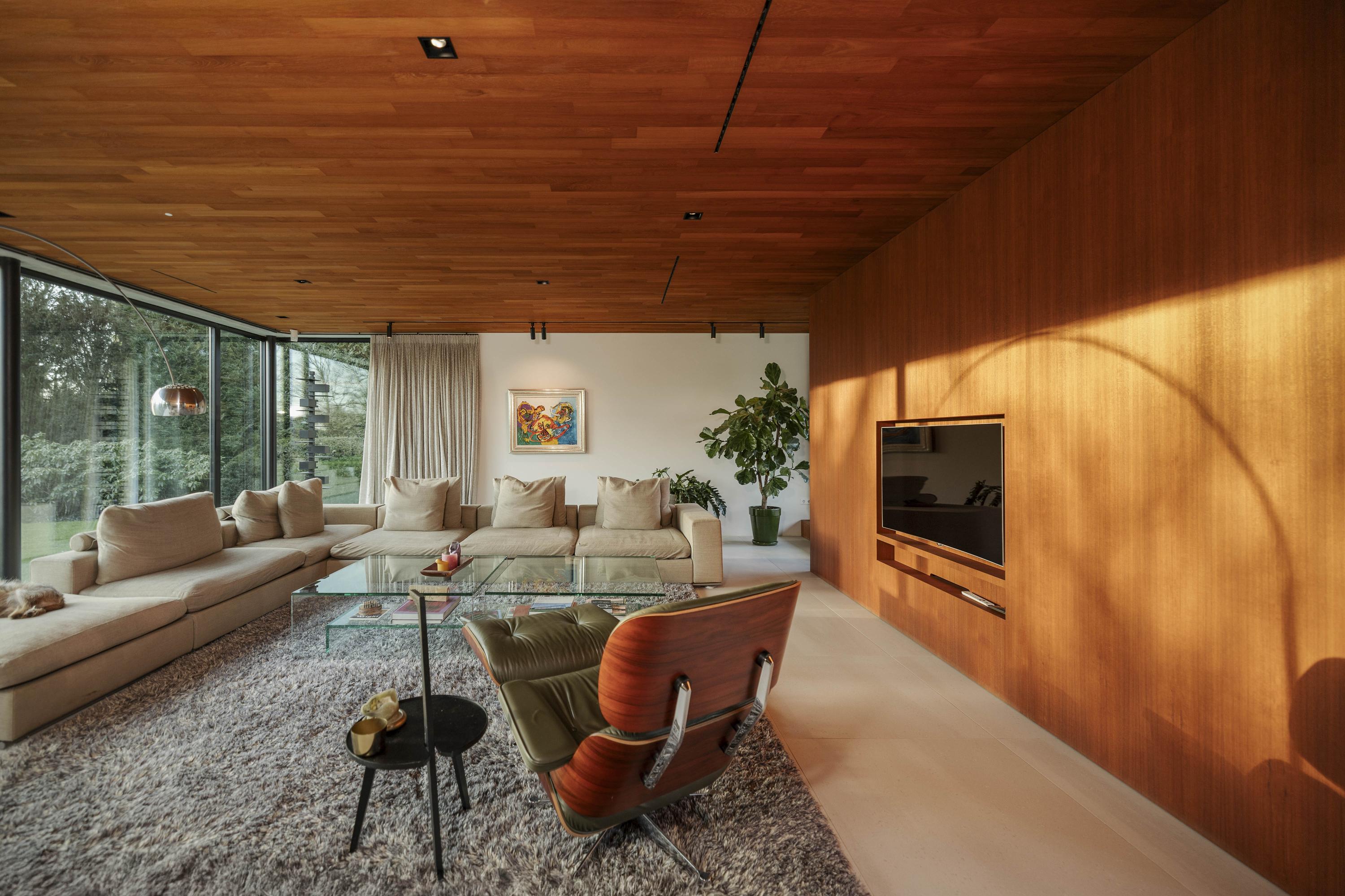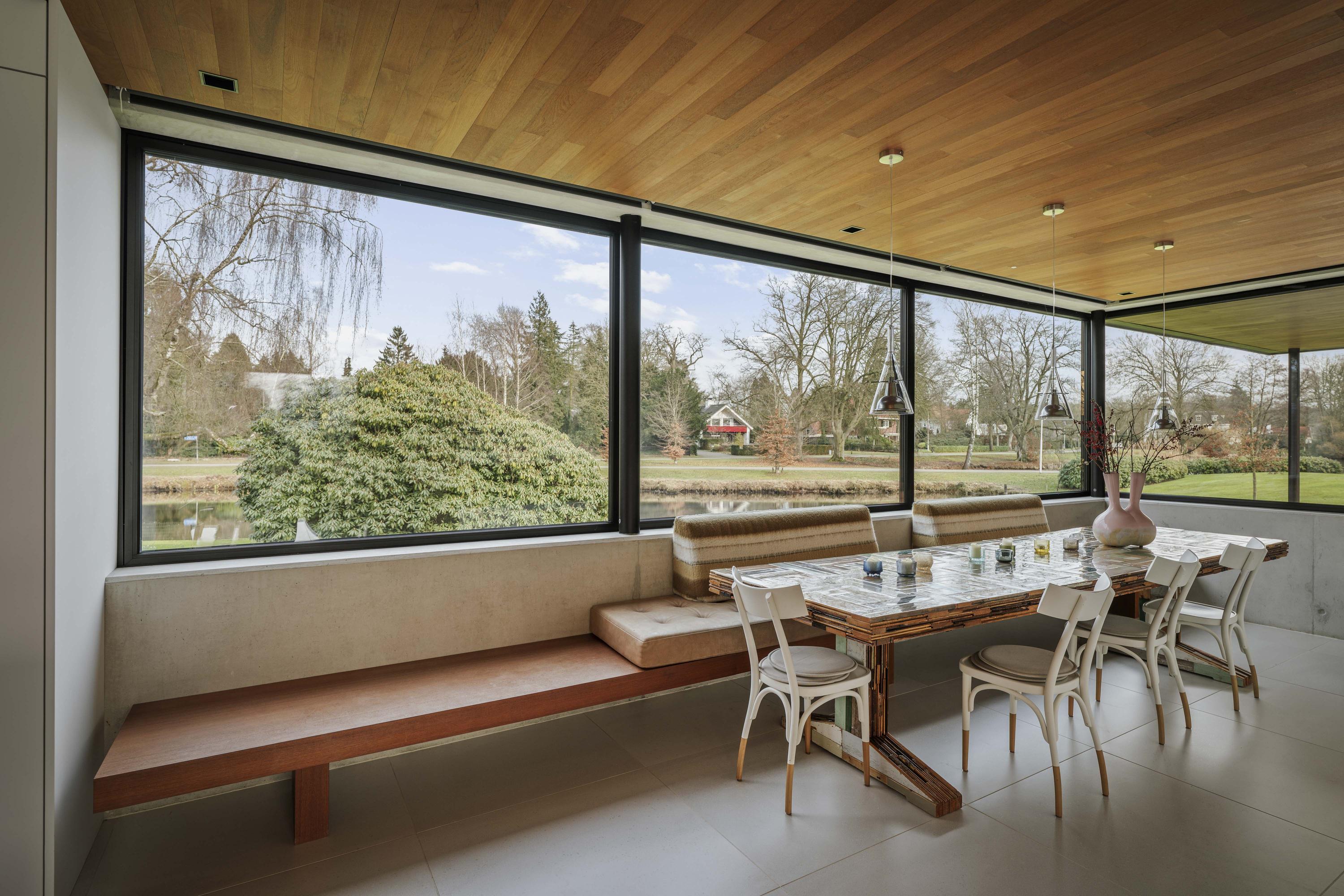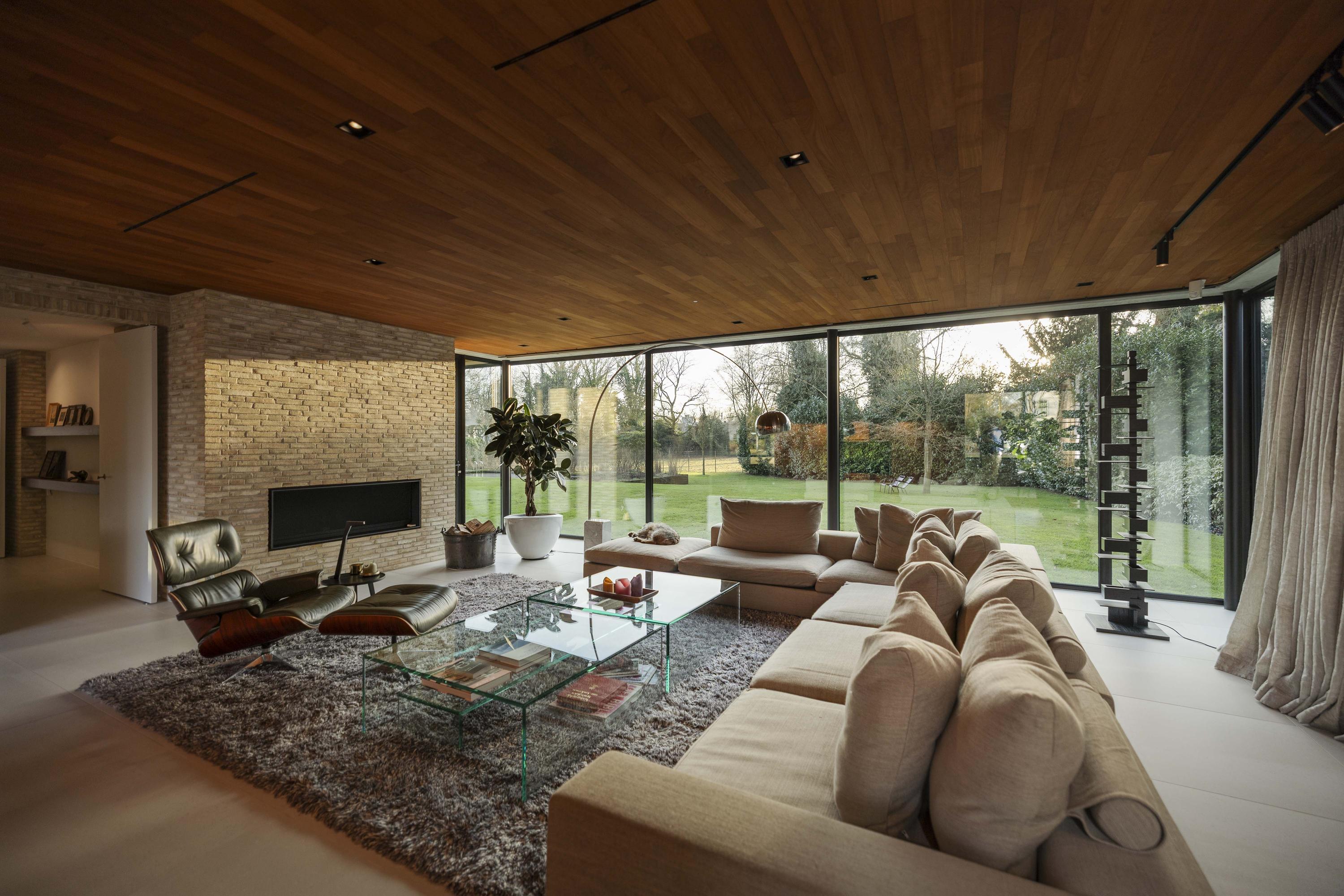 The living room (74 m²) is spacious and divided into two seating areas by a room divider with an integrated television and bookcase. At the rear, floor-to-ceiling windows offer views of the garden, while at the front, the ponds come into view, with sufficient privacy thanks to the half-height parapet. A wide Metalfire fireplace and a raised teak floor area at the front give the room extra character. The sophisticated lighting plan ensures that art and architectural lines are shown to their best advantage.