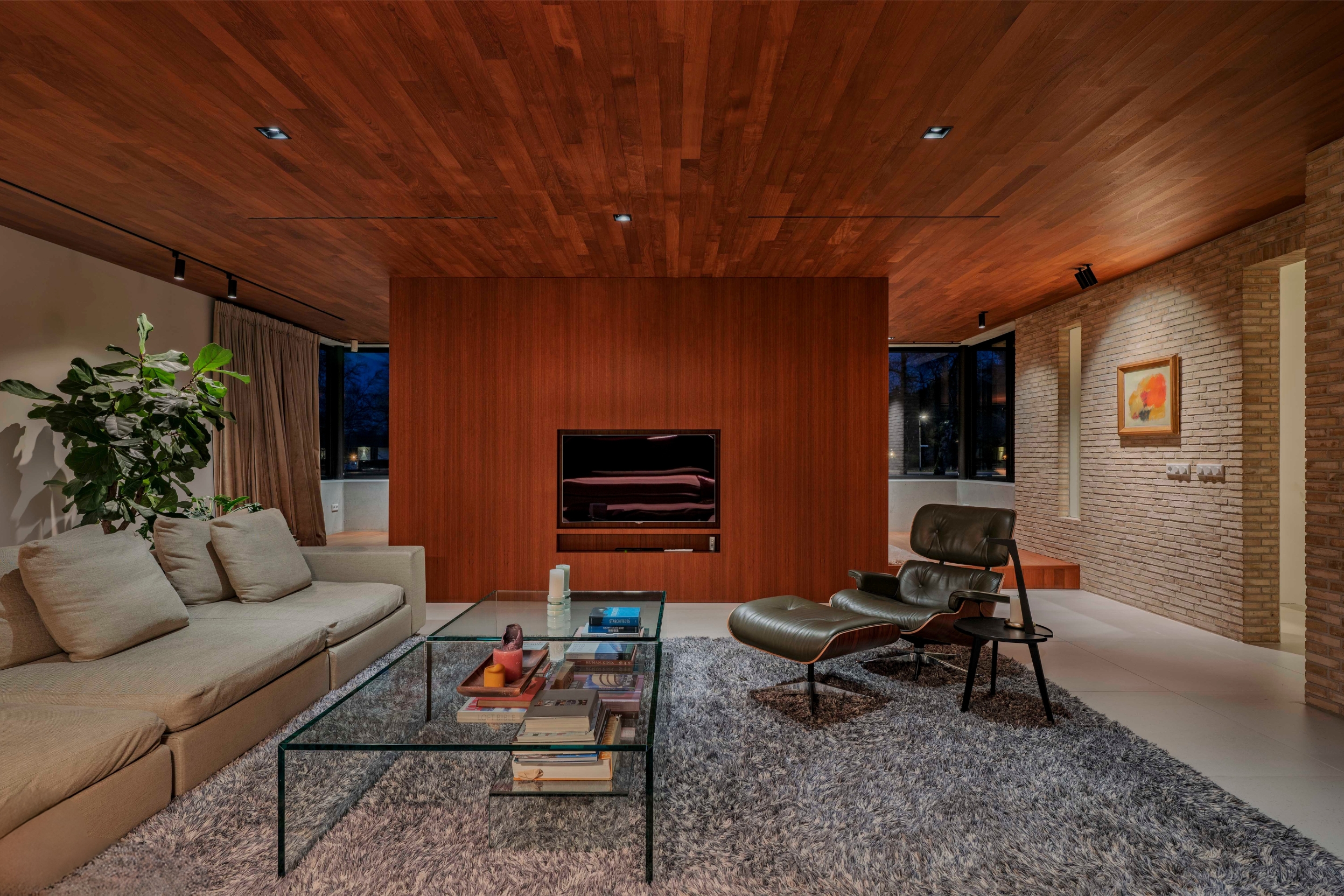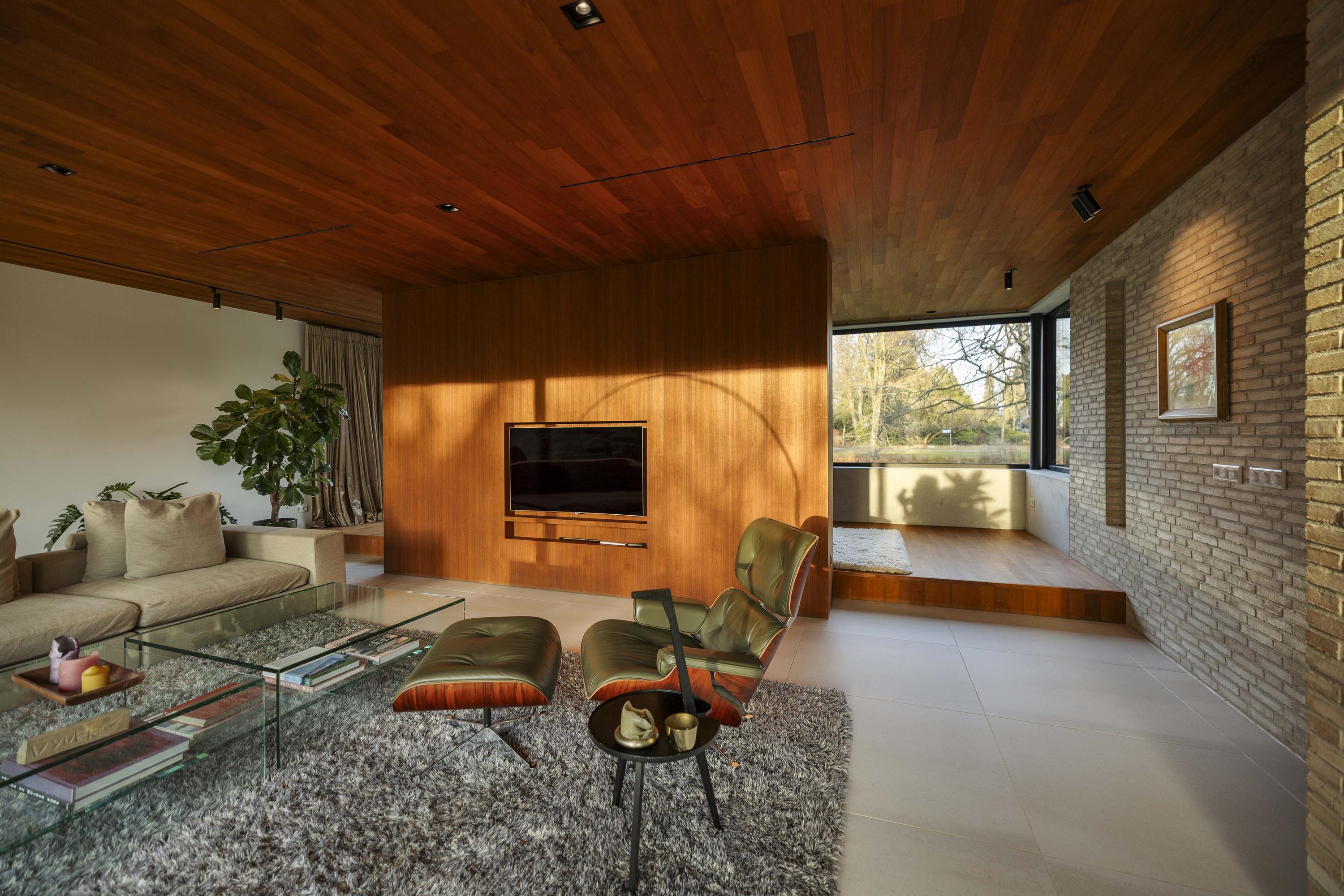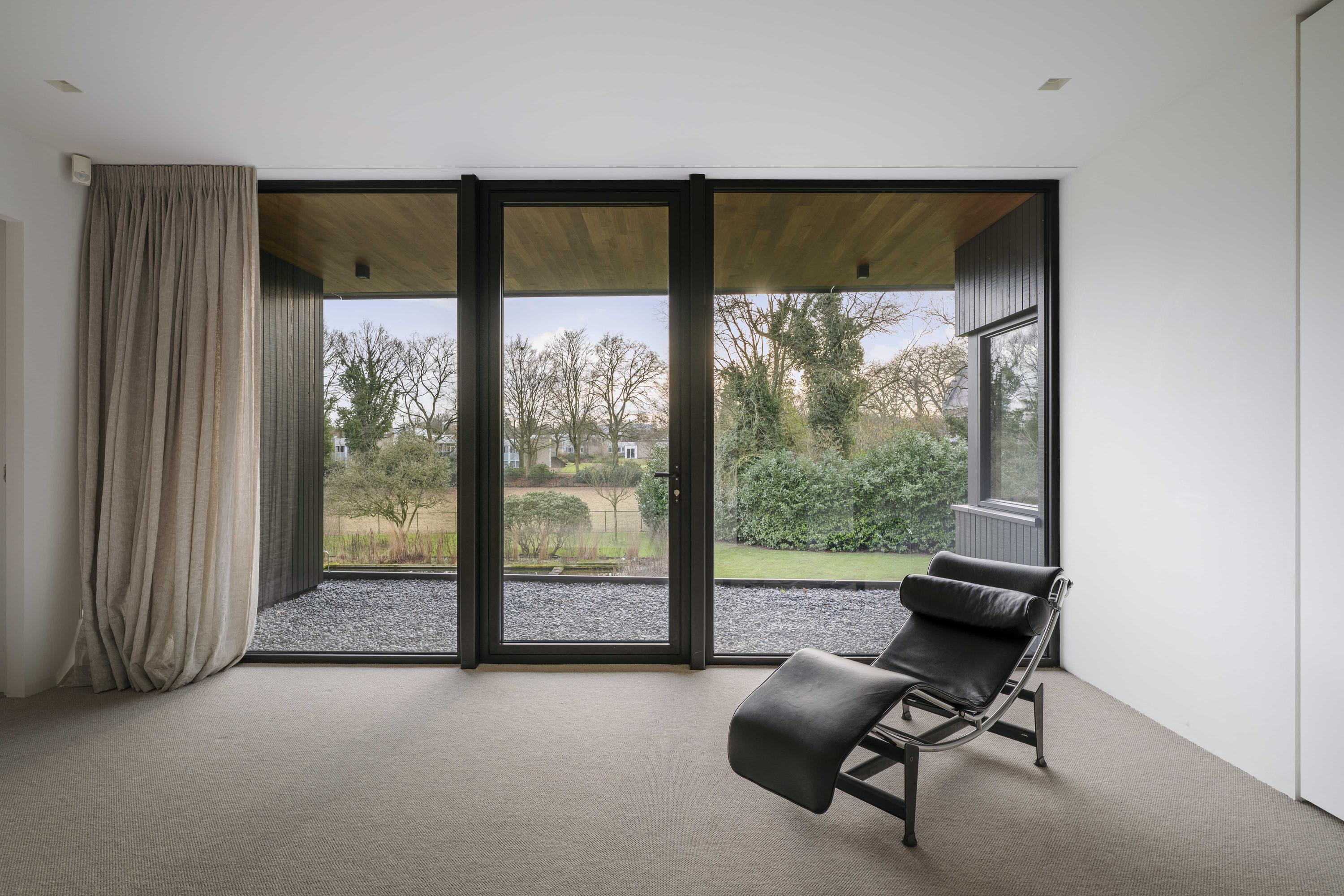 The living room (74 m²) is spacious and divided into two seating areas by a room divider with an integrated television and bookcase. At the rear, floor-to-ceiling windows offer views of the garden, while at the front, the ponds come into view, with sufficient privacy thanks to the half-height parapet. A wide Metalfire fireplace and a raised teak floor area at the front give the room extra character. The sophisticated lighting plan ensures that art and architectural lines are shown to their best advantage.