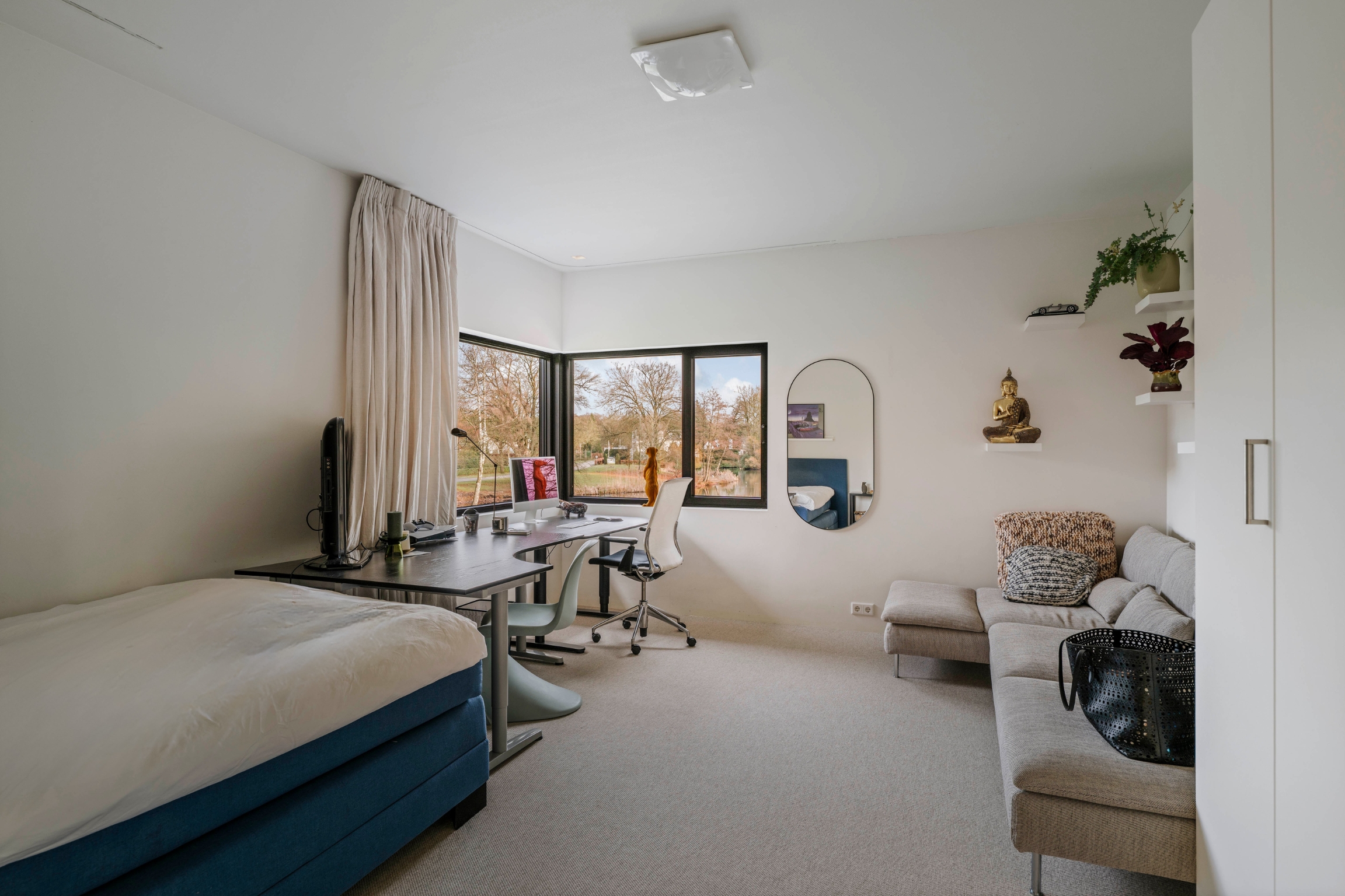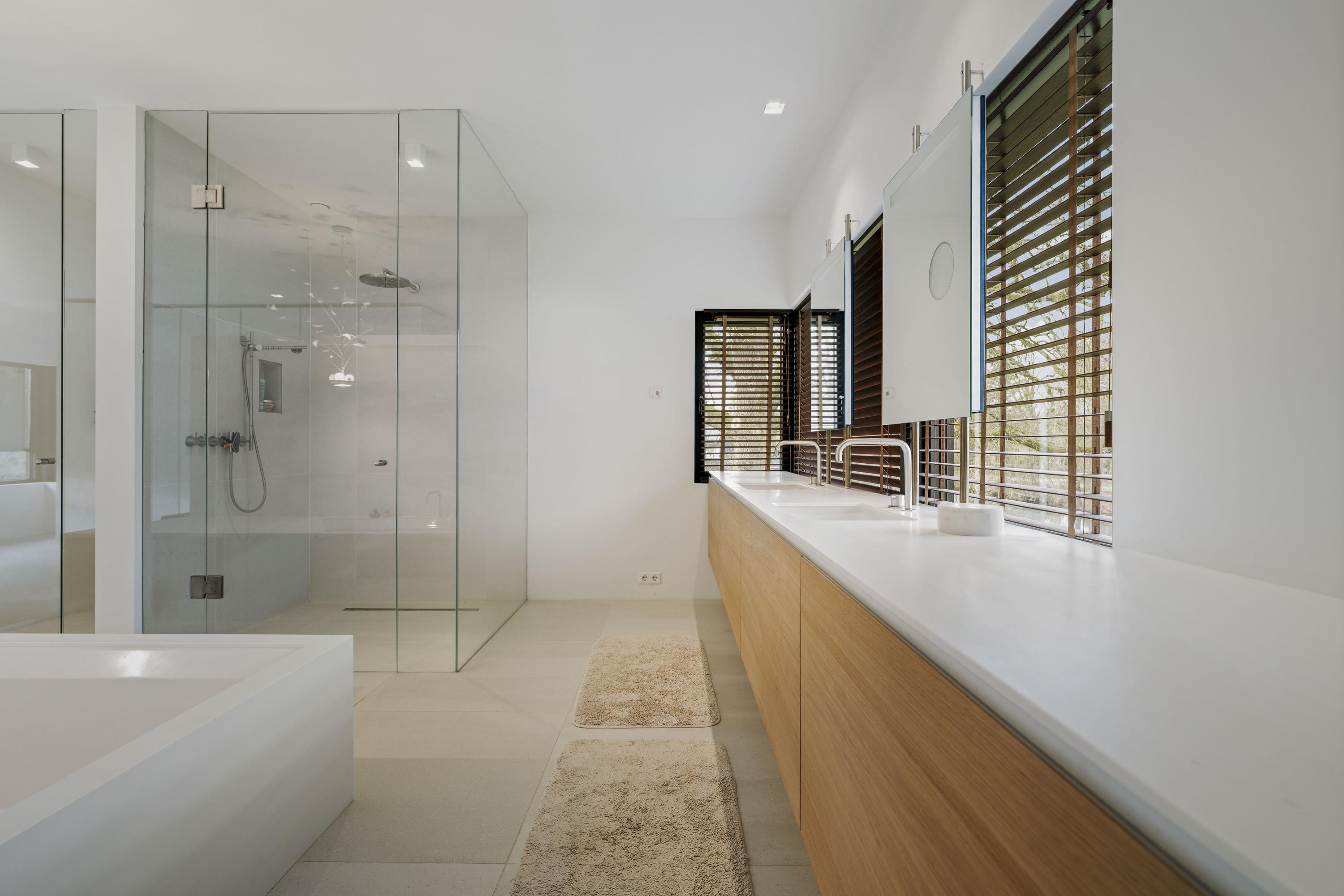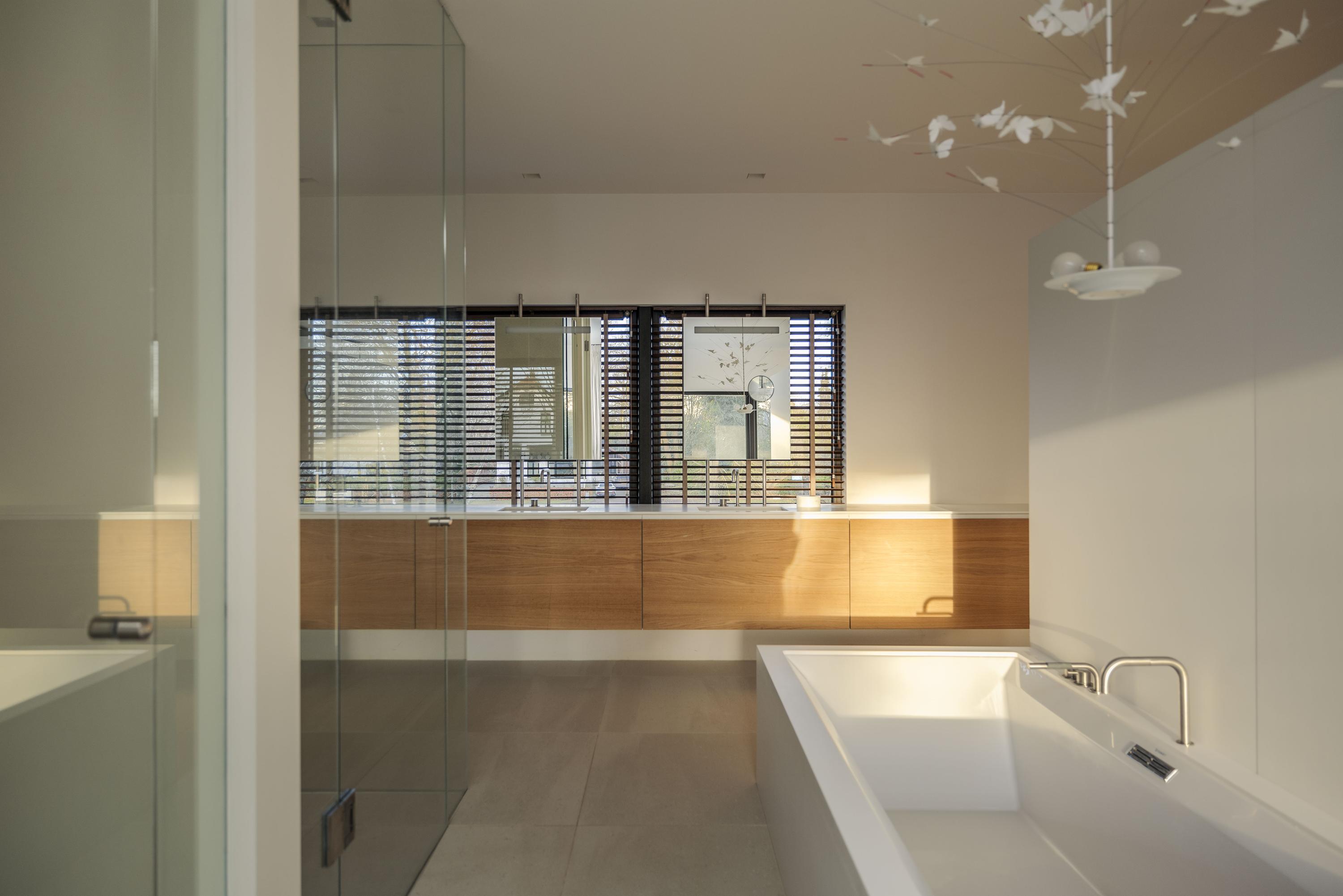 The first floor has four spacious bedrooms and two bathrooms. The master bedroom, measuring approximately 45 m², has windows on both sides and is equipped with spacious built-in (wardrobe) cupboards. The en-suite bathroom has a freestanding bathtub, a spacious walk-in shower, double sink, dressing table and toilet. The other bedrooms are also generously sized and all enjoy views of the ponds or deer park. One bedroom has its own shower and sink. There is also a second bathroom with a bath, walk-in shower and double washbasin, as well as a separate toilet on the landing.