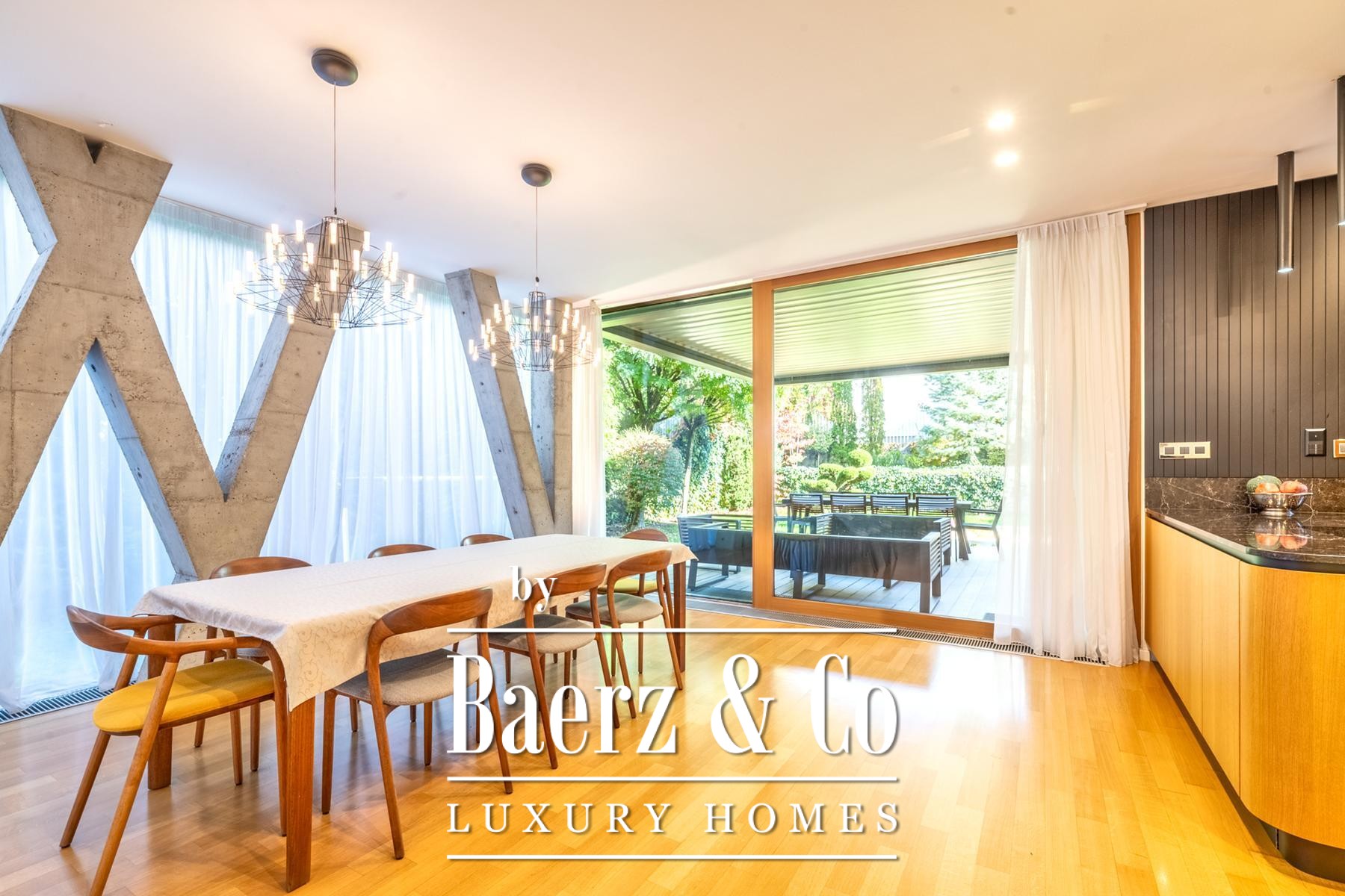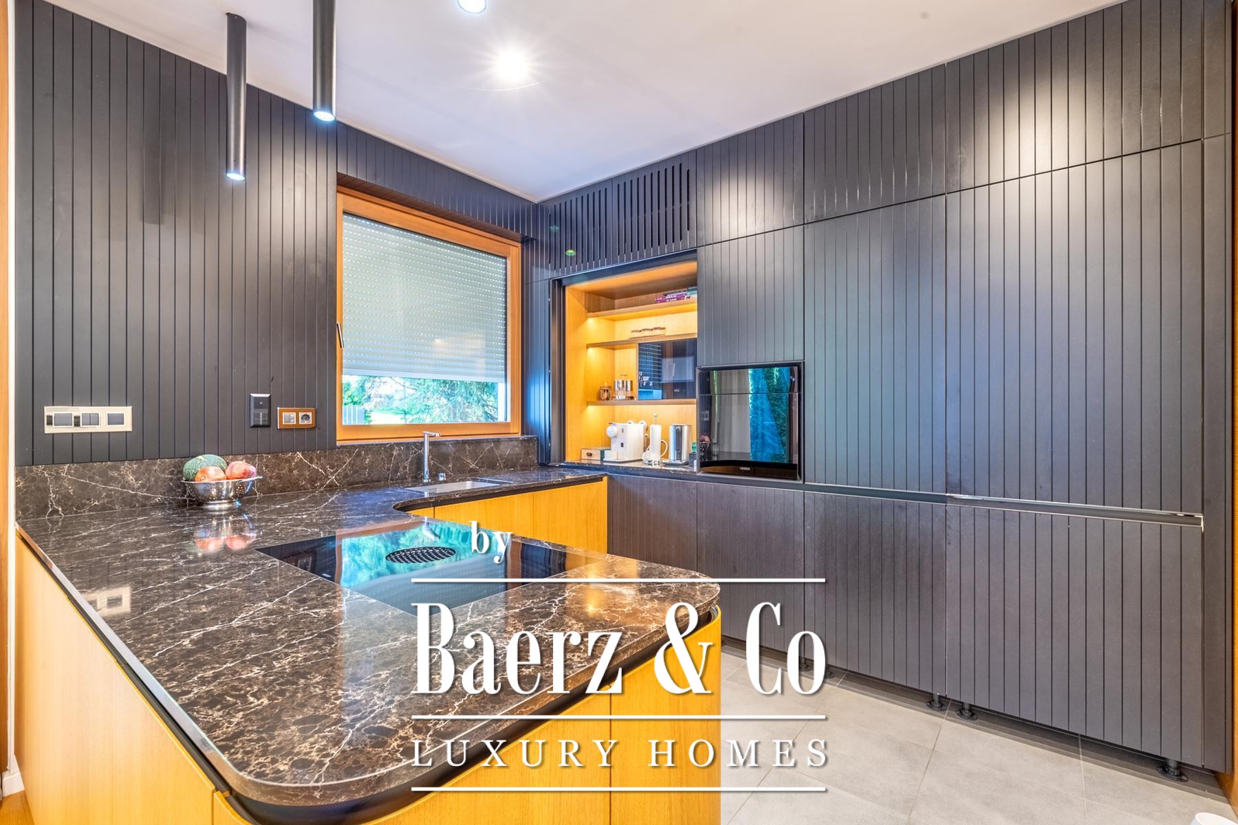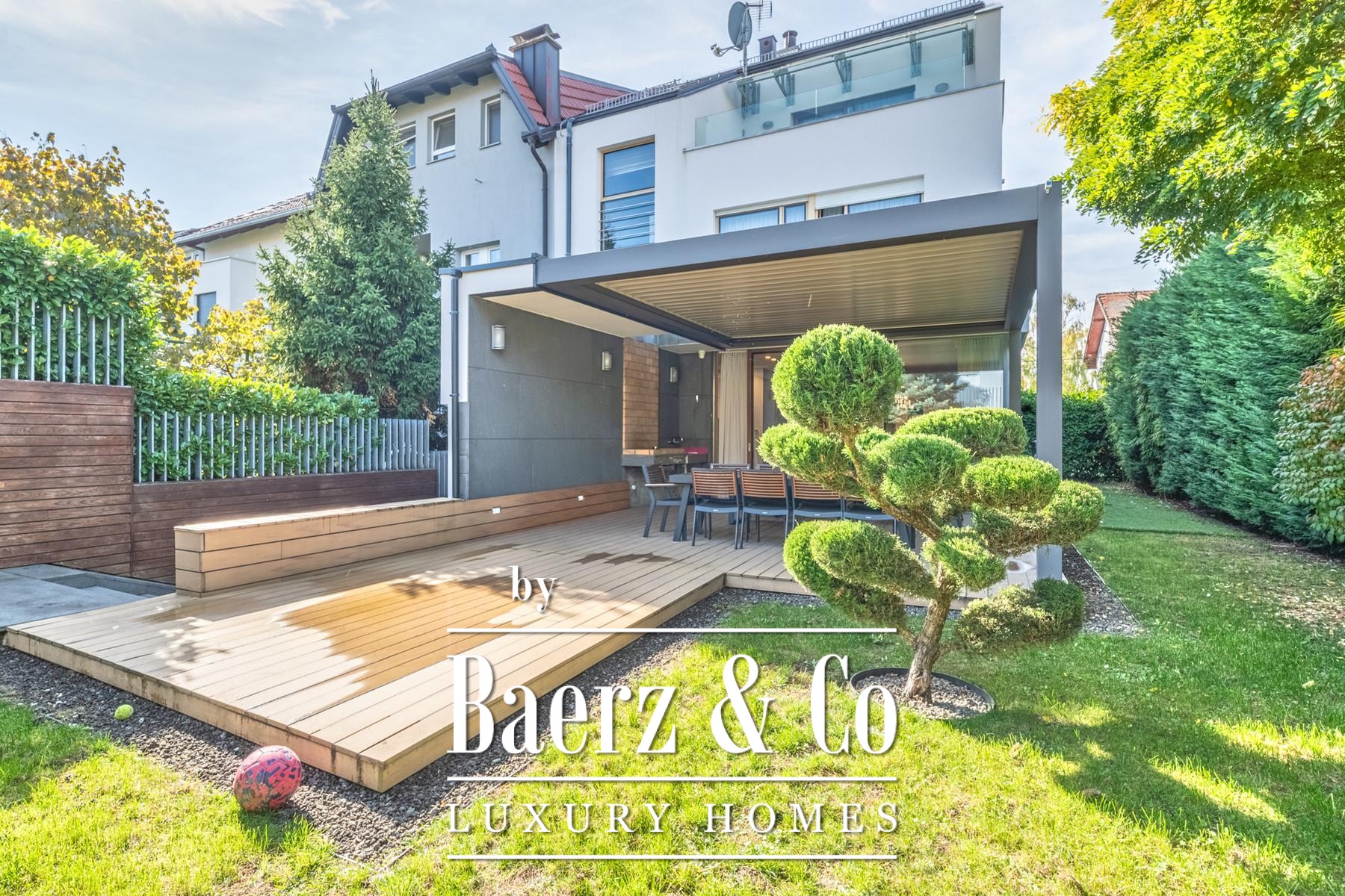 and a terrace of 15 m2 with a view of the greenery of the garden extends over the entire floor.Extremely pleasant property with lots of daylight, surrounded by greenery, its positioning guarantees peace and privacy. High-quality concrete construction, gas central heating Buderus boiler, fan coils with glass walls, Daikin air conditioning, central vacuum, a pipe system (laundry tunnel) is connected to the laundry room from each floor, Miele dryers and washing machines, new Silvelox burglar and garage doors.It is being sold fully furnished and equipped with designer furniture, state-of-the-art kitchen equipped with BORA appliances, Artisan dining room and seating area, Coppelia chandelier, Foscarini lamp, Vileroy & Boch and Duravit sanitary ware