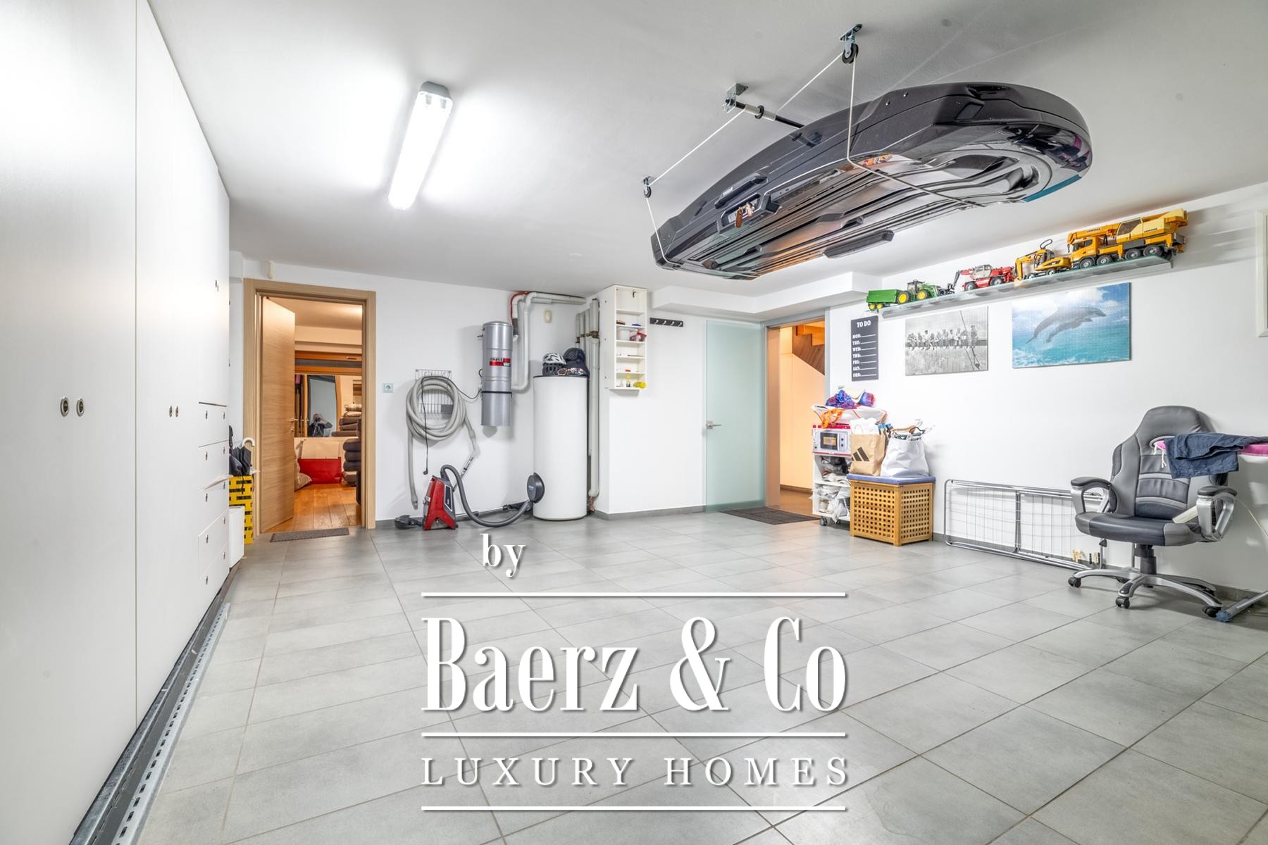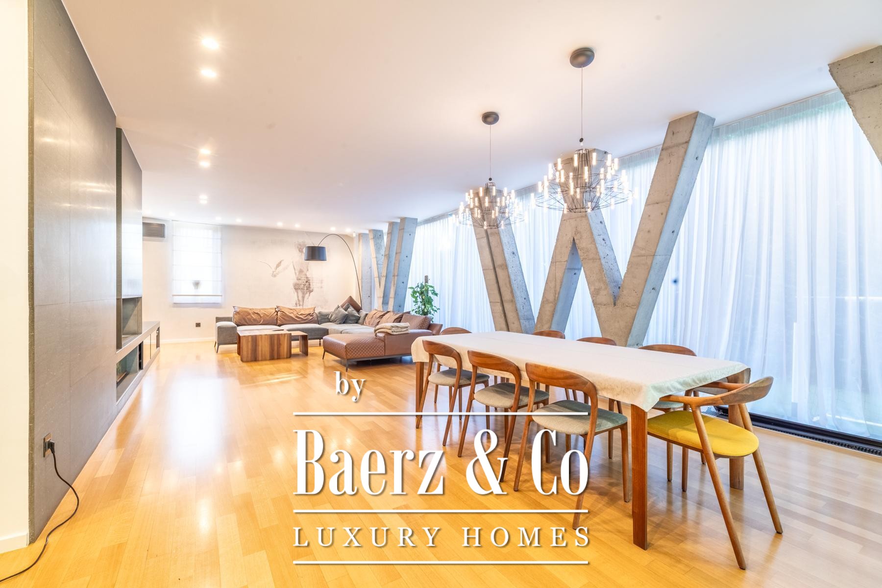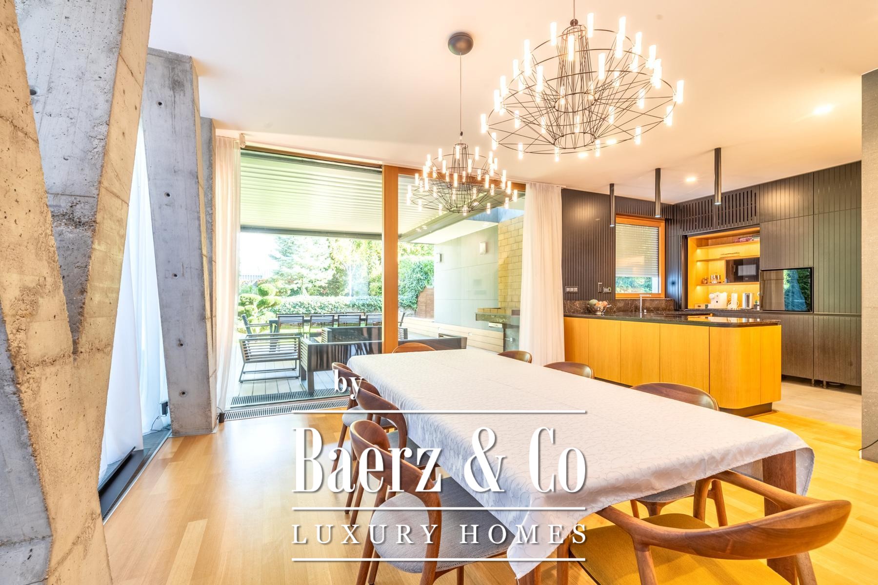 and a terrace of 15 m2 with a view of the greenery of the garden extends over the entire floor.Extremely pleasant property with lots of daylight, surrounded by greenery, its positioning guarantees peace and privacy. High-quality concrete construction, gas central heating Buderus boiler, fan coils with glass walls, Daikin air conditioning, central vacuum, a pipe system (laundry tunnel) is connected to the laundry room from each floor, Miele dryers and washing machines, new Silvelox burglar and garage doors.It is being sold fully furnished and equipped with designer furniture, state-of-the-art kitchen equipped with BORA appliances, Artisan dining room and seating area, Coppelia chandelier, Foscarini lamp, Vileroy & Boch and Duravit sanitary ware