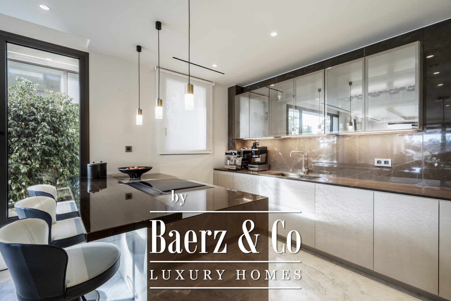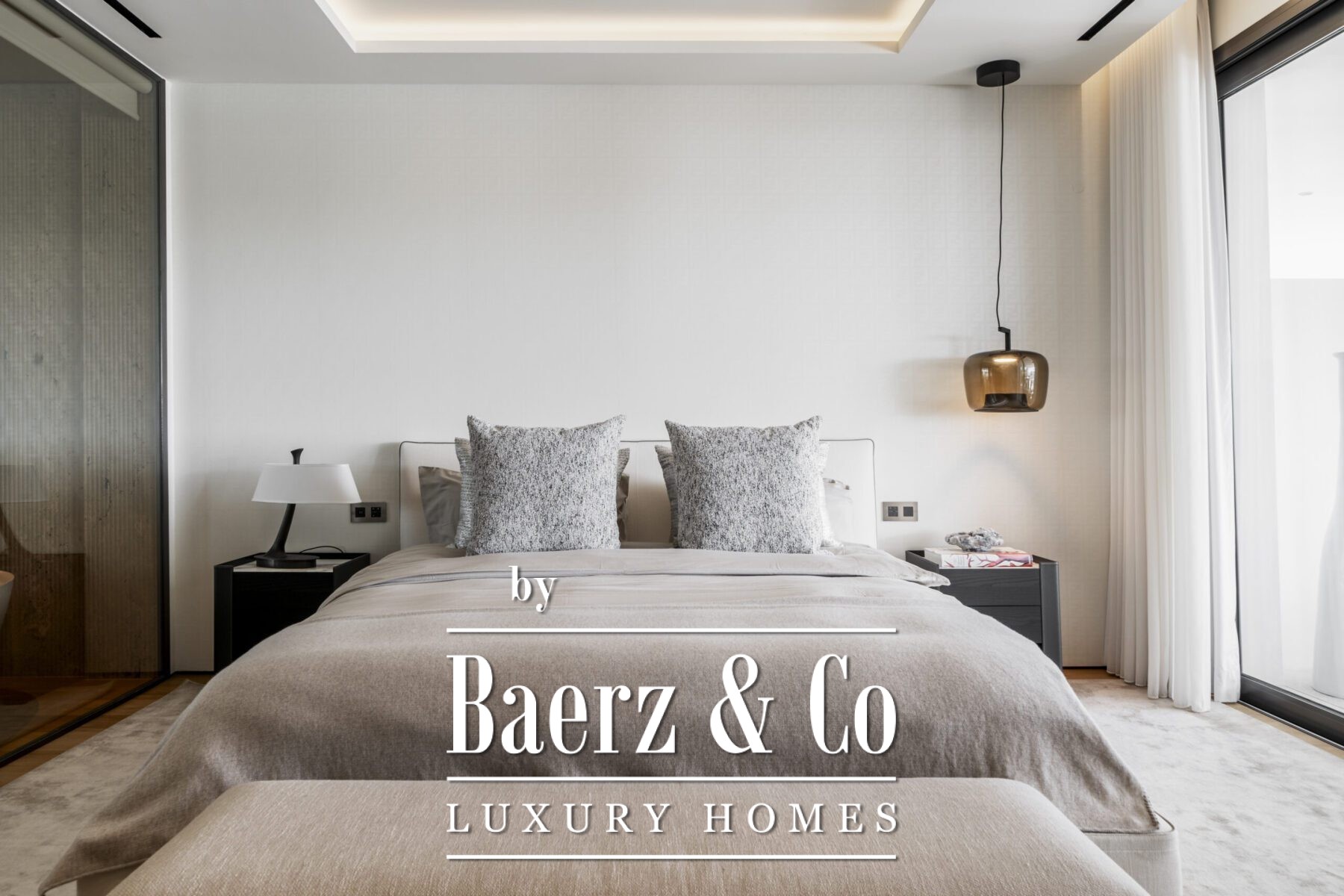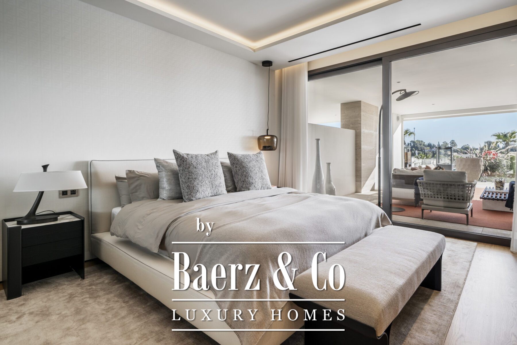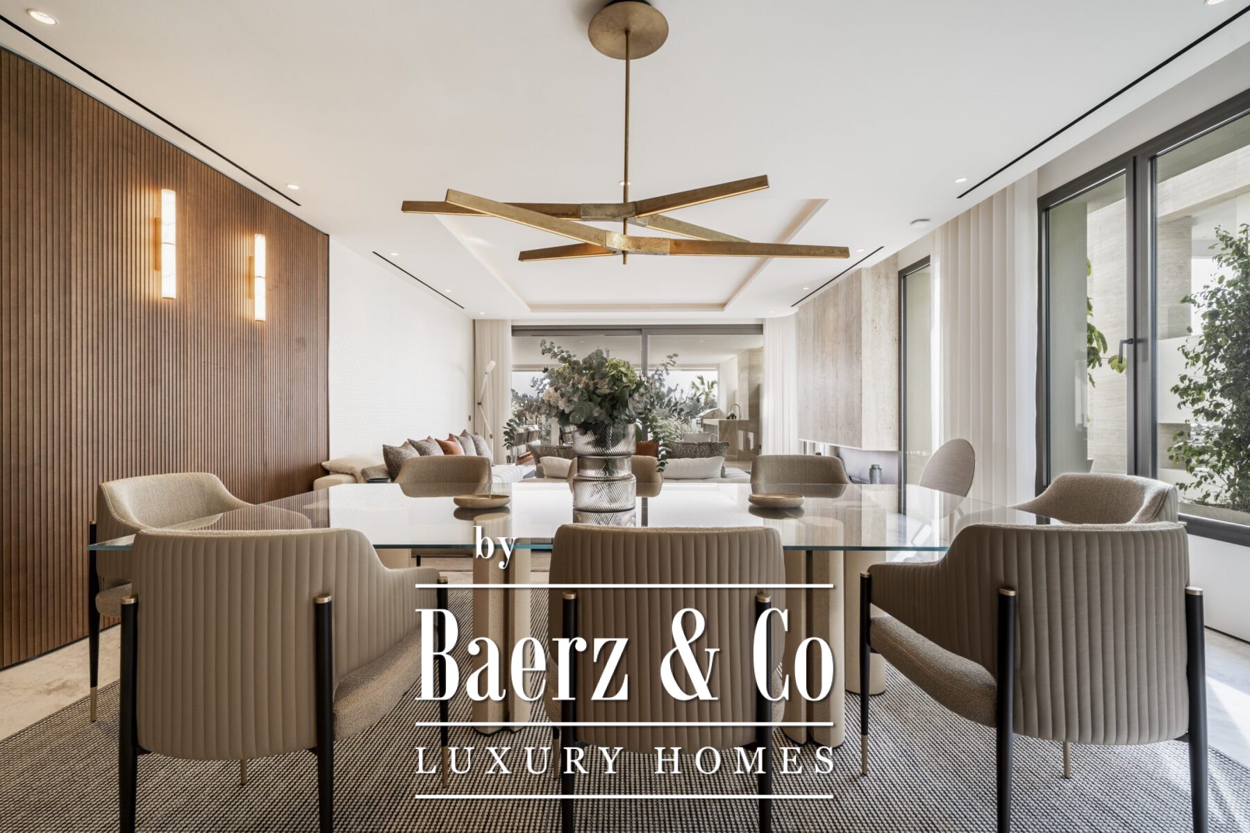 Inside, a bespoke duplex features floor-to-ceiling windows and five spacious en-suite bedrooms—three on the main level and two on the lower floor—with a separate entrance from the garage for enhanced circulation and privacy. The open-plan kitchen, seamlessly integrated with the living area, extends to a generous terrace furnished by Minotti, which includes a heated chill-out zone, a dining area, and a fully equipped outdoor kitchen. Stunning views stretch over the pool, with the Mediterranean to one side and La Concha to the other. Automatic curtains provide an added layer of seclusion.