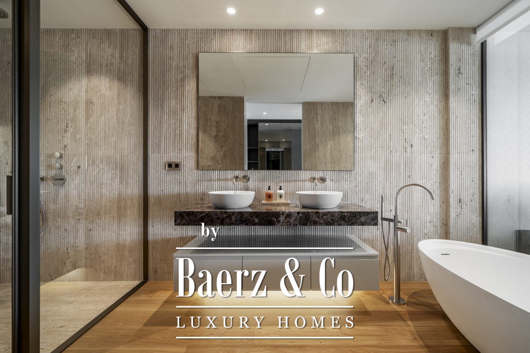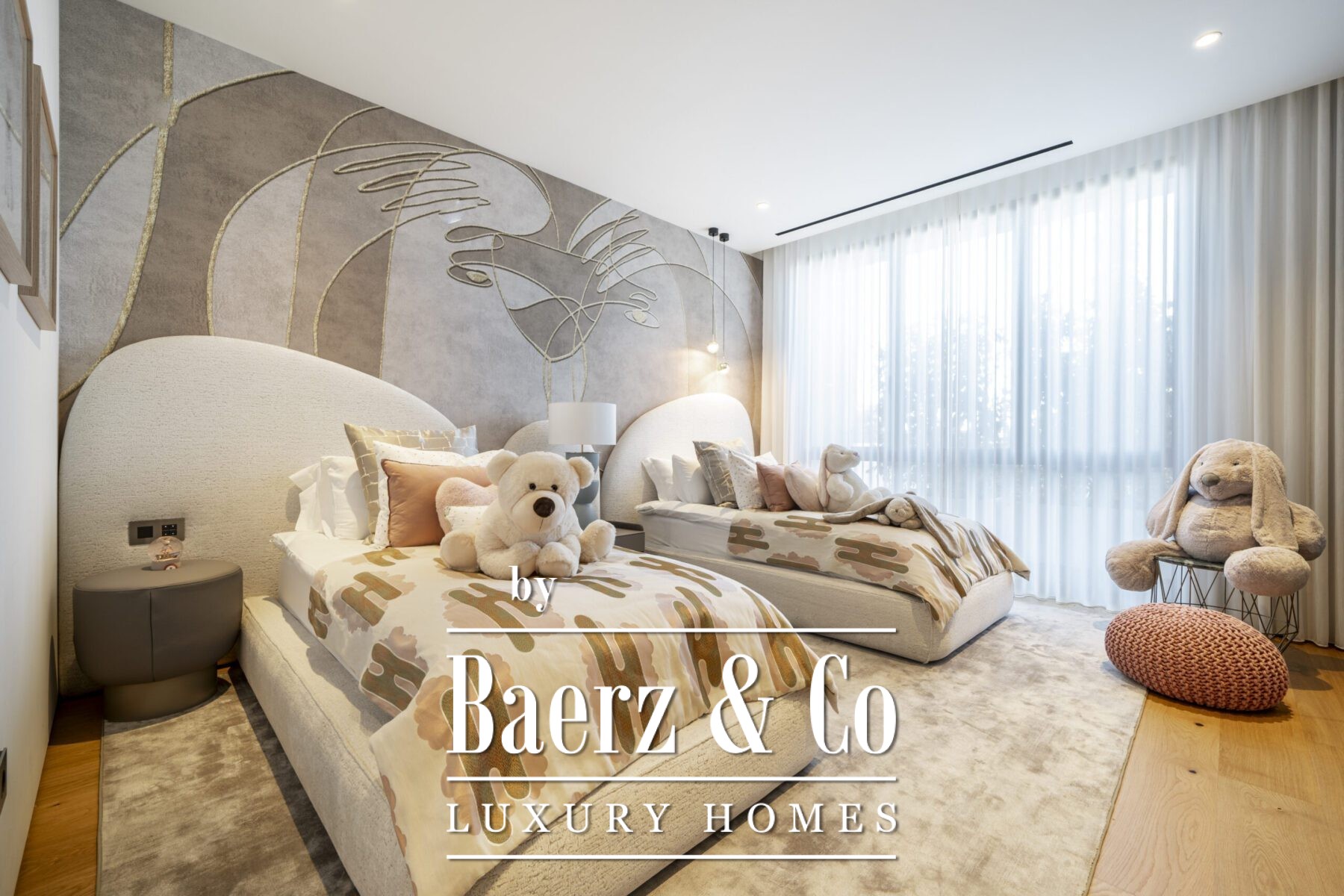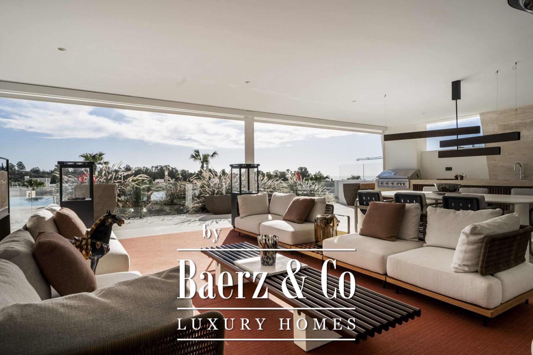 Inside, a bespoke duplex features floor-to-ceiling windows and five spacious en-suite bedrooms—three on the main level and two on the lower floor—with a separate entrance from the garage for enhanced circulation and privacy. The open-plan kitchen, seamlessly integrated with the living area, extends to a generous terrace furnished by Minotti, which includes a heated chill-out zone, a dining area, and a fully equipped outdoor kitchen. Stunning views stretch over the pool, with the Mediterranean to one side and La Concha to the other. Automatic curtains provide an added layer of seclusion.