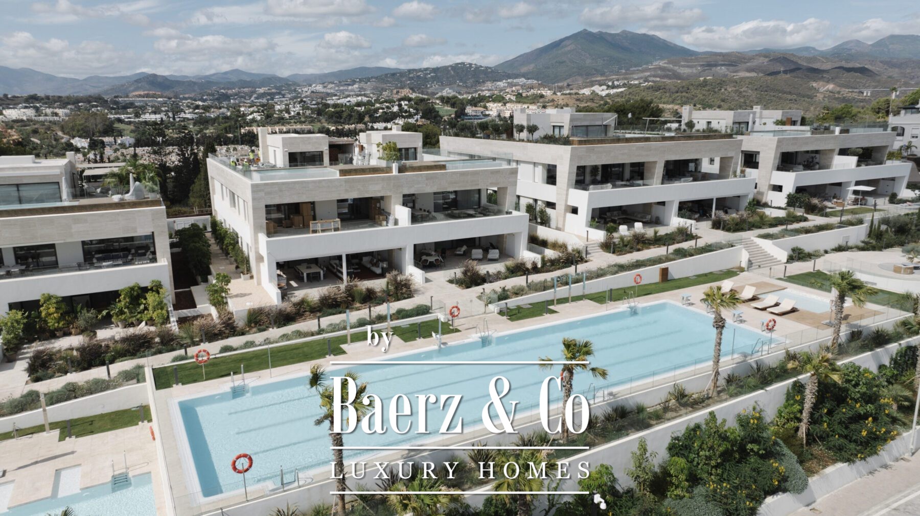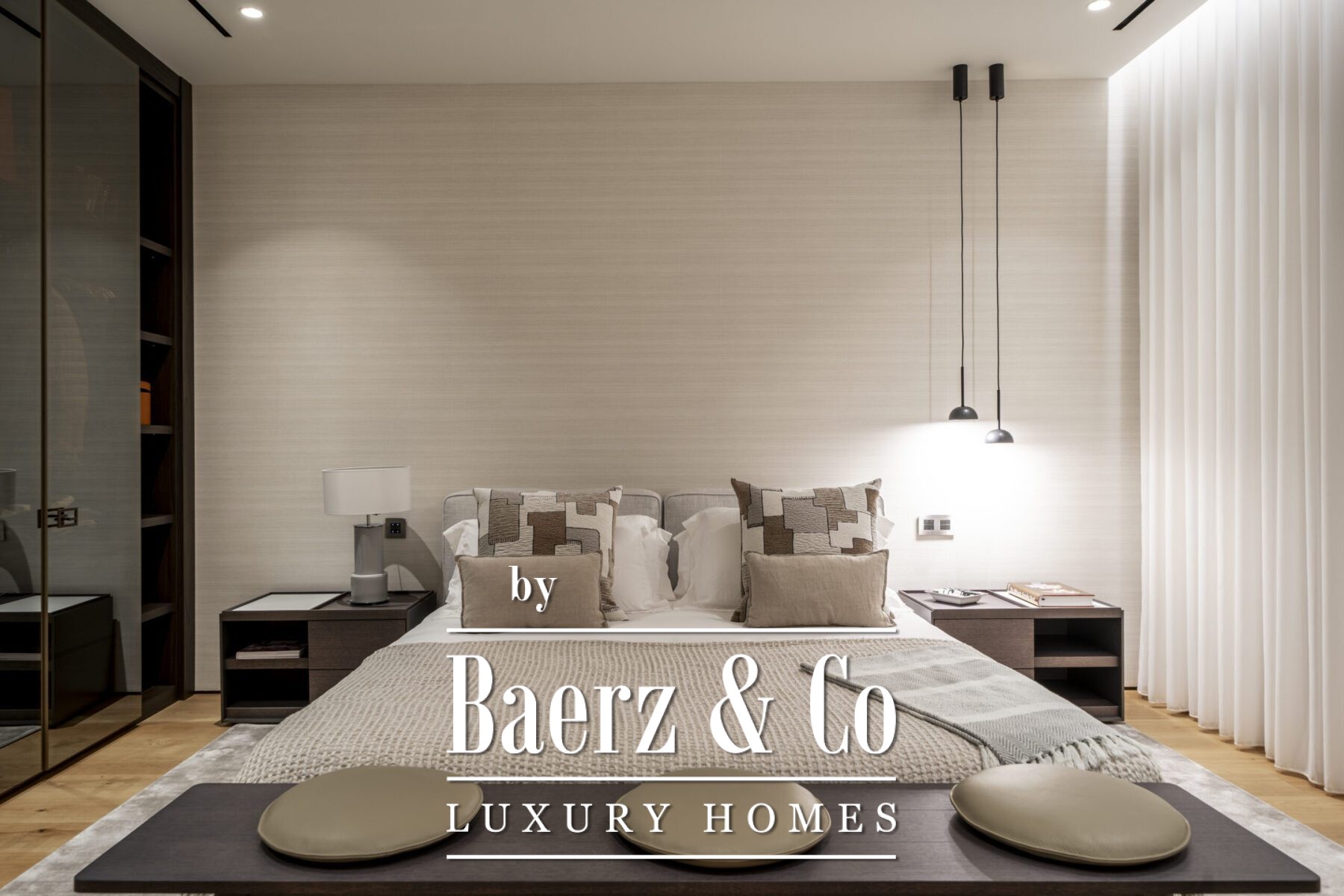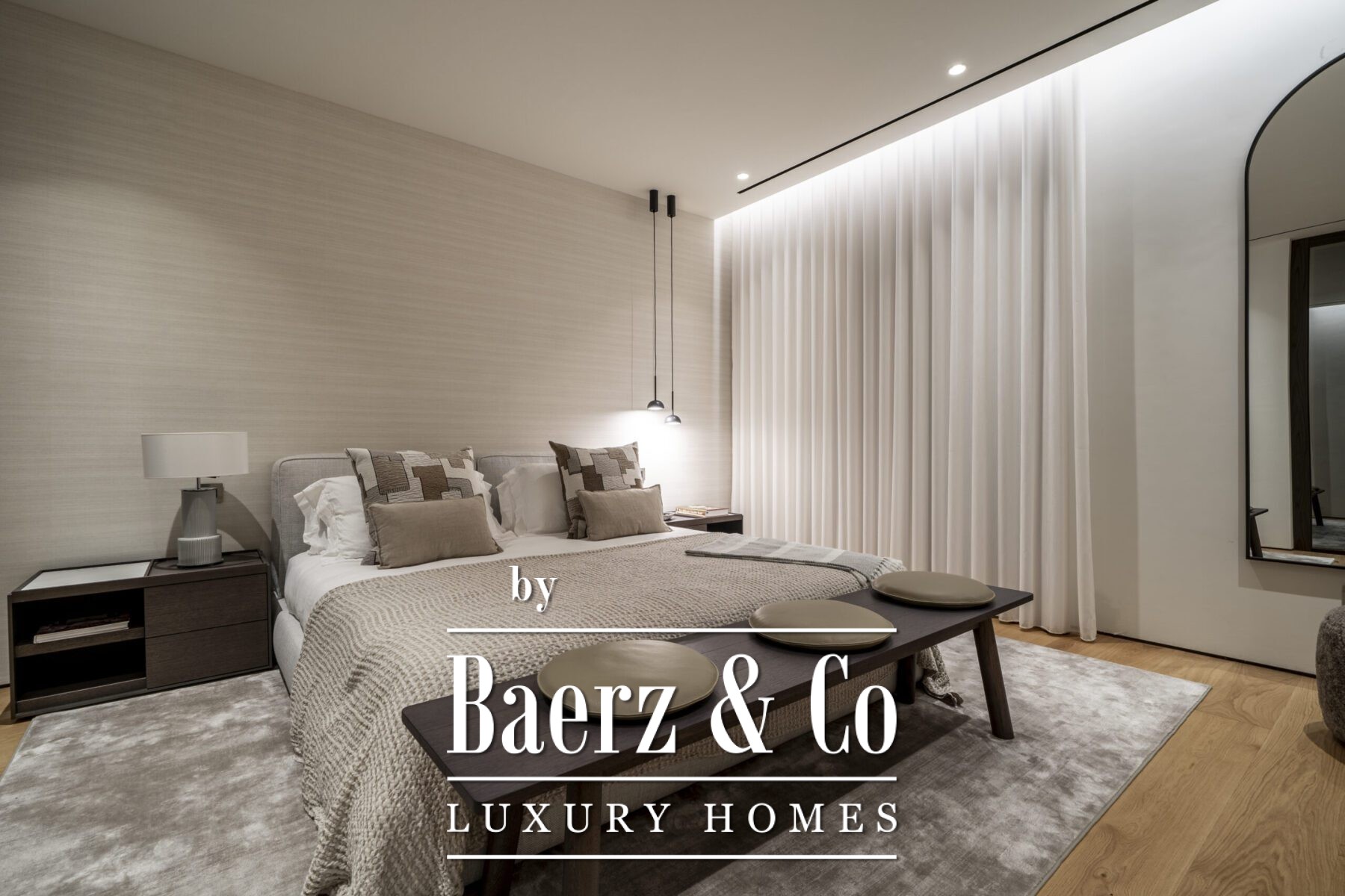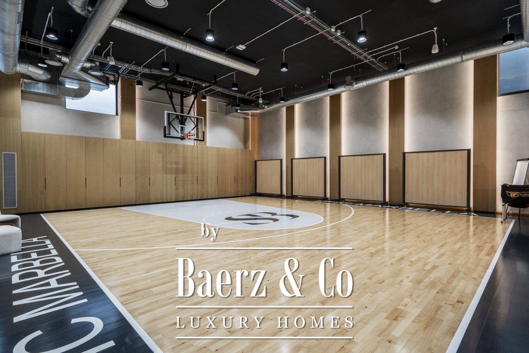 Inside, a bespoke duplex features floor-to-ceiling windows and five spacious en-suite bedrooms—three on the main level and two on the lower floor—with a separate entrance from the garage for enhanced circulation and privacy. The open-plan kitchen, seamlessly integrated with the living area, extends to a generous terrace furnished by Minotti, which includes a heated chill-out zone, a dining area, and a fully equipped outdoor kitchen. Stunning views stretch over the pool, with the Mediterranean to one side and La Concha to the other. Automatic curtains provide an added layer of seclusion.