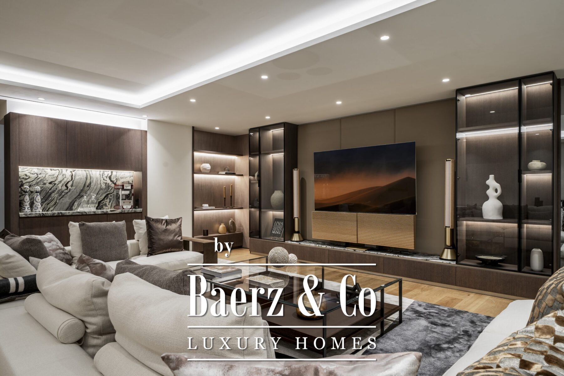 Refinement never compromises comfort. On the lower floor, a vast entertainment space features an immense sofa, Bang & Olufsen home cinema system, custom wooden cabinetry, and one-piece marble tables, creating a magnetic lounge area. This level also includes a spacious laundry, utility area, three covered parking spaces with electric charging stations, and additional storage for added convenience.