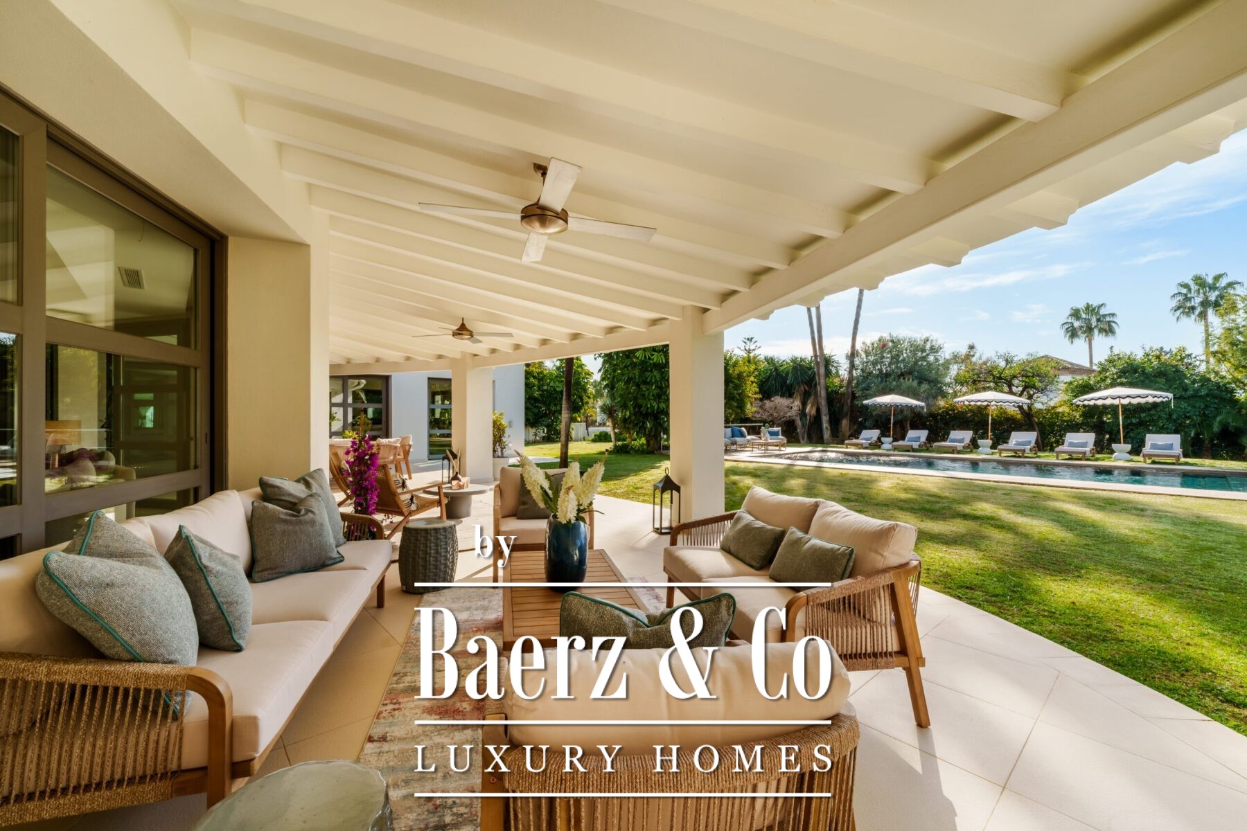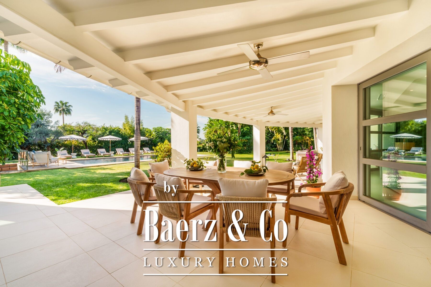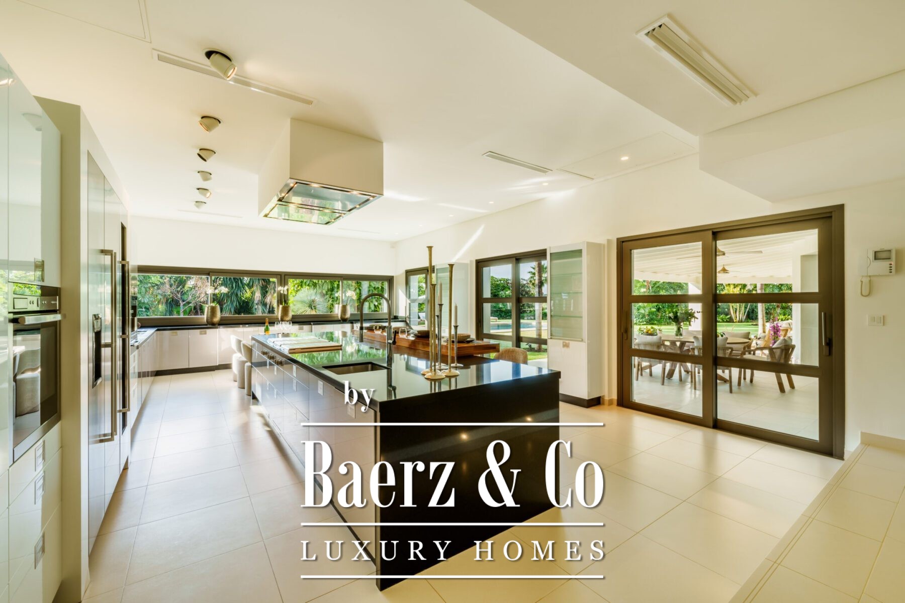 The villa features a wraparound covered terrace, perfect for year-round outdoor living. Inside, the home boasts an entrance hall with garden, a lounge opening onto the terrace and garden, a stunning open-plan professional Danespan kitchen with a large central island and 2 dining areas.