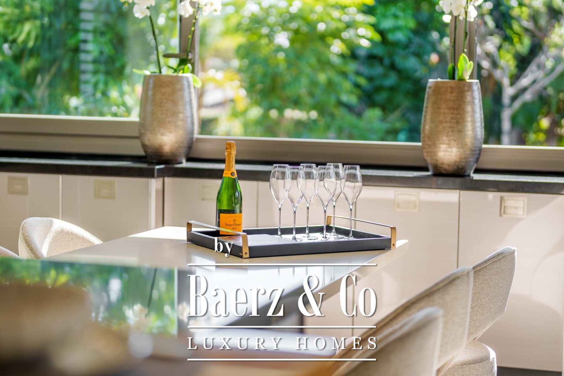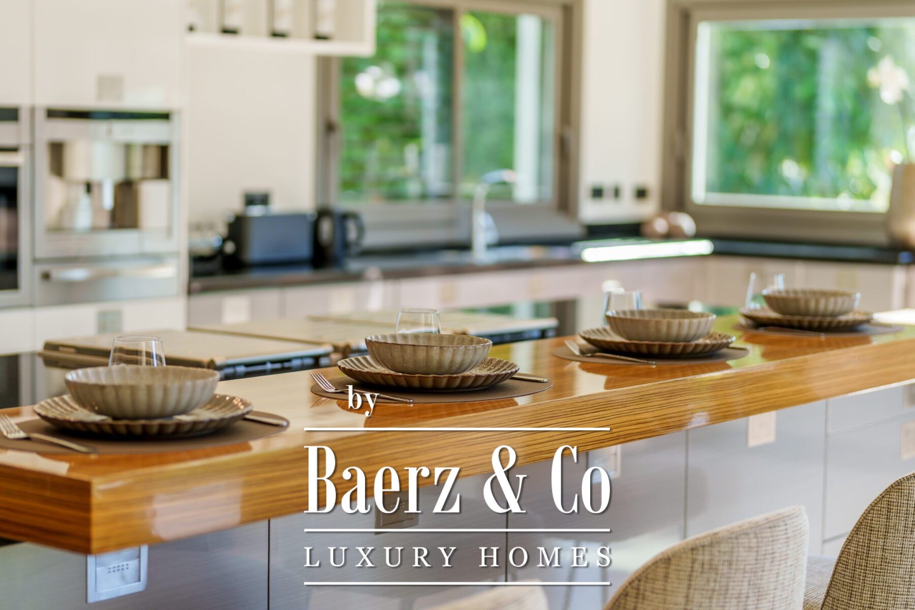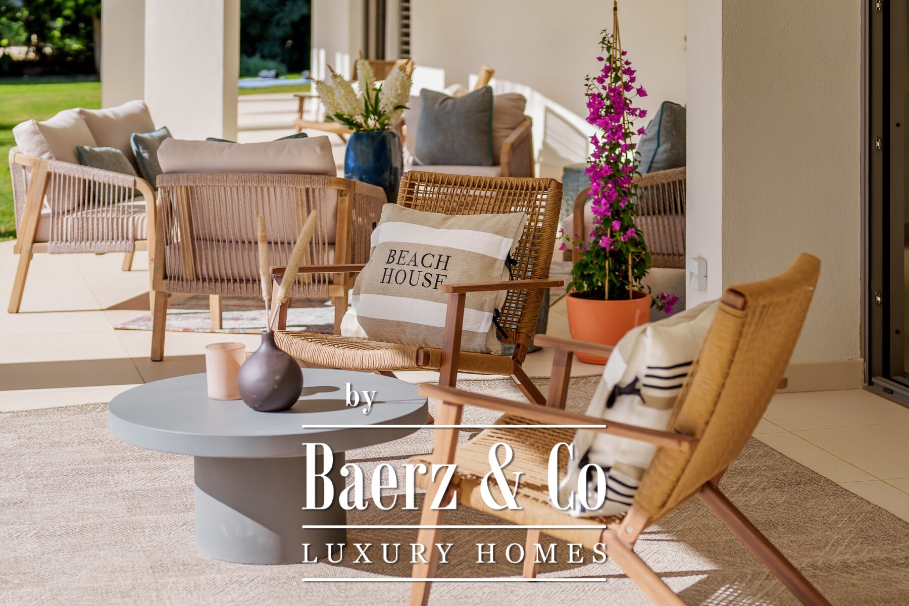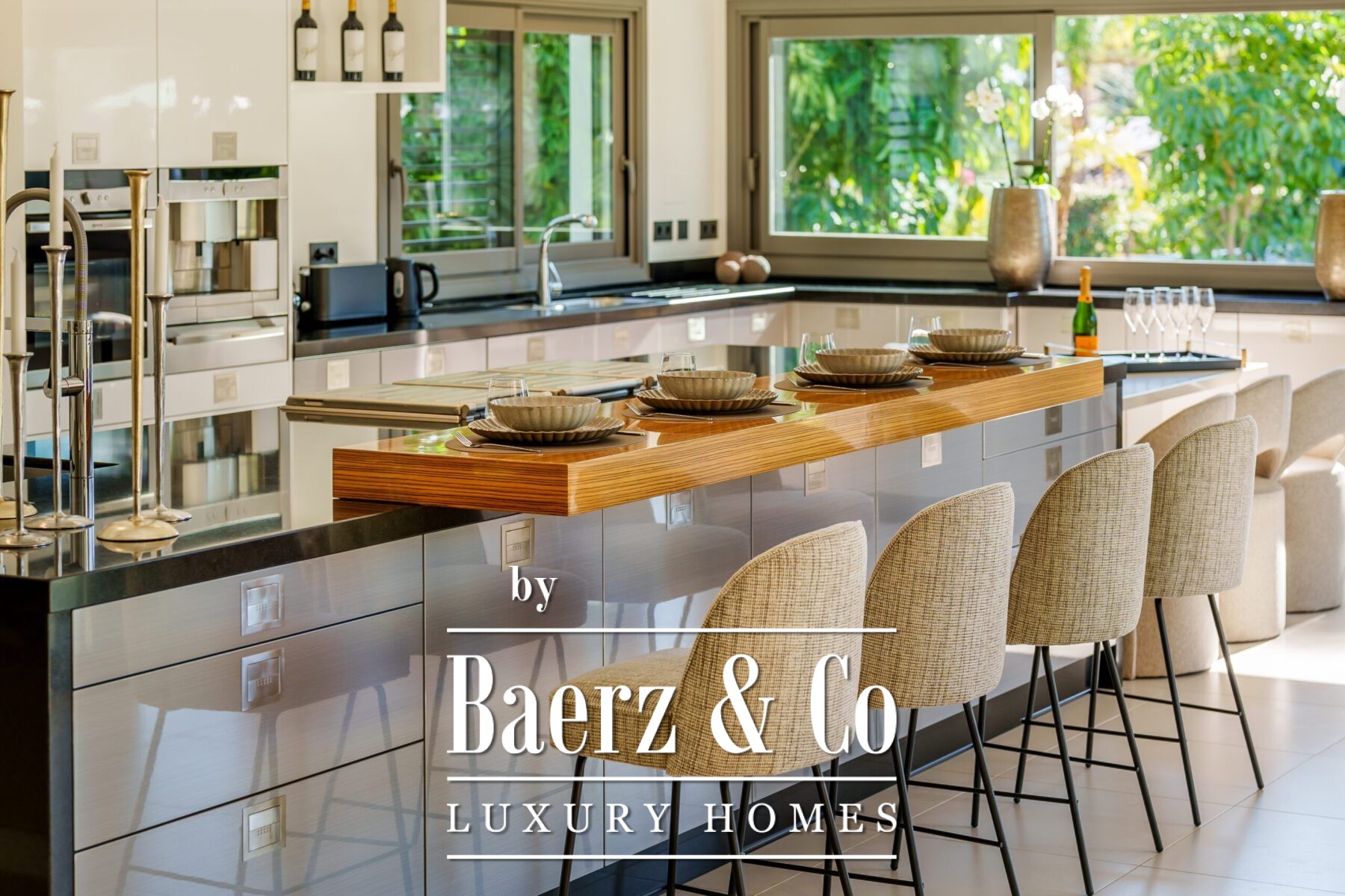 The villa features a wraparound covered terrace, perfect for year-round outdoor living. Inside, the home boasts an entrance hall with garden, a lounge opening onto the terrace and garden, a stunning open-plan professional Danespan kitchen with a large central island and 2 dining areas.