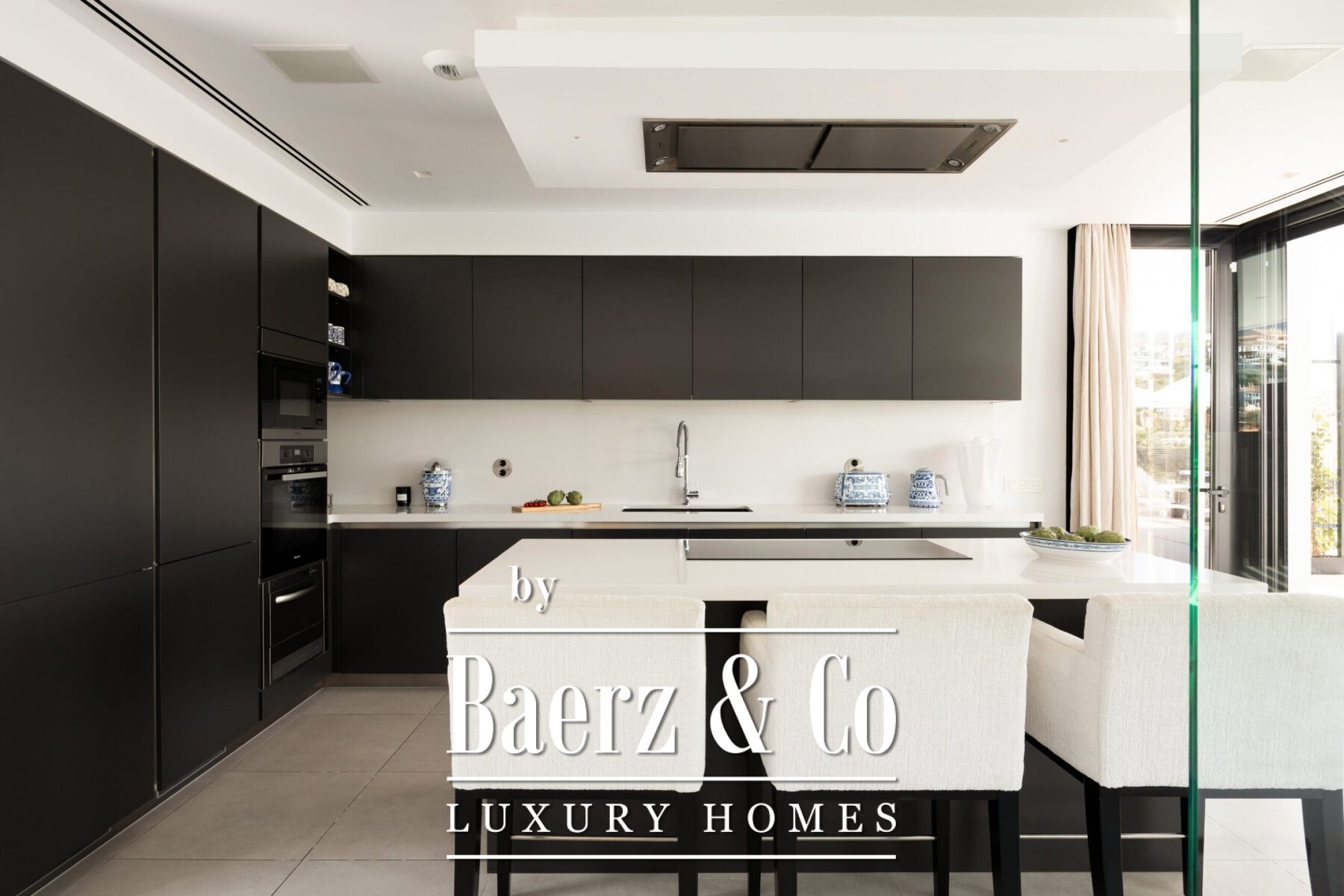 Expansive terraces extend seamlessly to an infinity swimming pool and elegant outdoor spaces, designed for both quiet relaxation and sophisticated entertaining. Floor-to-ceiling windows draw natural light deep into the interior, enhancing the open flow between the living areas and the outdoors. The open-plan kitchen, finished with premium Miele appliances, combines sleek contemporary lines with functional ease.