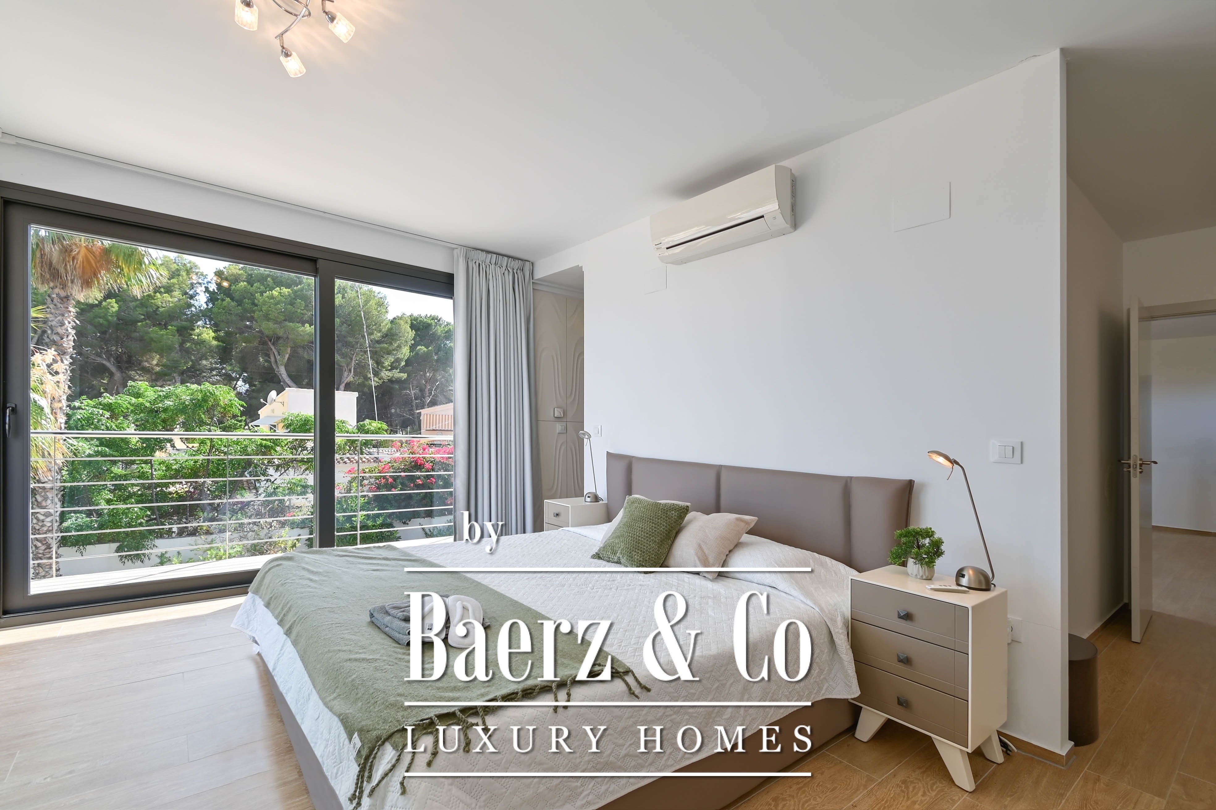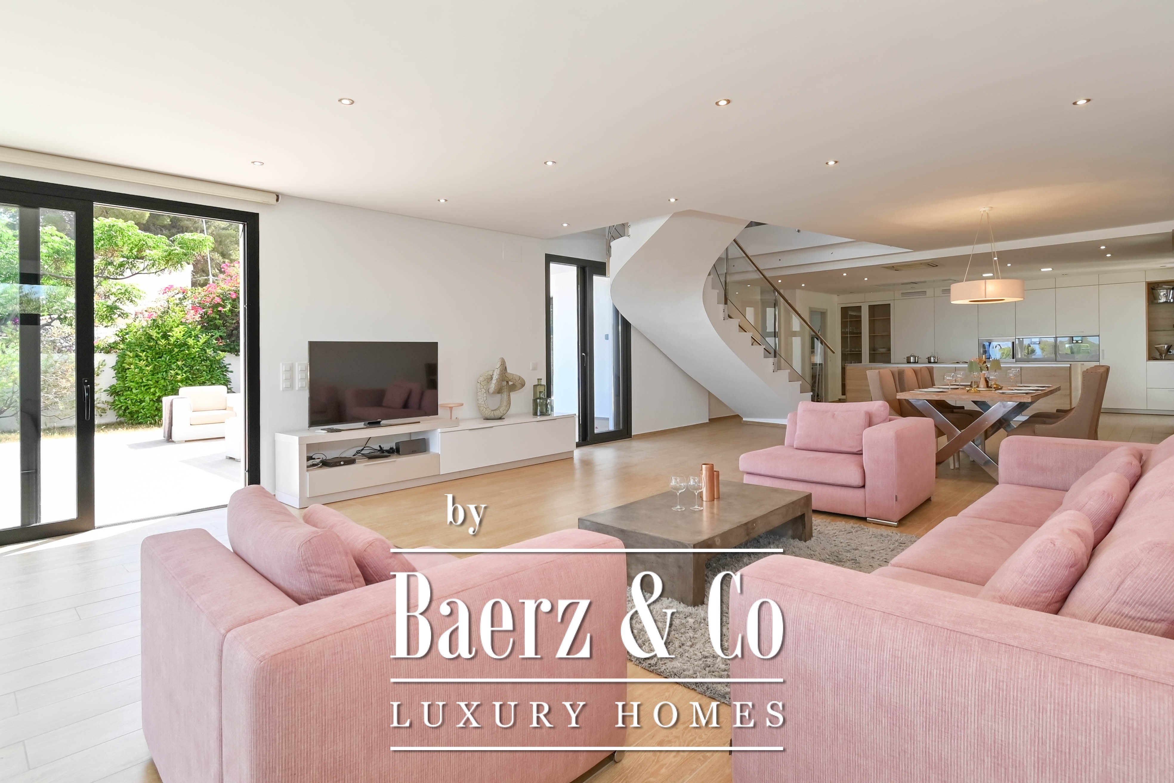 The villa features an open kitchen that flows seamlessly into the bright living area. Large windows create a natural connection between indoors and outdoors, allowing the Mediterranean light to flood in generously.