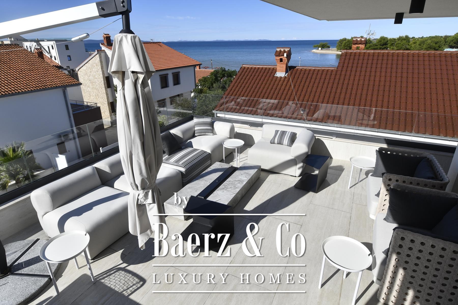Zadar, Zaton, just fifty meters from the azure Adriatic Sea, presents this exceptional penthouse - a masterpiece of contemporary architecture and design in one of the most exclusive locations. With a total area of an impressive 231.84 m², enriched with spacious terraces and a private garage, this residence offers an unparalleled level of comfort and luxurious living.When you step into this penthouse, you will be greeted by a spacious living room illuminated by natural light through large glass walls that open to the sea and terrace, creating a seamless transition between indoor and outdoor space. Discreet luxury is visible in every detail: a steam fireplace with changing flame colors, a top-notch Sonos sound system and ambient lighting create an atmosphere of peace and elegance. Handcrafted furniture perfectly complements the refined interior, while carefully selected materials promise top quality and longevity. The kitchen, equipped with state-of-the-art Miele appliances, features an elegant waterfall island with LED lighting and granite countertops - the ideal place for culinary delights and socializing.Three luxurious bedrooms are designed with an emphasis on comfort, style and complete privacy, each with a sea view. The master bedroom offers additional luxury with its own bathroom and built-in wardrobes. All bathrooms are equipped with modern Hansgrohe faucets, walk-in showers, underfloor heating and impeccable finishes, guaranteeing a spa-like experience within your own home. An additional guest toilet, a fully equipped laundry room and a functional storage room ensure maximum practicality in everyday life, making this