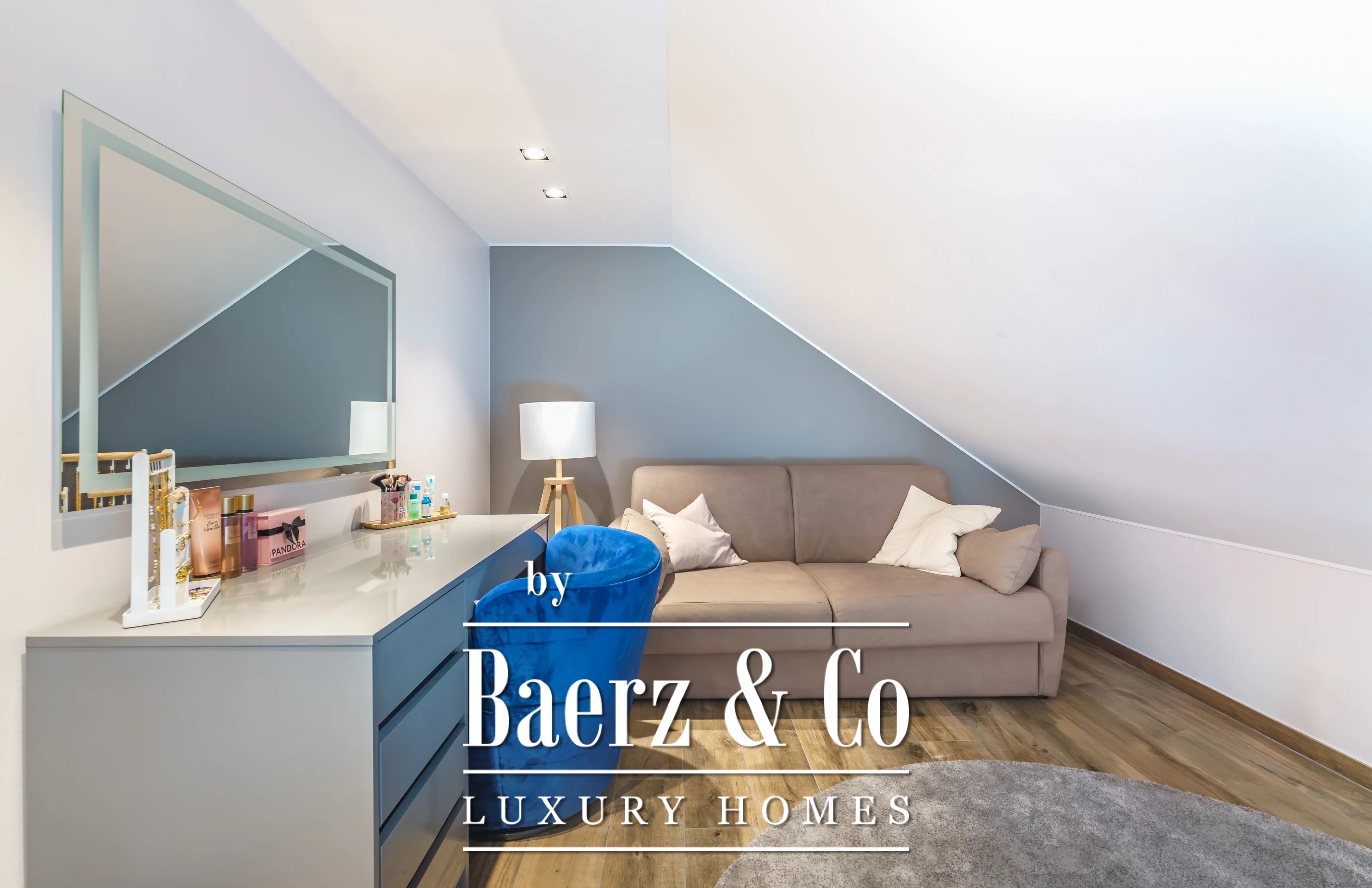 Upstairs, an additional living room creates a private retreat for family gatherings. There are five bedrooms and four bathrooms, including a master suite with a dressing room, private shower room, and a guest bedroom with en-suite. The laundry room is discreet and efficient, supporting daily comfort.